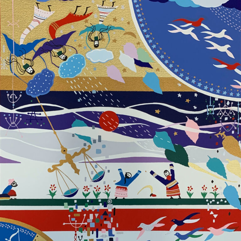 A celebration of Fall depicted with Raphael Abecassis’ beautiful colors and evocative imagery. Showing symbols from the Fall-associated astrological signs Sagittarius, Scorpio, and Libra, Fall rain shower, and other seasonal imagery.