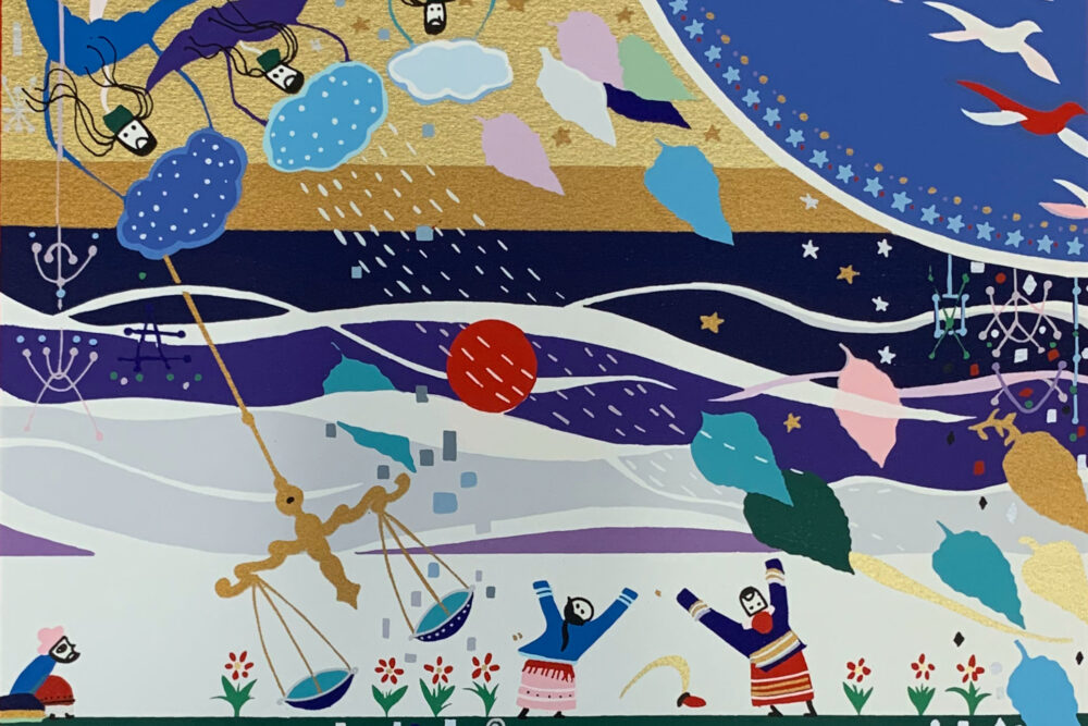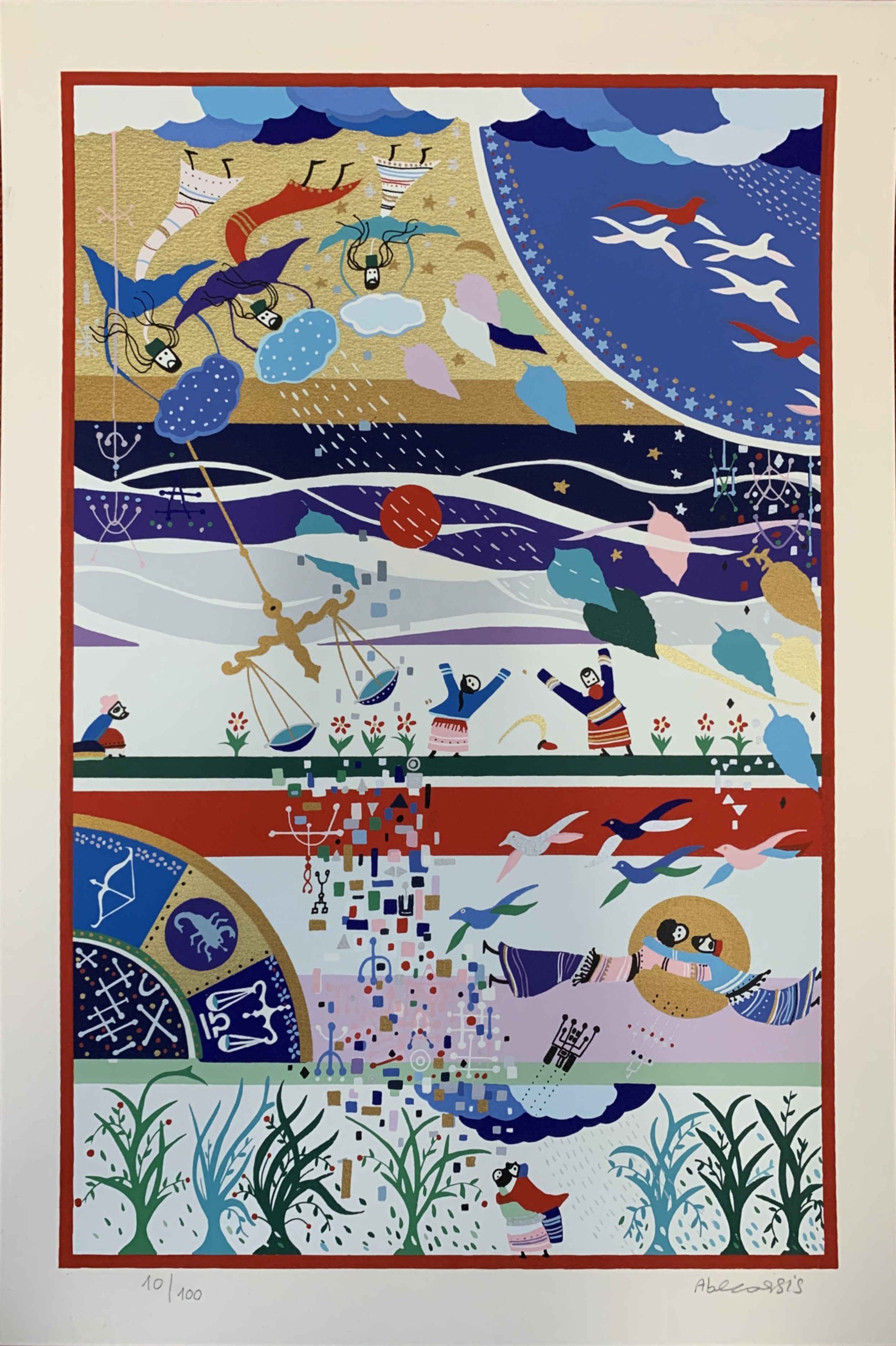 A celebration of Fall depicted with Raphael Abecassis’ beautiful colors and evocative imagery. Showing symbols from the Fall-associated astrological signs Sagittarius, Scorpio, and Libra, Fall rain shower, and other seasonal imagery.