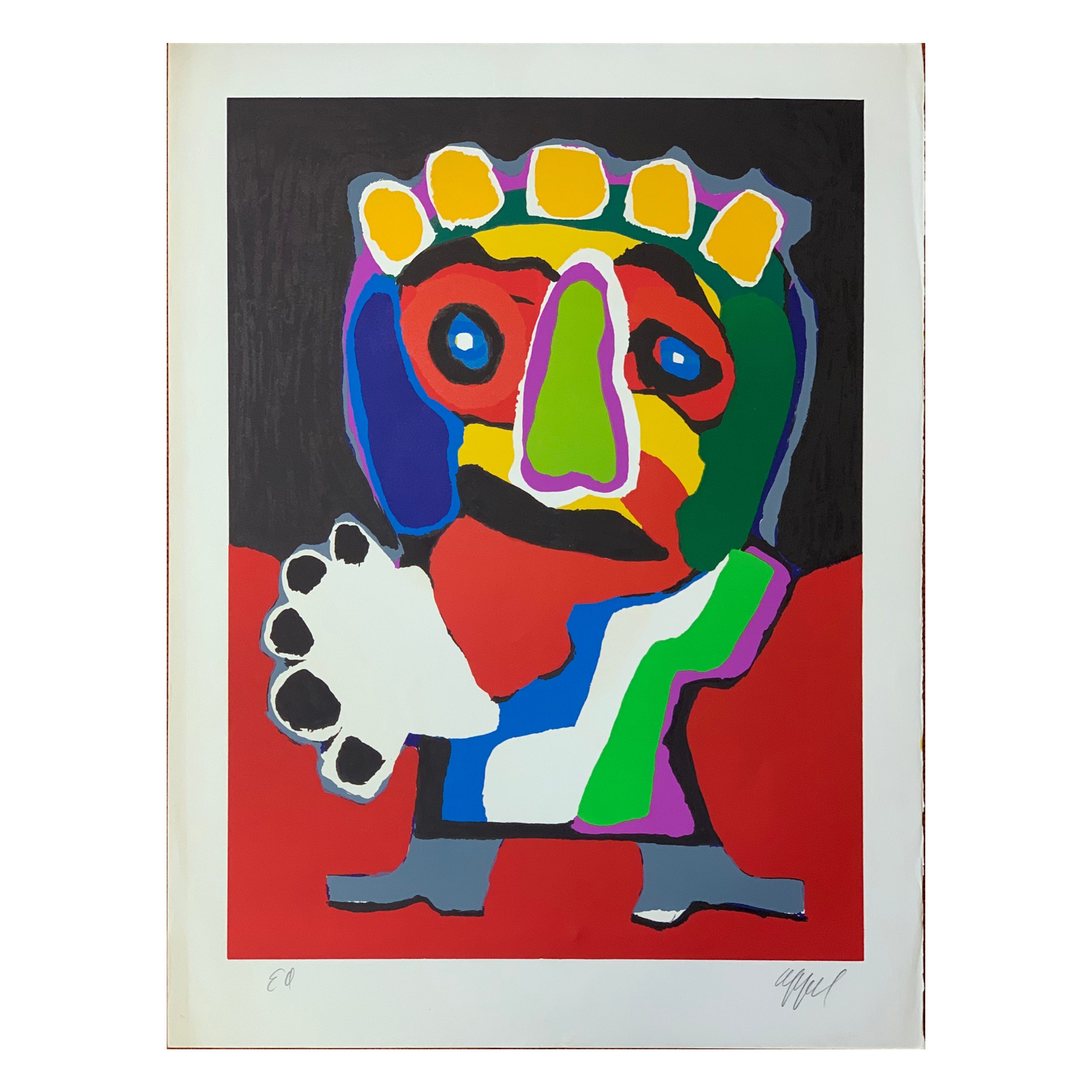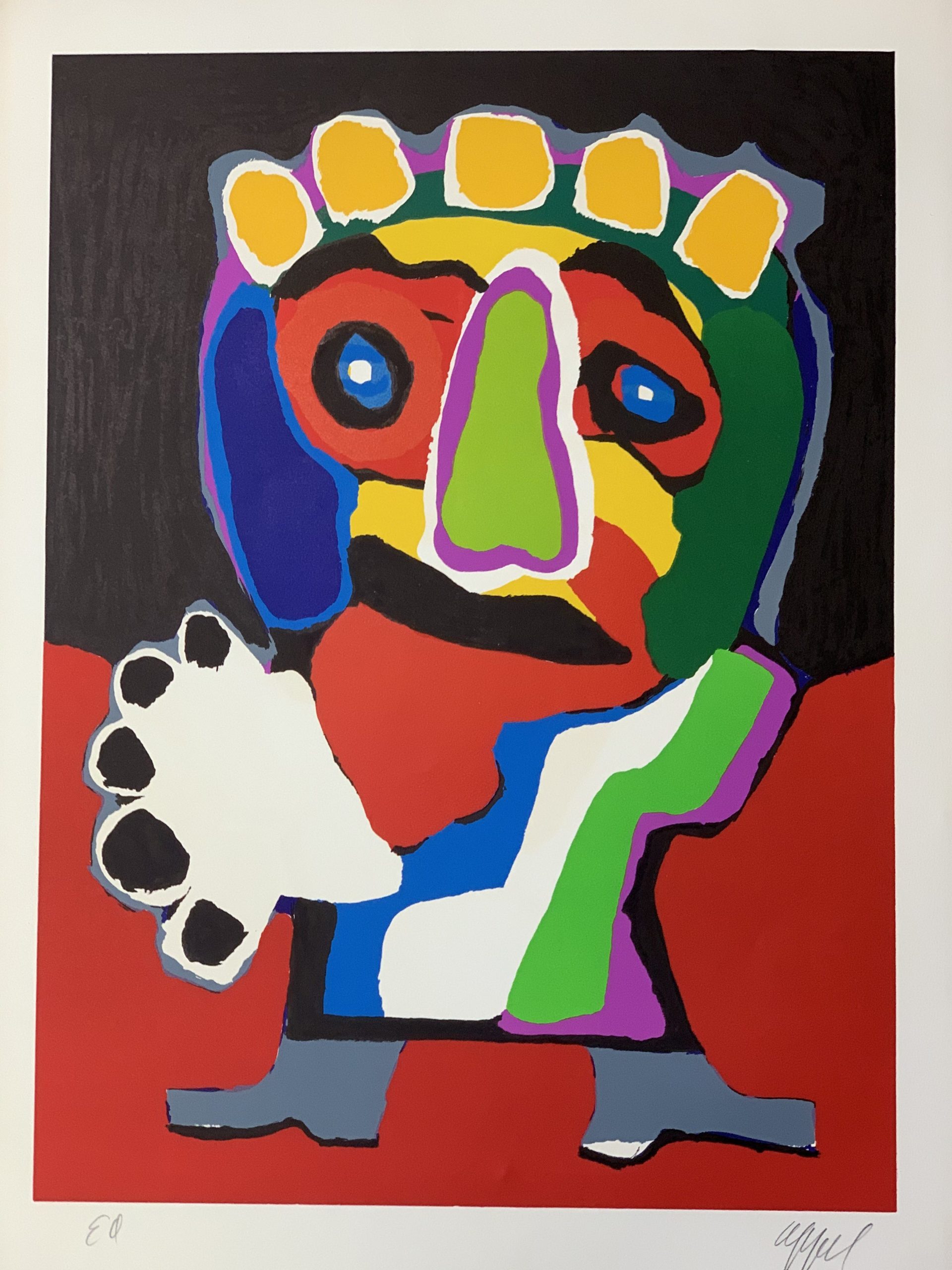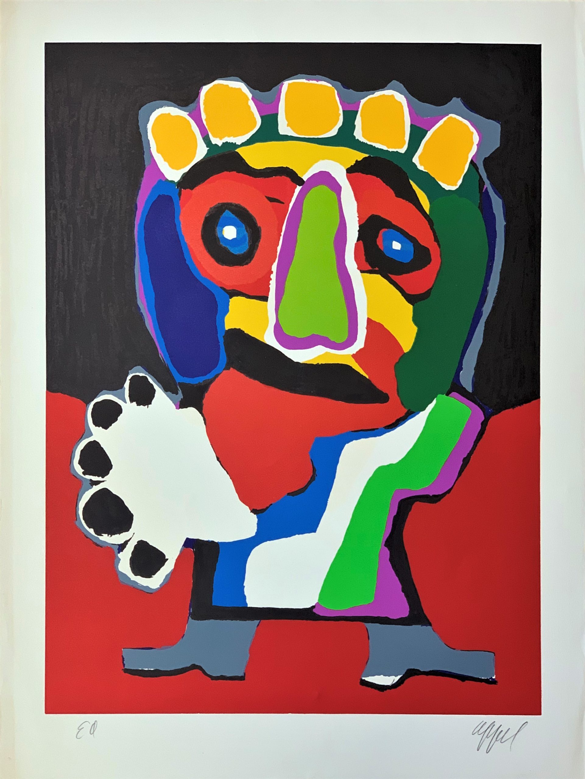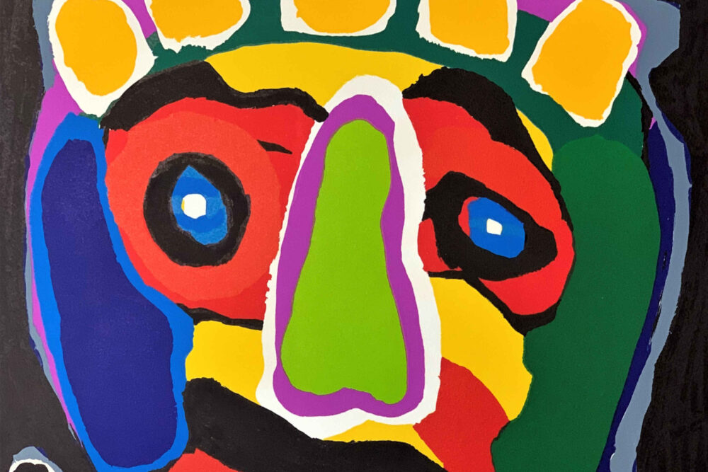 Karel Appel, a Dutch artist, was a co-founder of a group of artists known as “CoBrA”. (The name was derived from “Copenhagen”, “Brussels”, “Amsterdam”). CoBrA artists agreed that their work would focus on spontaneity and experiment. Because of that, they intentionally drew inspiration from children’s drawings. Thus, the childish nature of Appel’s work is not happenstance; it was very intentional, both because of the influence of childish thought and to express the spontaneity and experimentation of children’s art.