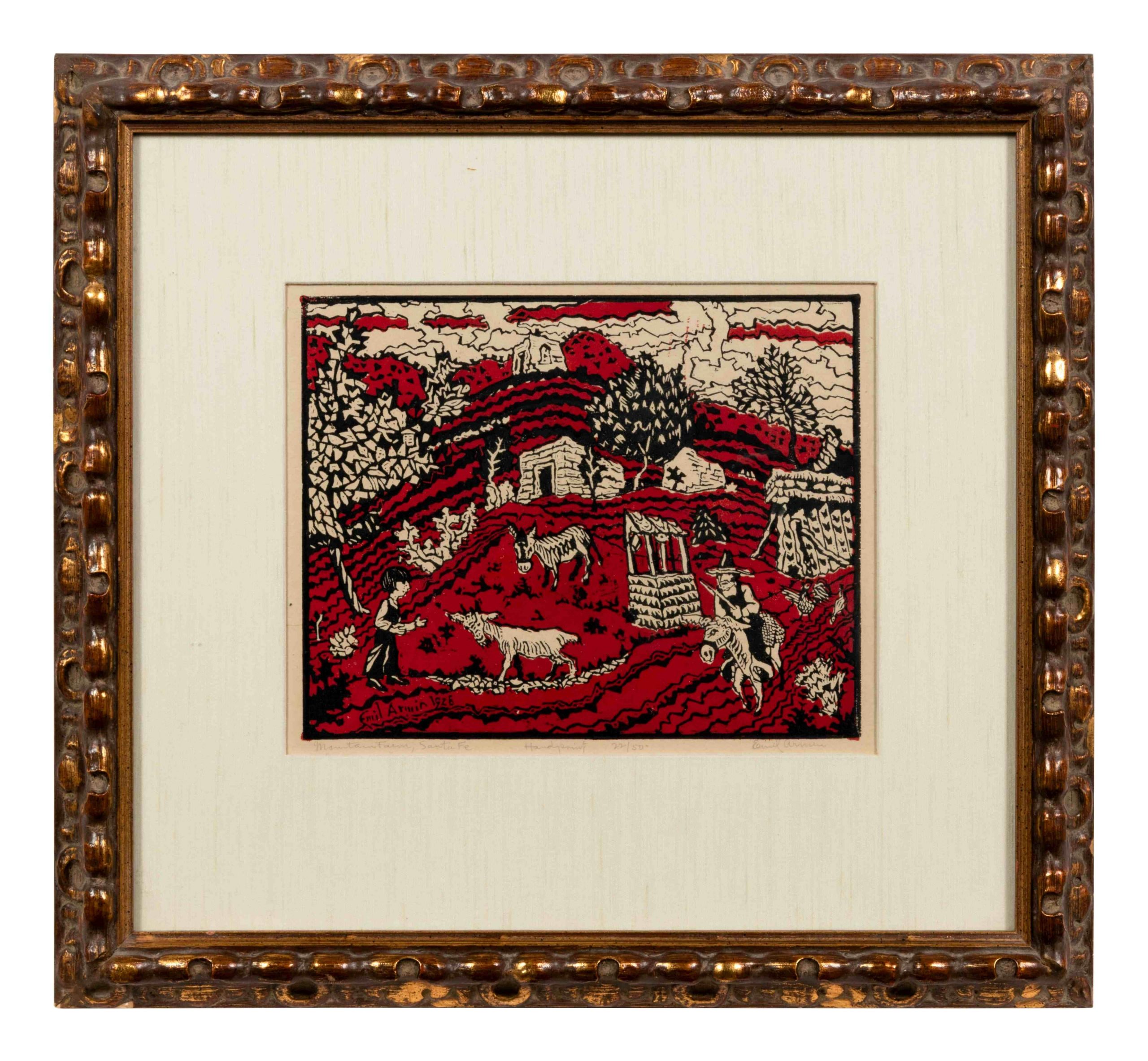 A woodcut hand-printed by the artist himself, Emil Armin, in black and red, with deep, deep colors and gorgeous imagery. From the first printing of this important print.