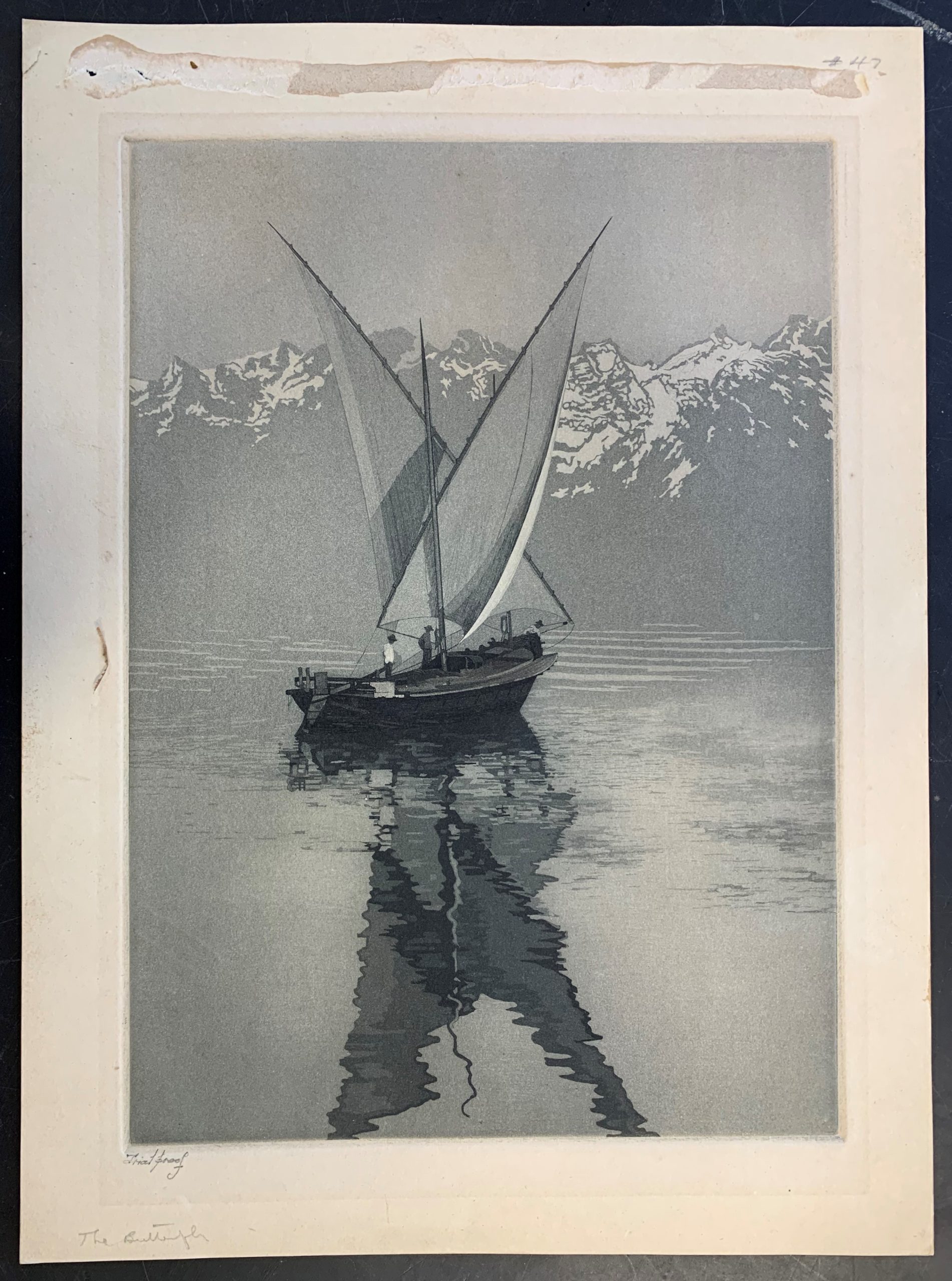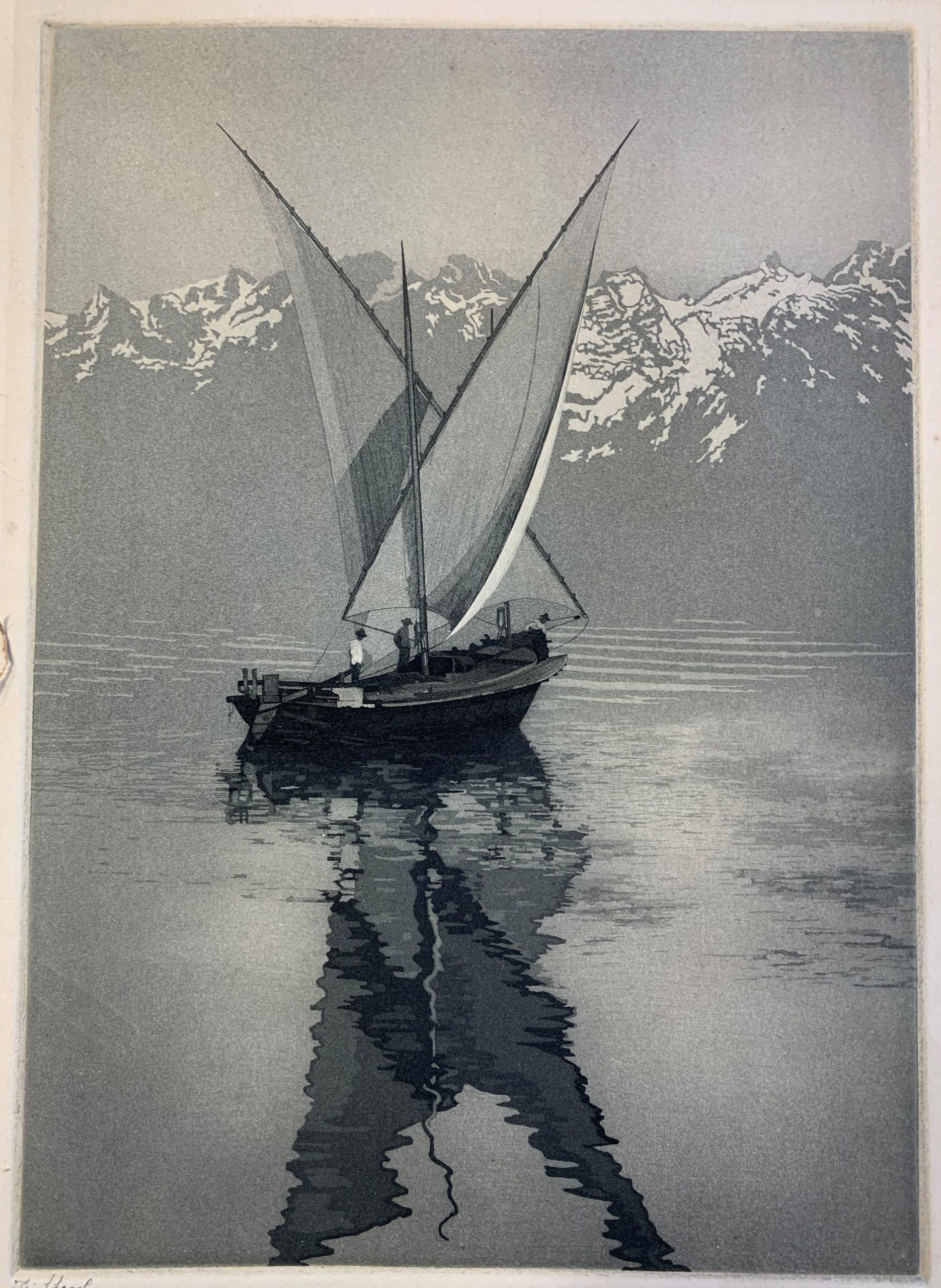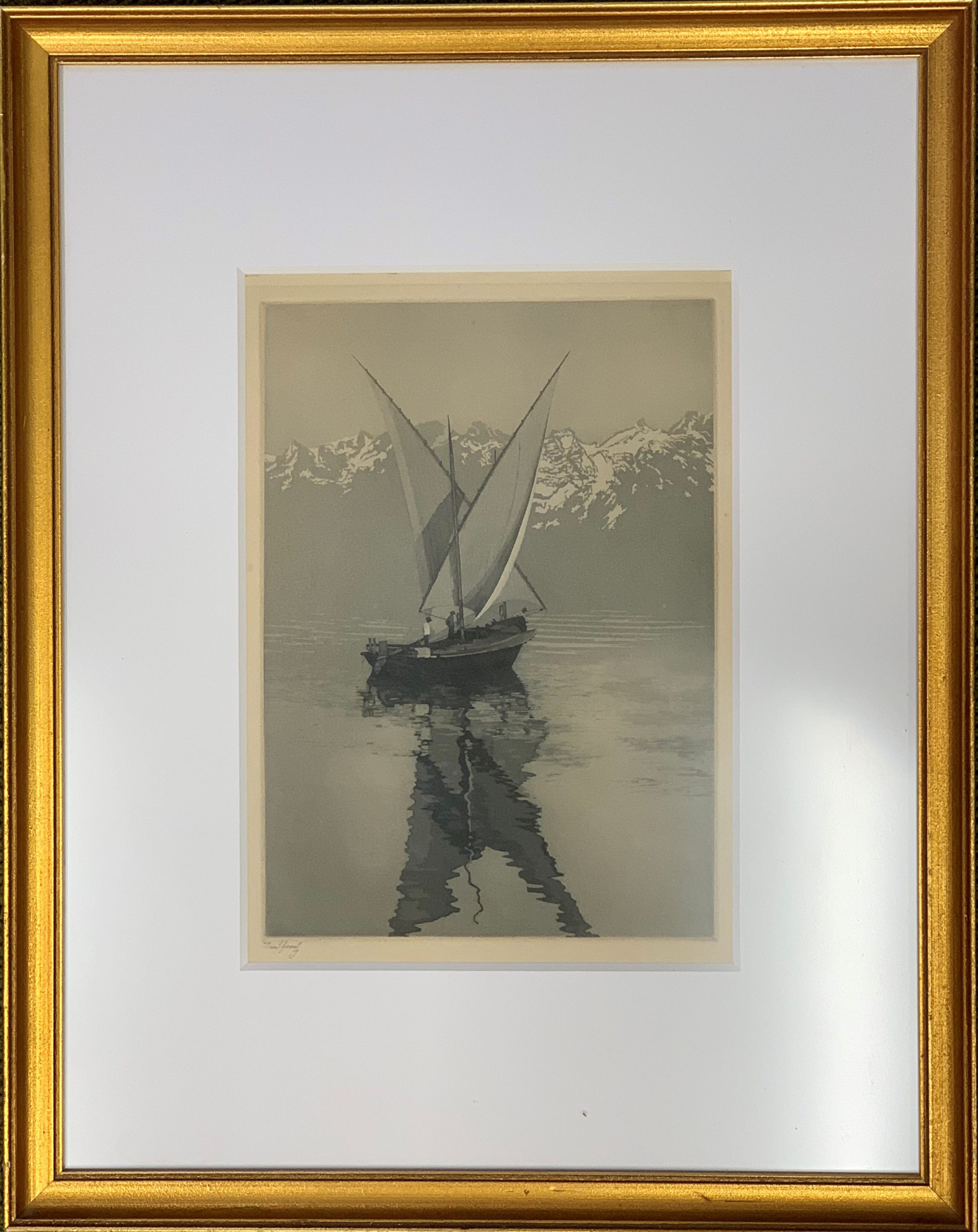 In 1919 and 1920, Arms had executed a group of prints of sailboats on calm waters with mountainous backgrounds. He used aquatint to achieve large wash-like areas. In this beautiful and refined work, line is minimal, only delineating the sailboat while subtly-graduated planes of tone suggest distance and atmosphere. Printed in color, the snow-covered peaks and shimmering waters are described with an exquisite delicacy.