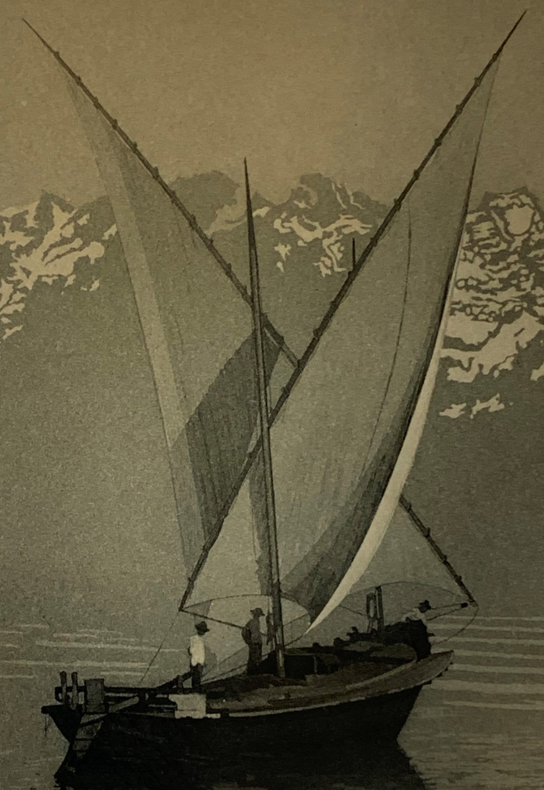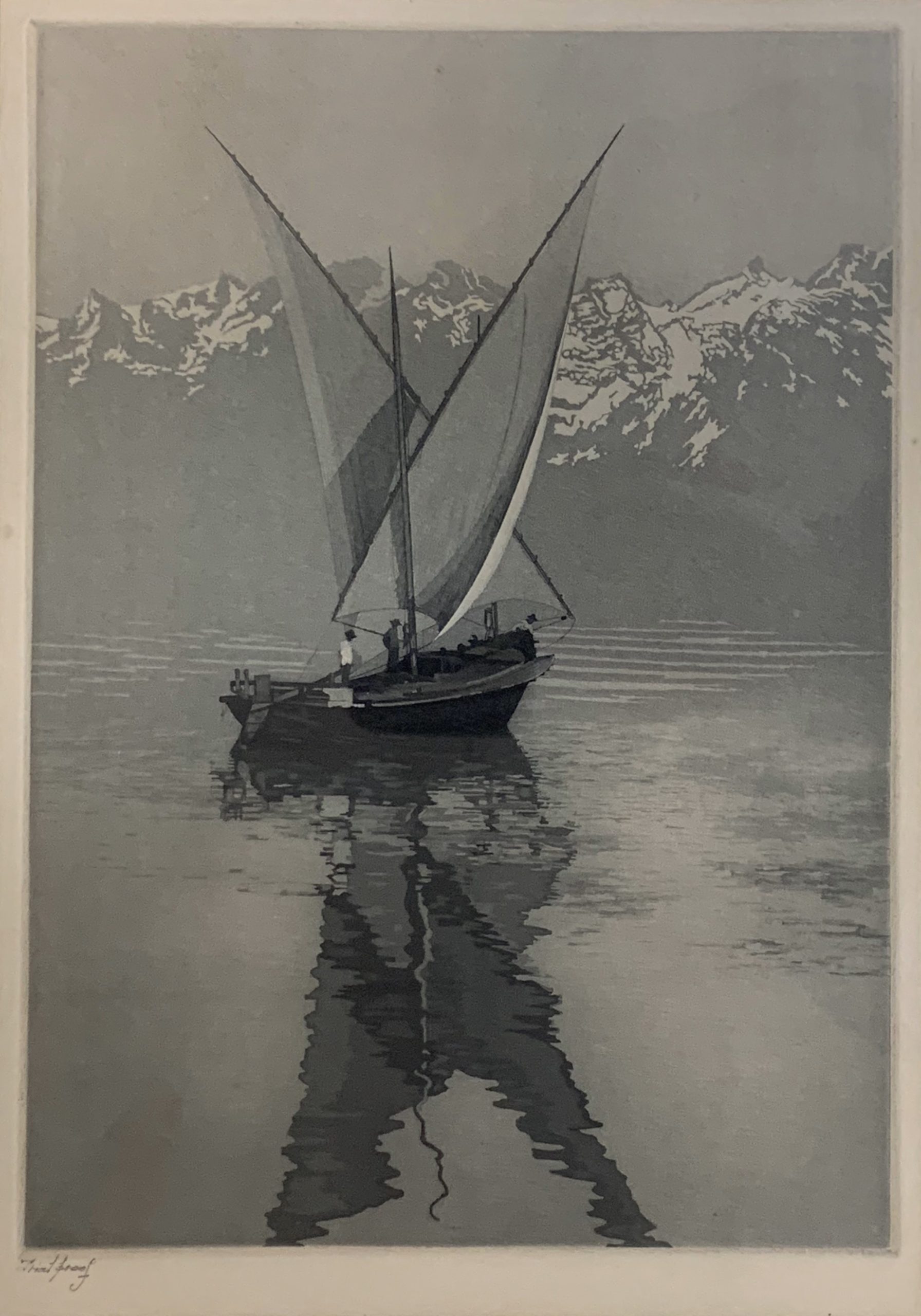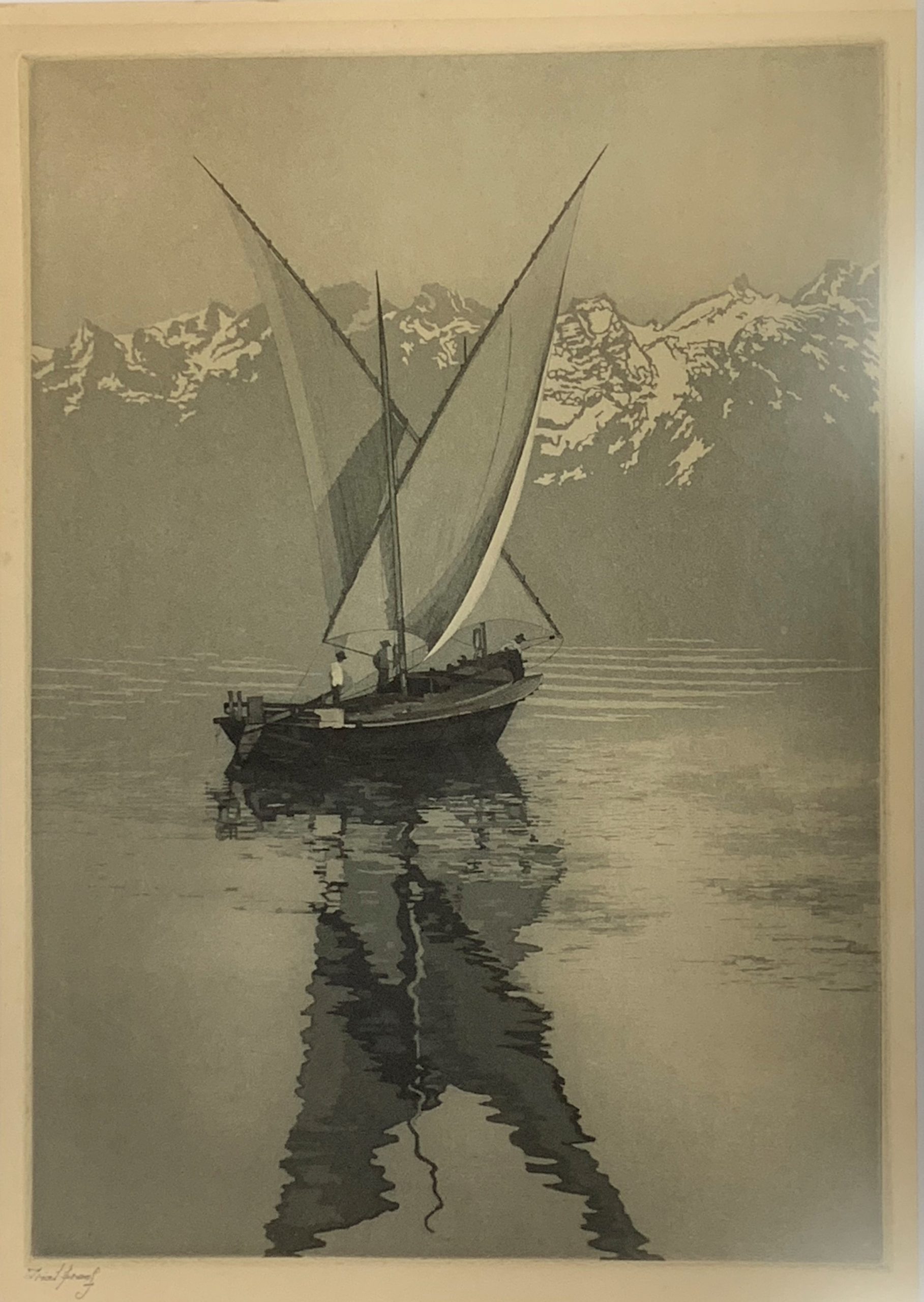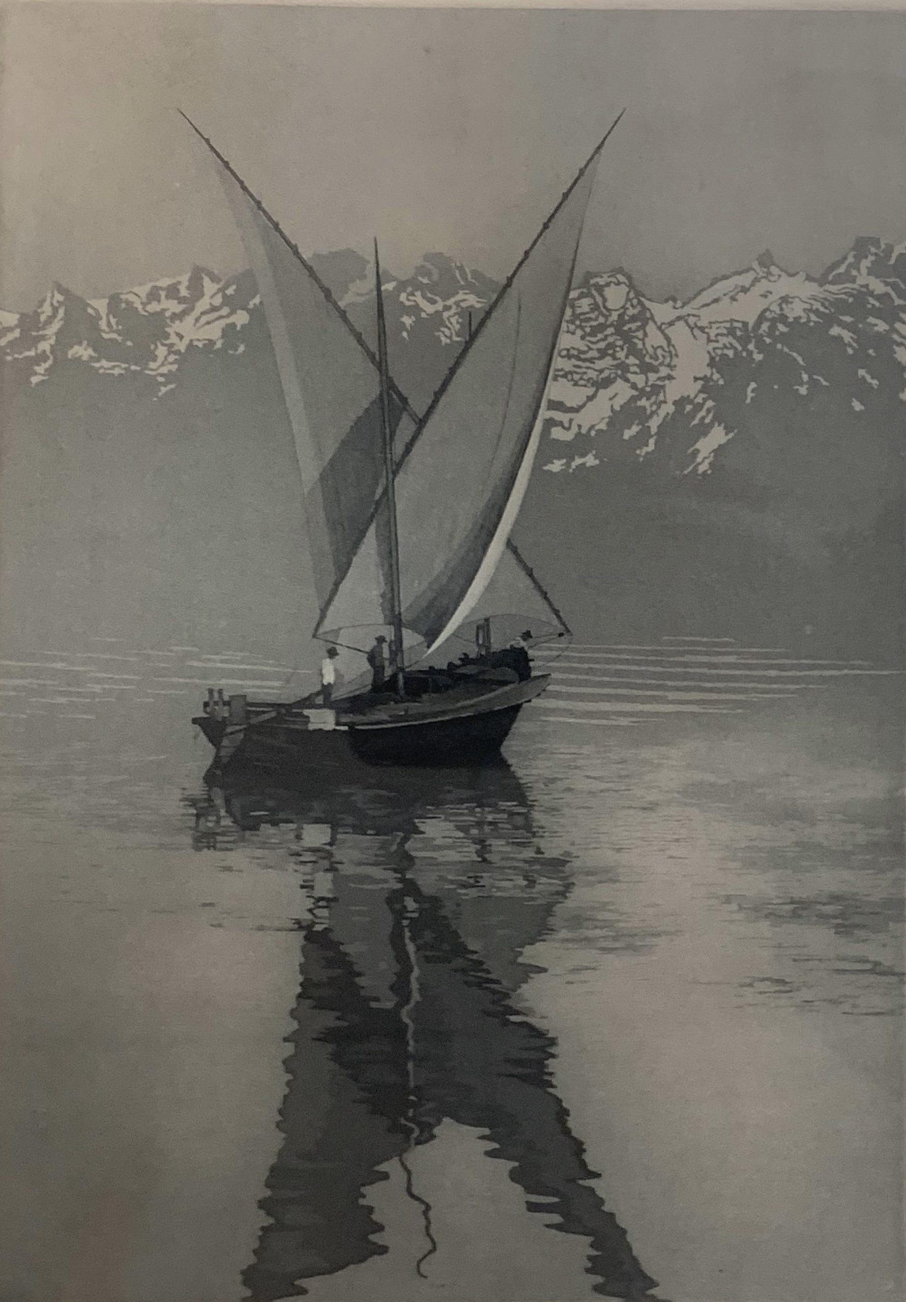 In 1919 and 1920, Arms had executed a group of prints of sailboats on calm waters with mountainous backgrounds. He used aquatint to achieve large wash-like areas. In this beautiful and refined work, line is minimal, only delineating the sailboat while subtly-graduated planes of tone suggest distance and atmosphere. Printed in color, the snow-covered peaks and shimmering waters are described with an exquisite delicacy.