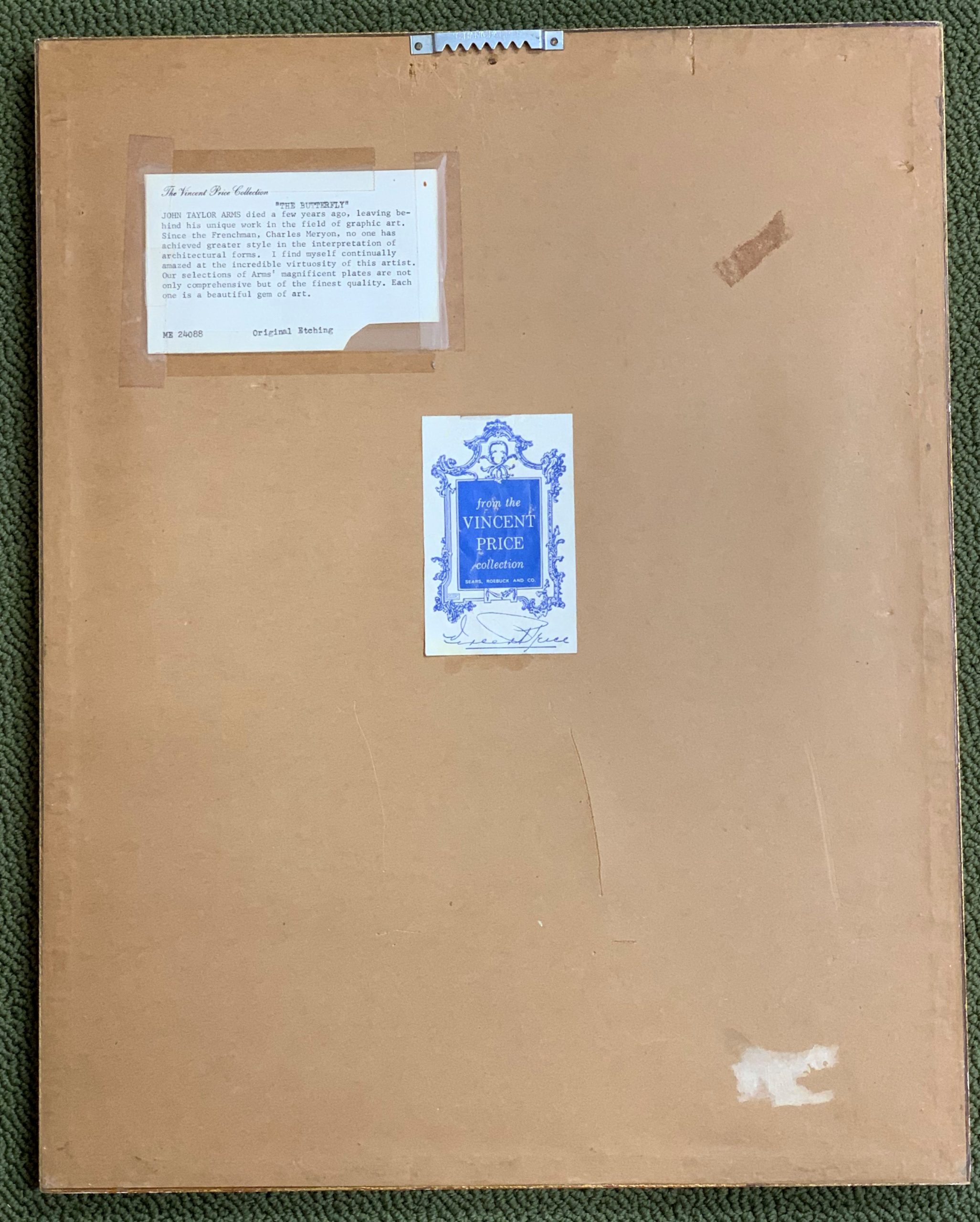 Included in the Vincent Price collection were works by John Taylor Arms, whom Price particularly esteemed. As Price wrote on a card on the verso, “I find myself continually amazed at the incredible virtuosity of this artist.” Arms’ etchings were wondrous creations, produced with sometimes 1,000 or more hours’ work using fine-gauge sewing needles set into wooden handles and viewed through magnifying glasses. He was a gifted draftsman and technical virtuoso who created compositions full of keenly observed details and nuanced light. Arms is regarded as one of the world’s finest print-maker for good reason. A 1952 article in the New York Times described Arms as “the dean of American print makers”.
