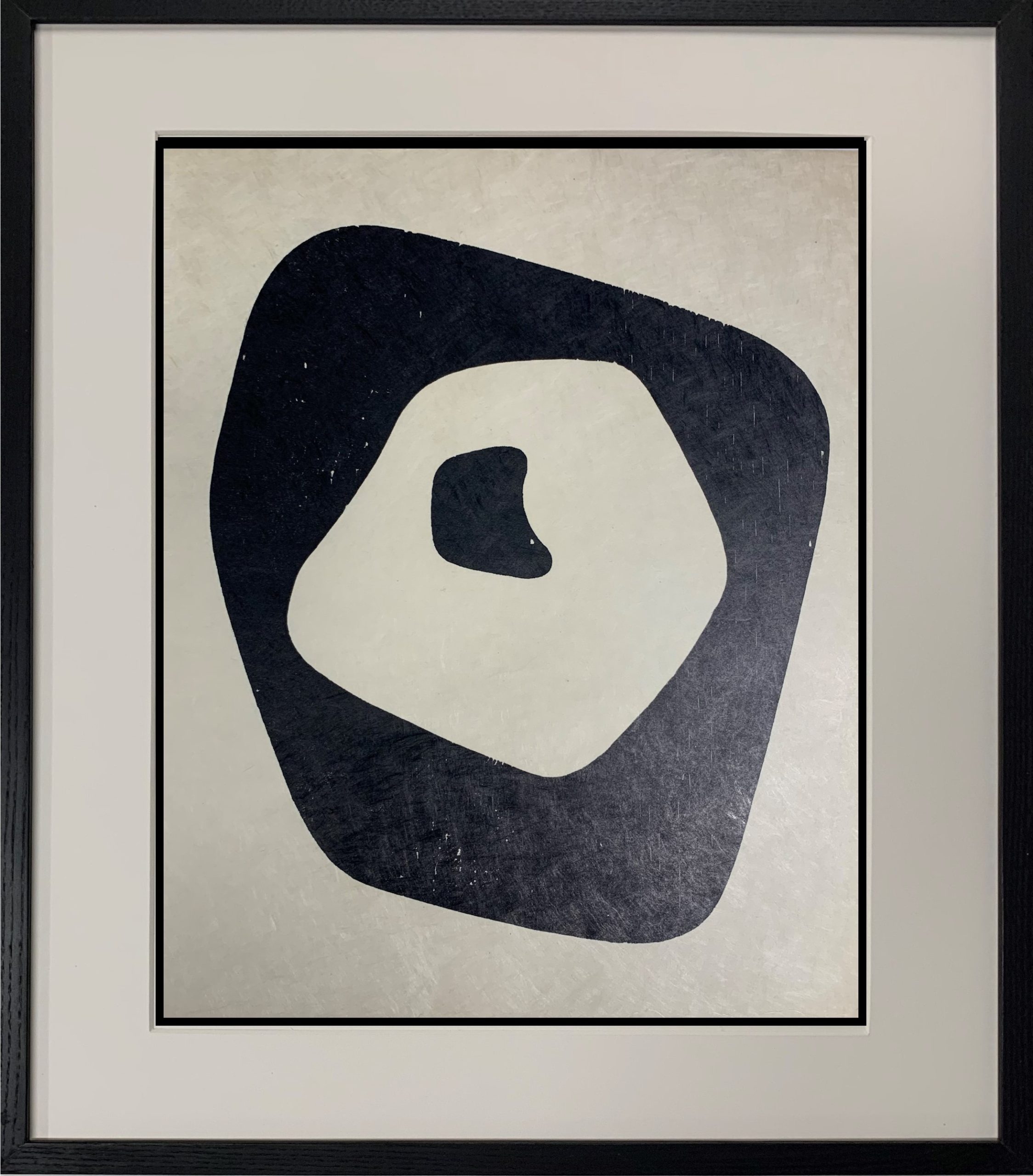 Custom framed in black-stained Ash behind 99% UV-filtering Plexiglass.  All conservation materials. Please note that this work was reframed after photographing. It was put in a larger frame to create a wider bottom margin to better present the picture.