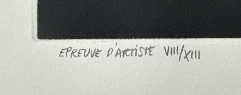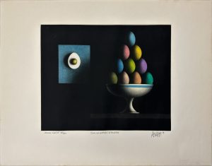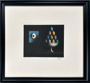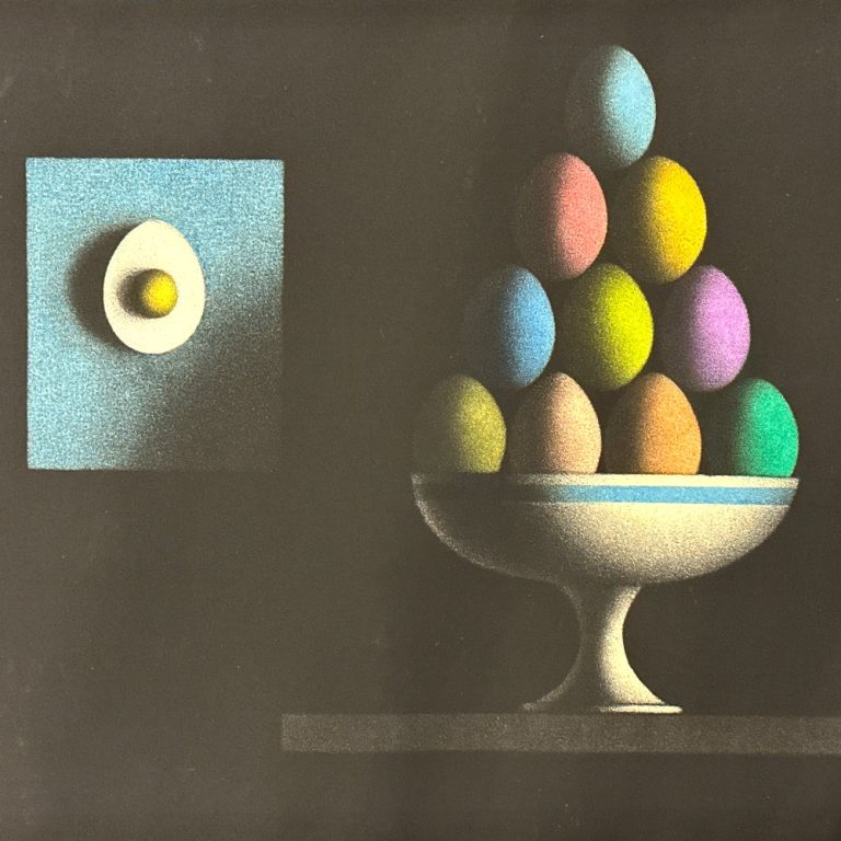 This beautiful mezzotint was printed using two copper plates for the colors and a third copper plate for the black. It was printed in four states. In the first, the yolk of the egg was black. The second state, of which a single print exists, fixed that problem. This impression is from the third state, of which Avati printed 34 impressions (12 sample prints, nine trial proofs, and finally the 13 final proofs, of which this is the eighth. The fourth state was then produced in an edition of 65.