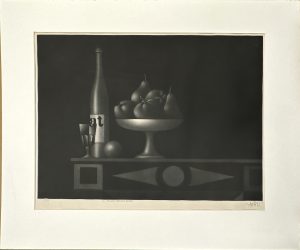 A beautiful mezzotint of a still life (wine bottle, a goblet and a fruit basket) by Mario Avati, one of the greatest masters of mezzotint.