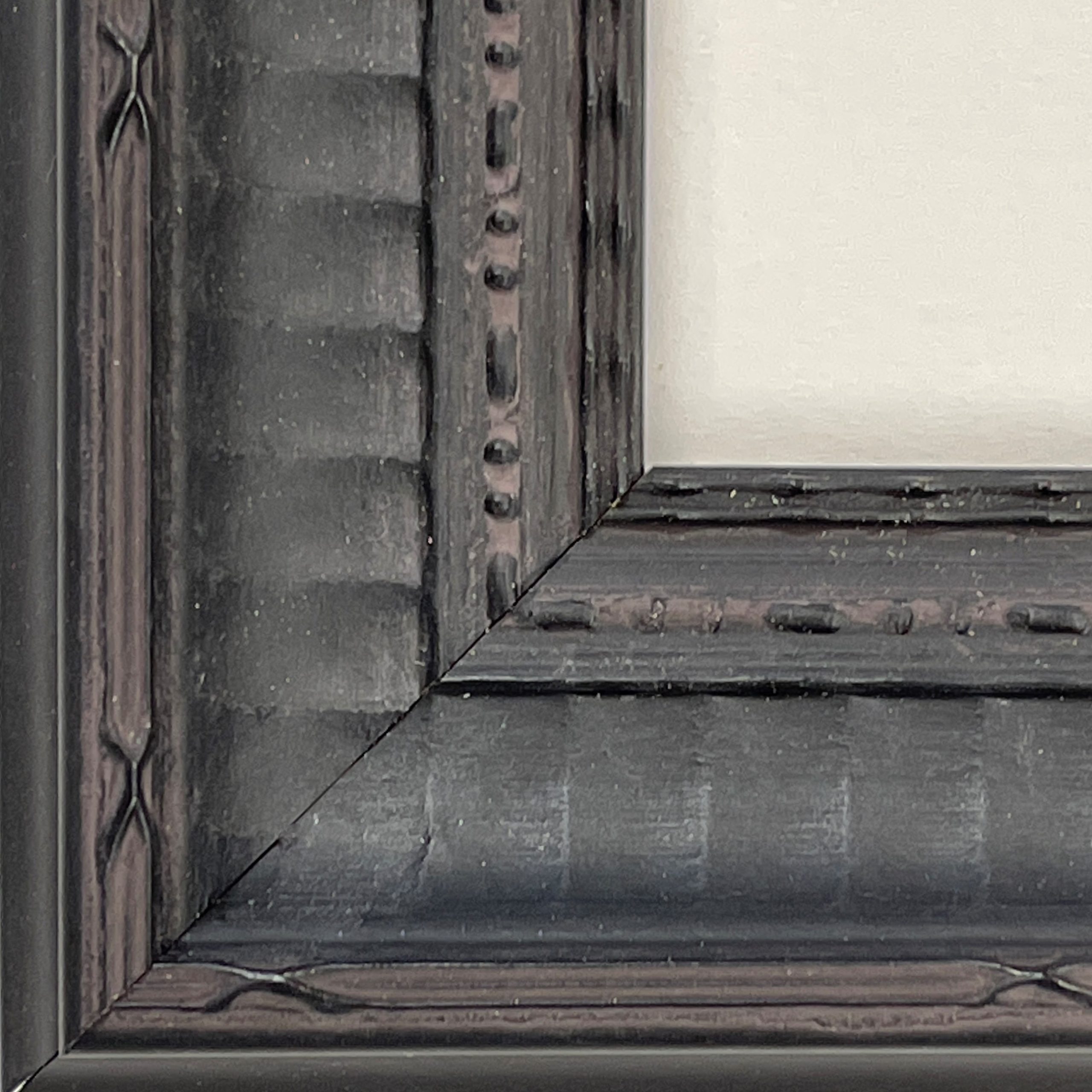 Custom matted with an 8-ply mat and framed in a decorative black-painted wood frame behind 99% UV-blocking art glass using strictly conservation-grade materials.