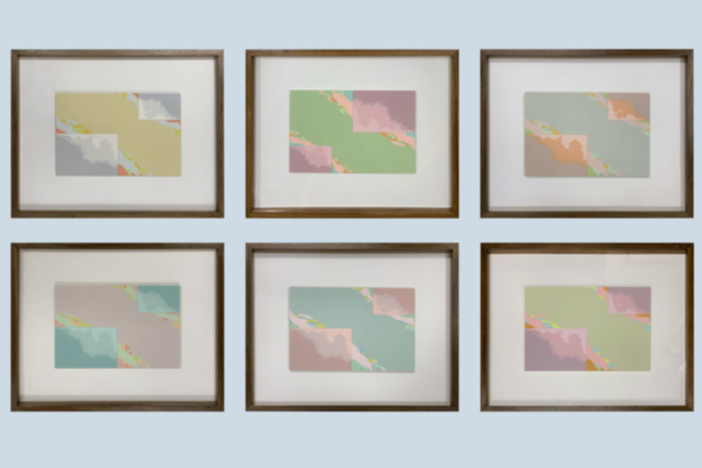 “As a series, the prints represent a rich exposition and exploration of color. Individually, the color employed plays an extremely important role as each print delicately juxtaposes graphic and linear qualities with painterly concerns. *** Organic forms, in matte, chalky, shades of paste blue, pink, yellow, and green float across the larger rectangular grey-green background. These cloud-like shapes of the background are definitely painterly, but the flat matteness of their color insists on their graphic quality and creates a rigorous ambiguity which sets the forms of the background into motion. This movement is further intensified by the presence of the die-cut, mauve-pink corners. The die-cutting creates a linear edge which separates and juxtaposes the glossy painterly corners from the matte graphic background.