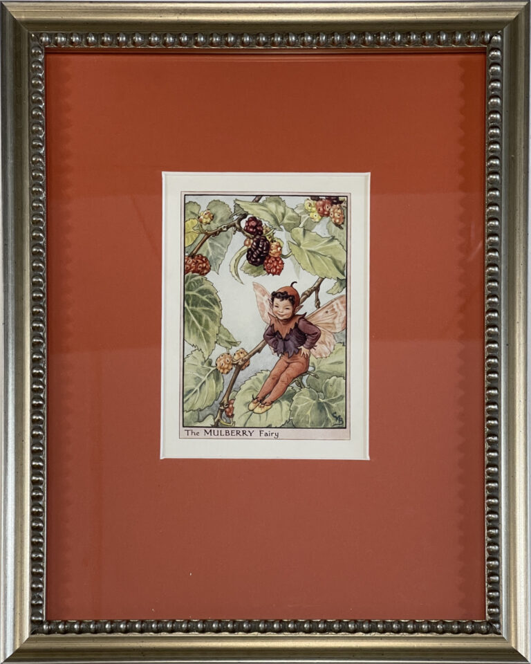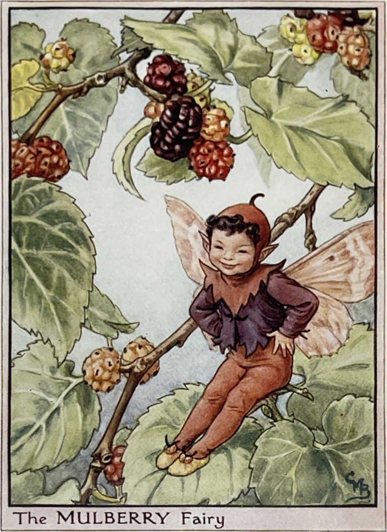 Cecily Mary Barker’s charming illustration of the adorable and tiny Mulberry Fairy, who drips purple juice all over his shirt as he enjoys the berries, rarely seen but essential to the happiness and the health of the tree.