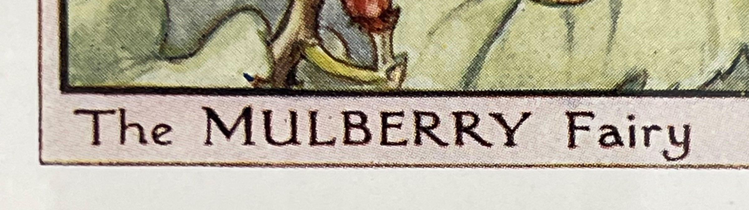 Cecily Mary Barker’s charming illustration of the adorable and tiny Mulberry Fairy, who drips purple juice all over his shirt as he enjoys the berries, rarely seen but essential to the happiness and the health of the tree.