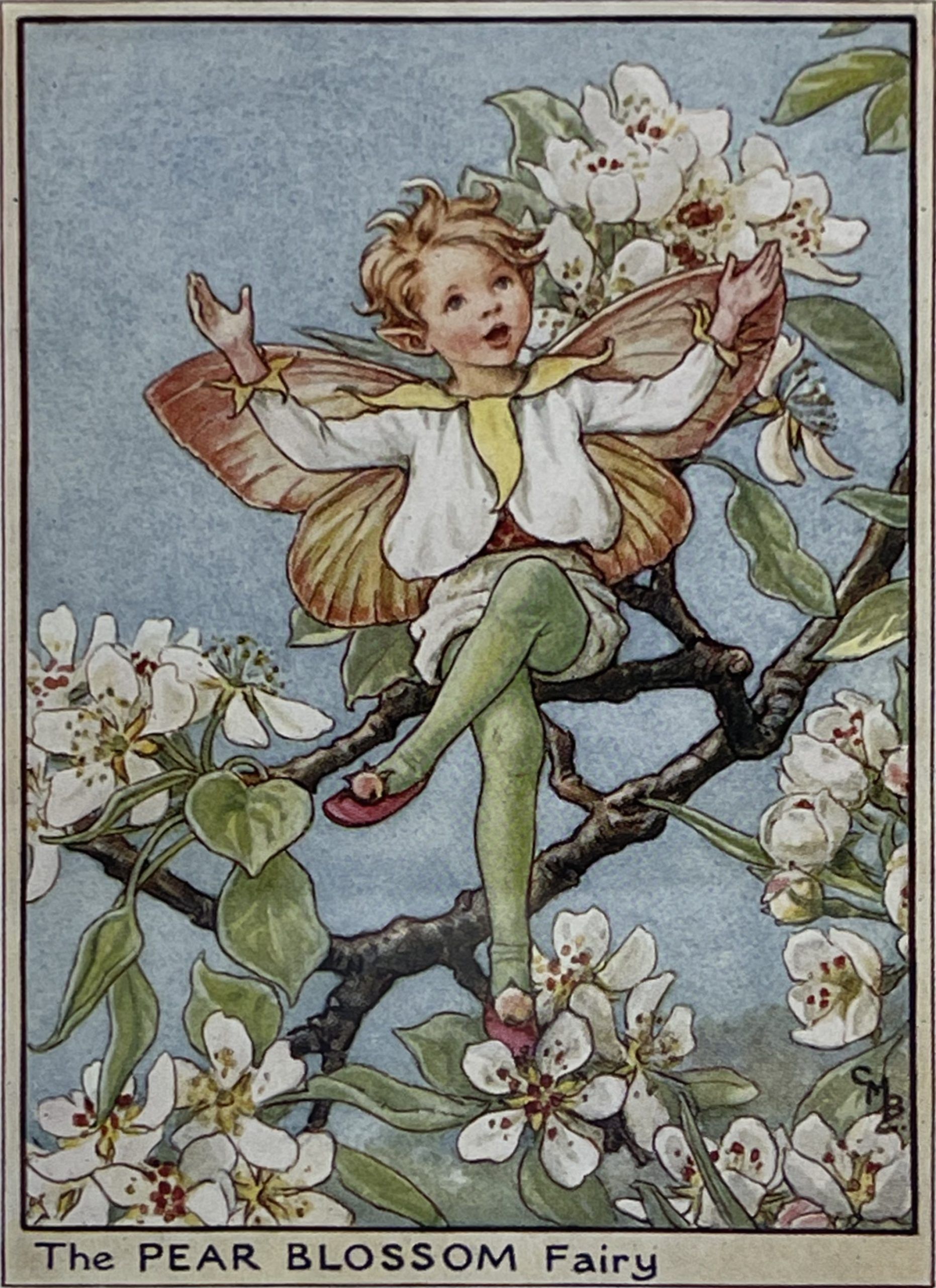 Cecily Mary Barker’s charming illustration of the elusive Pear Blossom Fairy, who flits among the blossoms and helps to keep the tree happy, rarely seen but essential to the health of the tree.