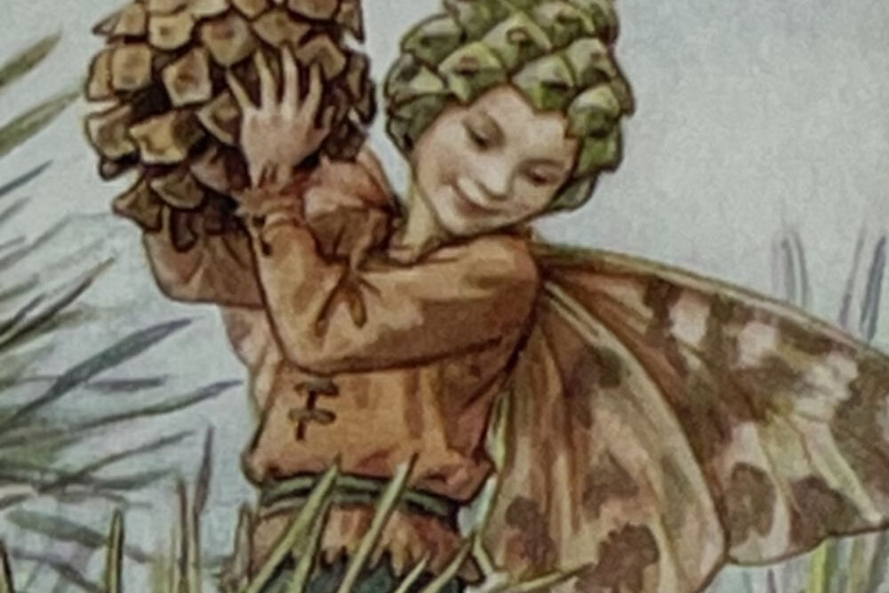 Cecily Mary Barker’s charming illustration of the elusive Pine Tree Fairy, whose playful antics with the pinecones keep the tree happy, rarely seen but essential to the health of the tree.