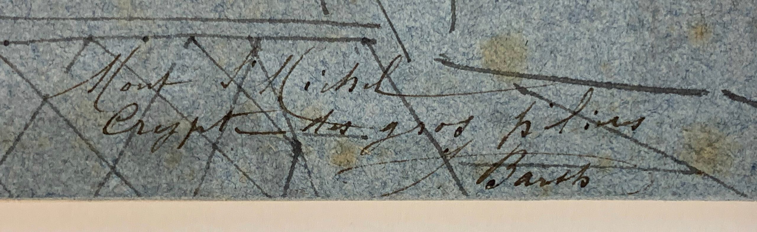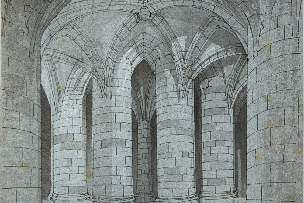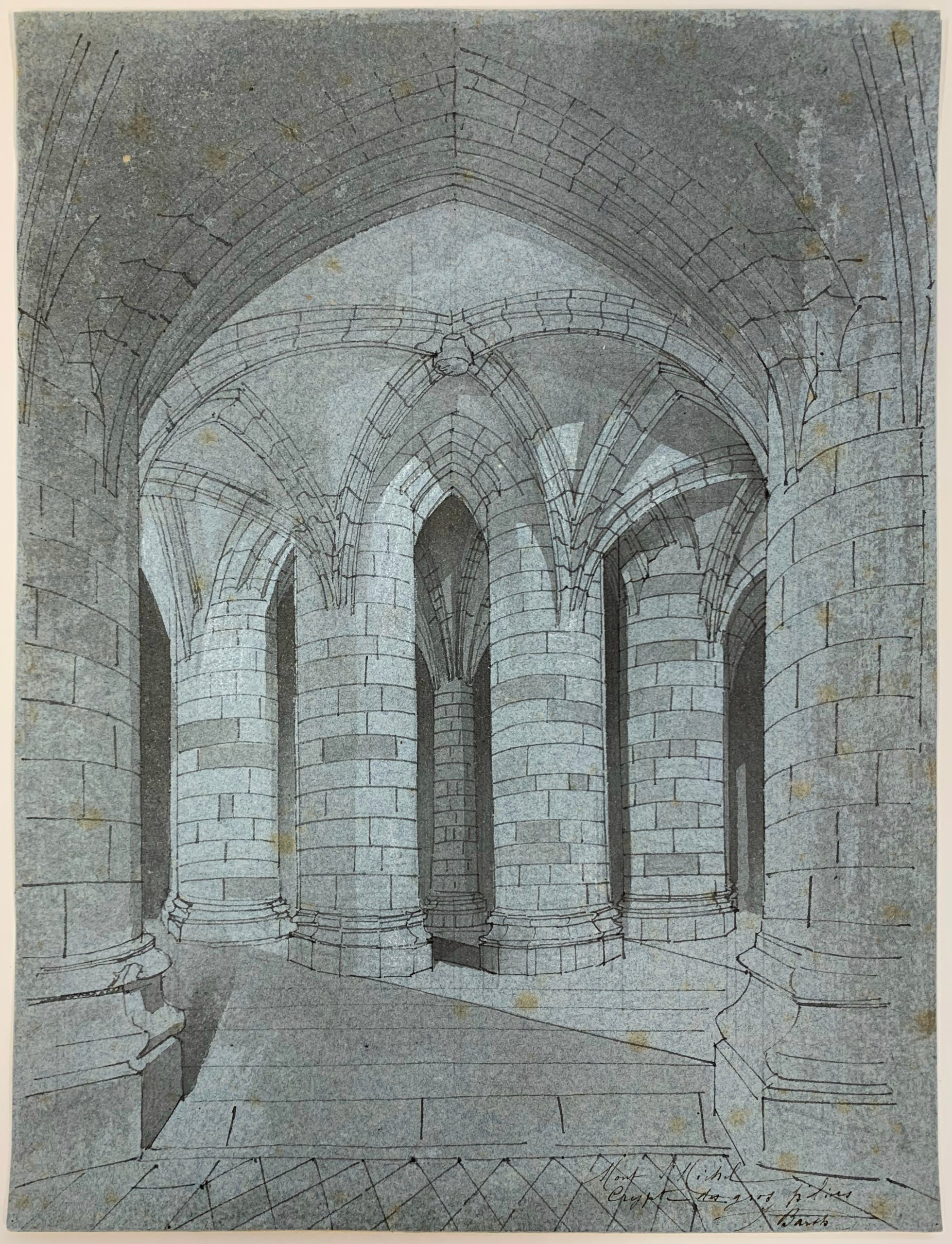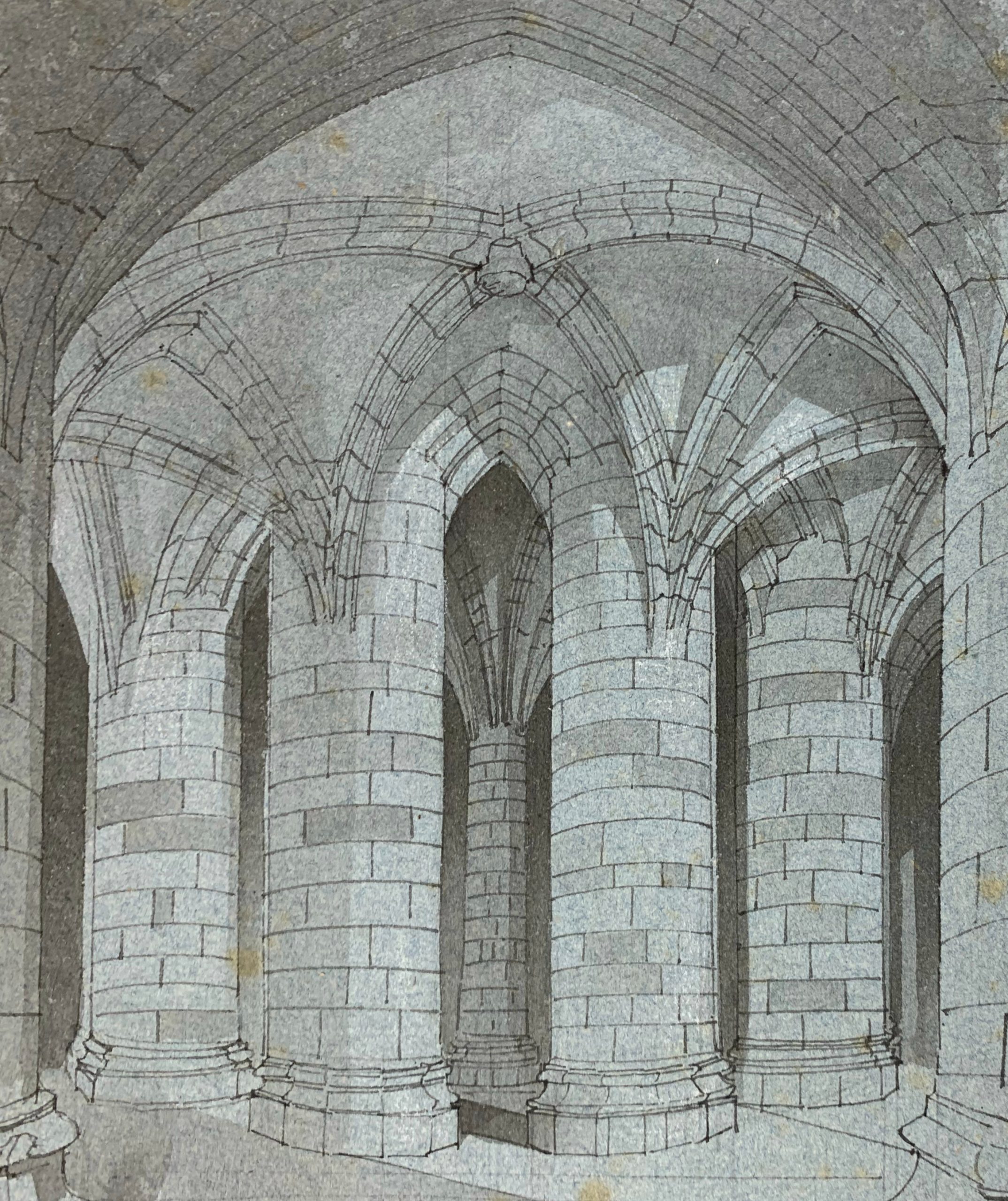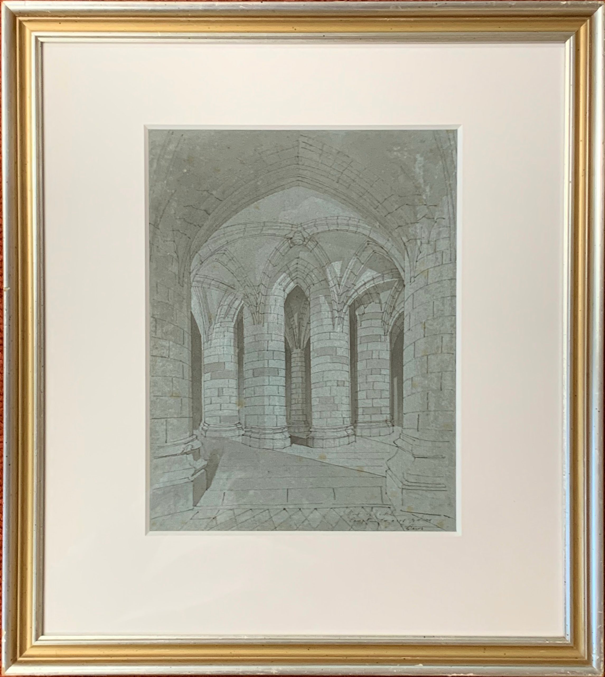 This beautiful architectural pen and ink drawing with ink wash is attributed to the Norwegian artist Johan H. van Kervel Barth. Its title refers to the crypt under the ancient Mont Saint Michel Abbey in Lower Normandy, France. The abbey was declared an historic monument in 1874, so by the time Barth knew of it, its history as an abbey (and later a prison) was old history.
