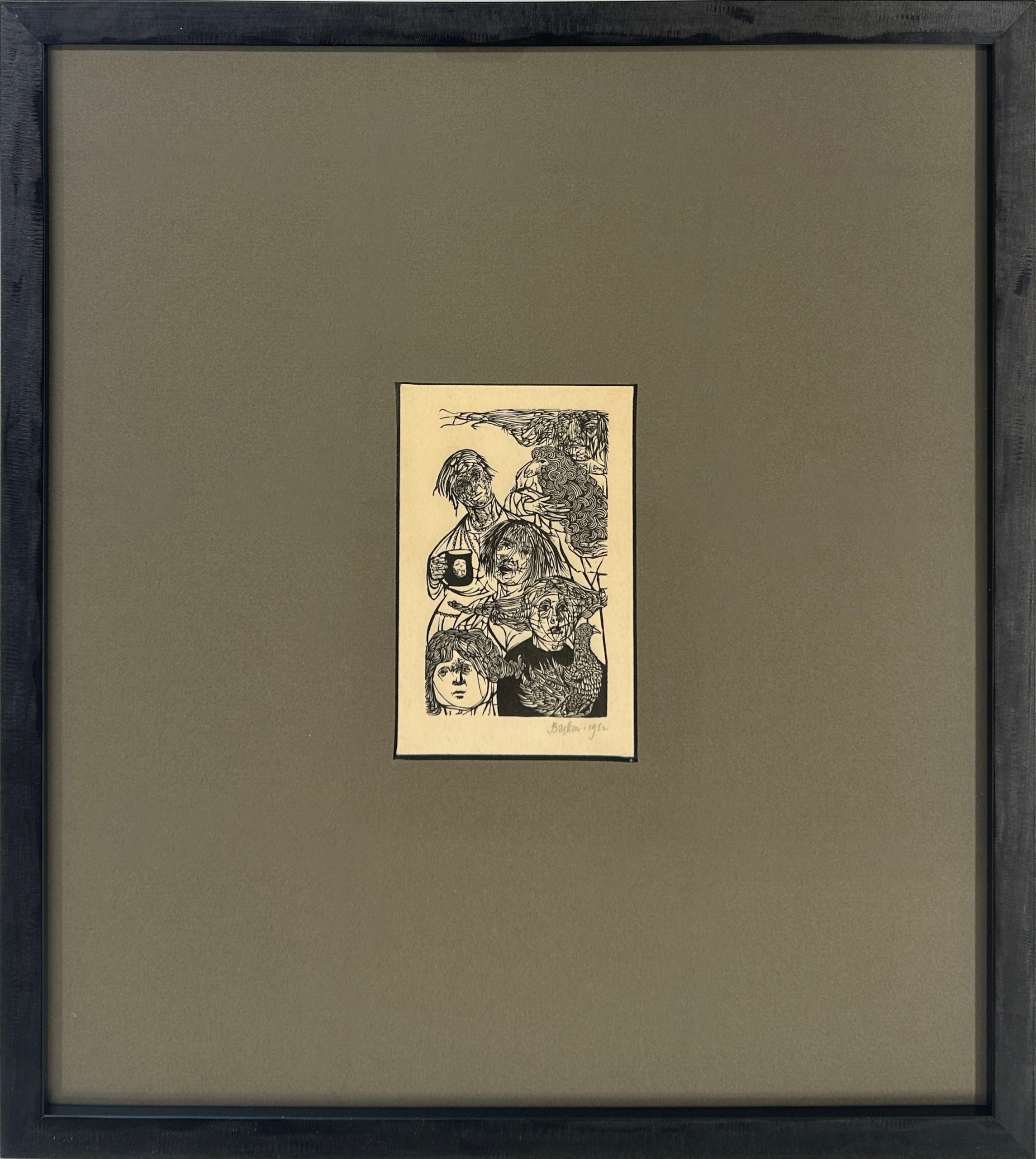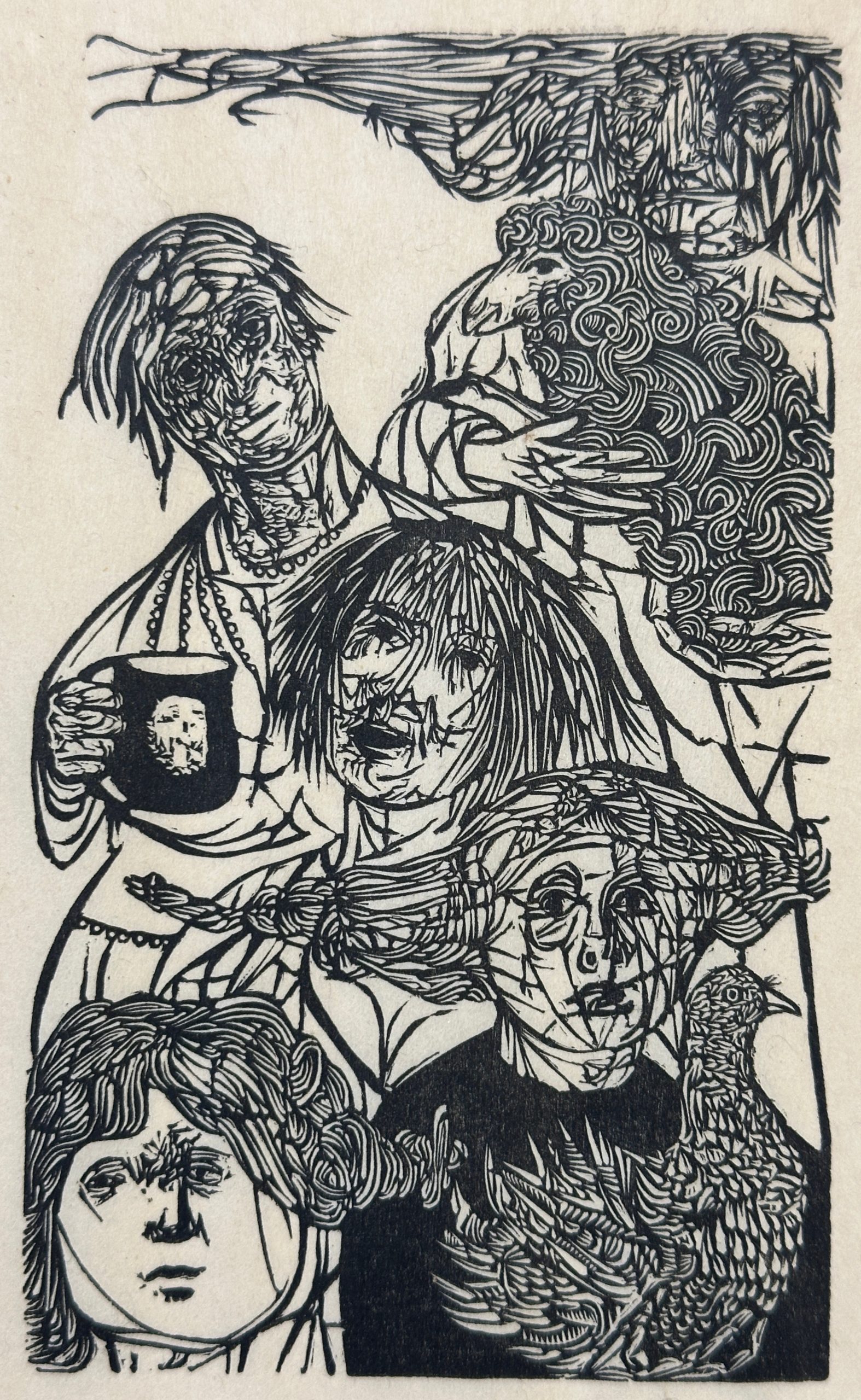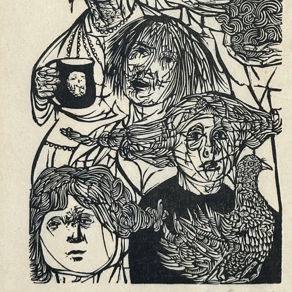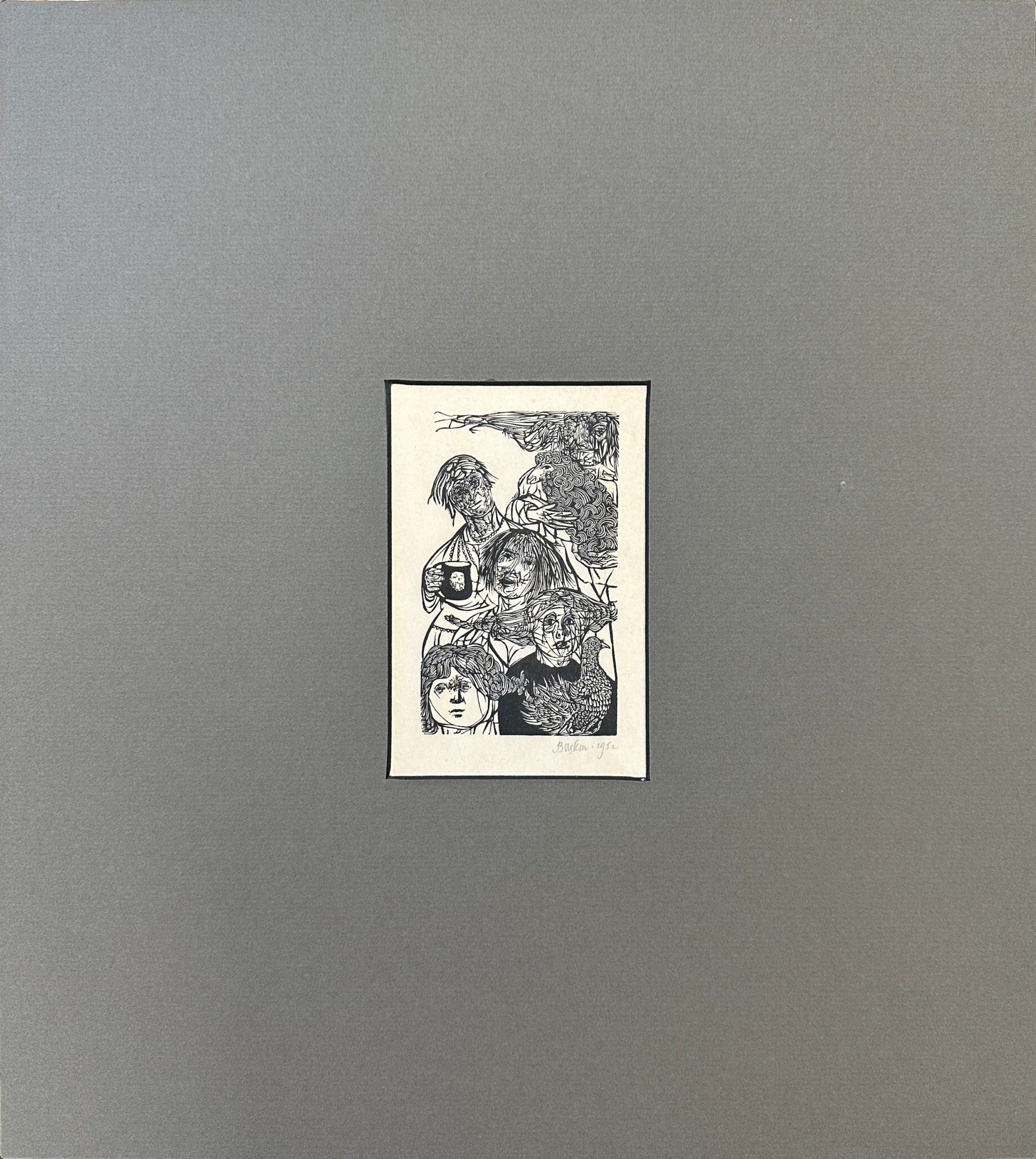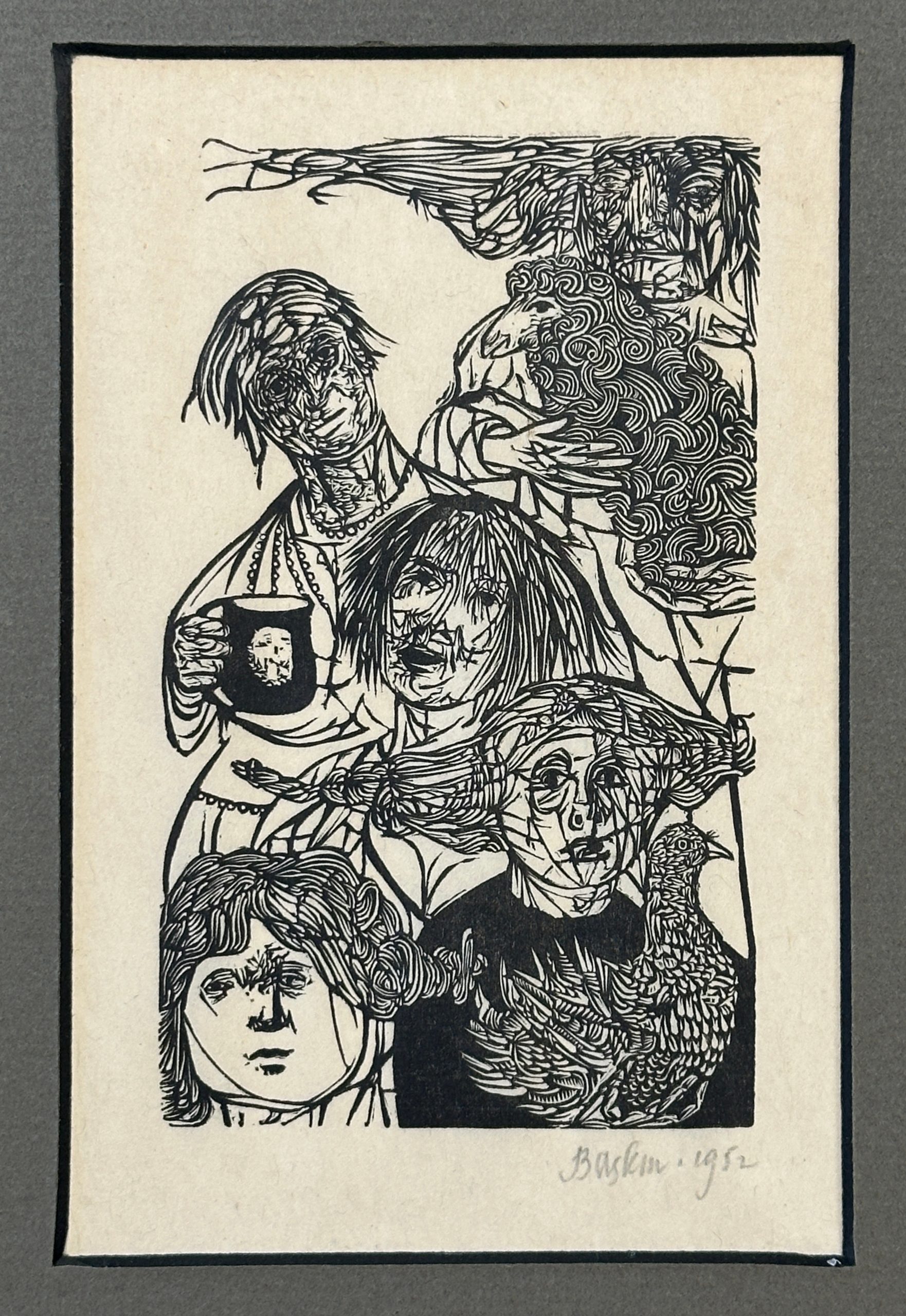 A rare early Baskin work. One of 11 untitled wood engravings made to decorate John Skelton’s “A Poem Called the Tunning of Elynour Rummynge”, published by the Gehenna Press in 1953. This picture appearing on page 24.