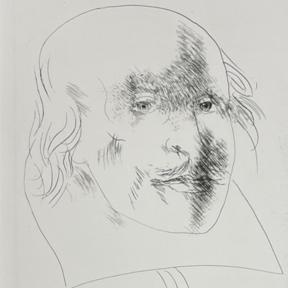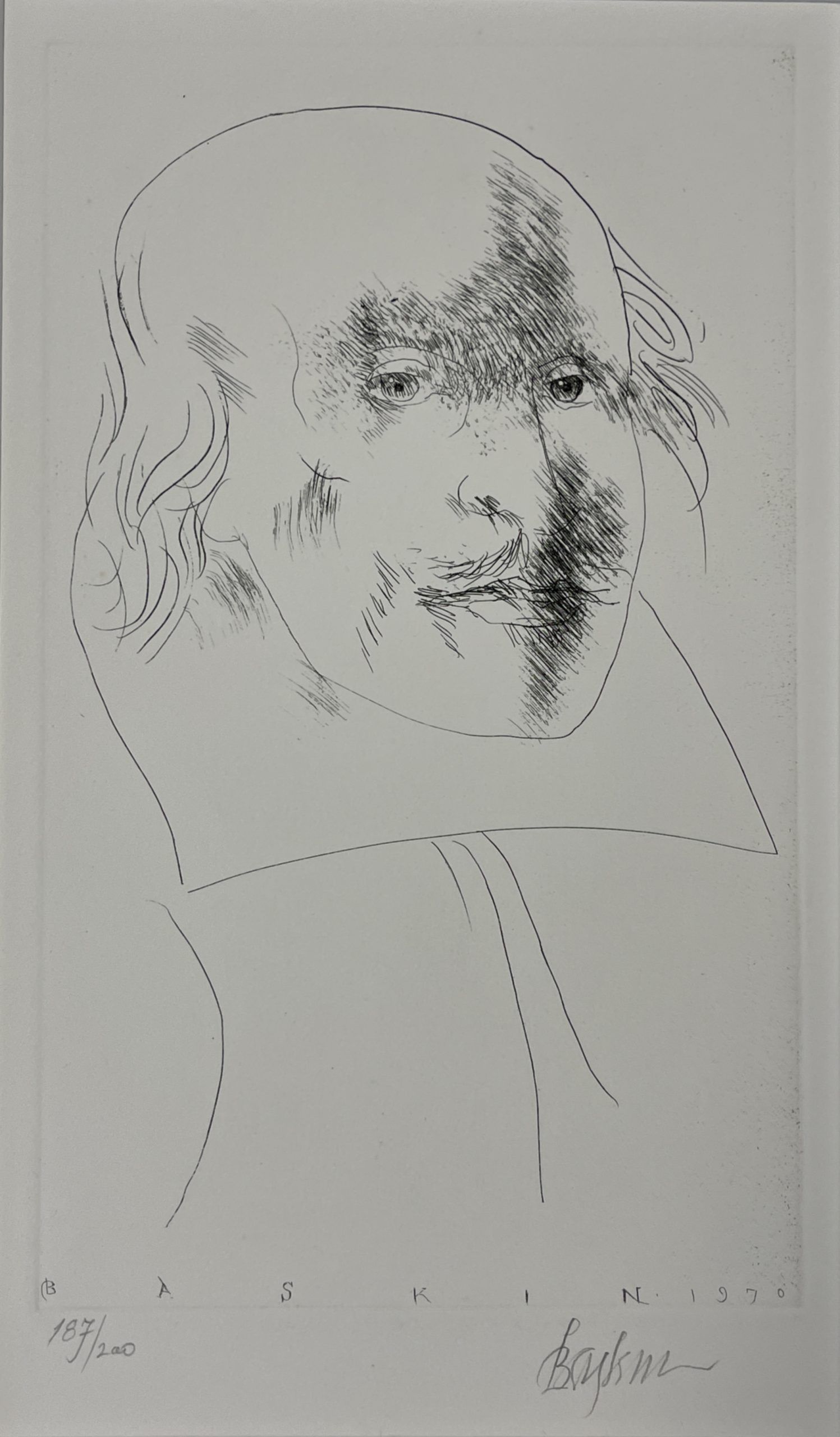 This etching of William Shakespeare is from Leonard Baskin’s Titus Andronicus. Titus Andronicus was the first volume of The Gehenna Shakespeare, which Baskin intended to be the first of what would be the complete works of Shakespeare. But years later, Baskin wrote of it as an “idiotic idea,” because the cost to print it, with handmade paper and metal type, made the project an “expensive fiasco”. Titus Andronicus and Othello were the only two volumes completed.