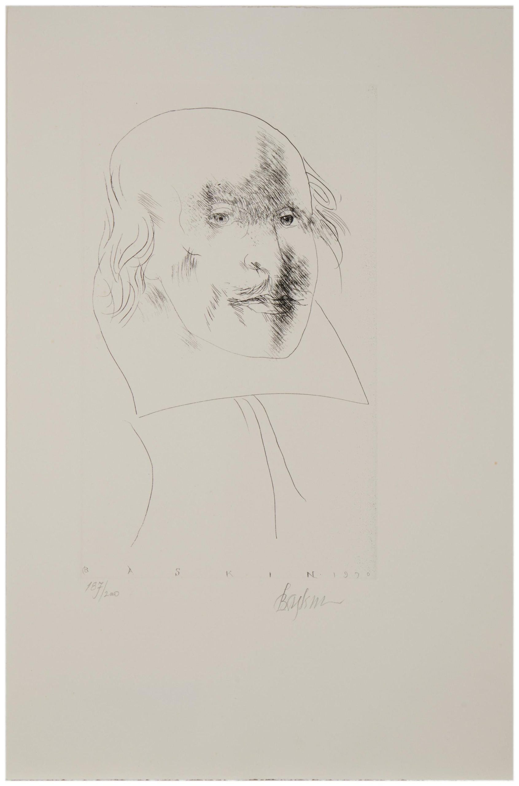 This etching of William Shakespeare is from Leonard Baskin’s Titus Andronicus. Titus Andronicus was the first volume of The Gehenna Shakespeare, which Baskin intended to be the first of what would be the complete works of Shakespeare. But years later, Baskin wrote of it as an “idiotic idea,” because the cost to print it, with handmade paper and metal type, made the project an “expensive fiasco”. Titus Andronicus and Othello were the only two volumes completed.