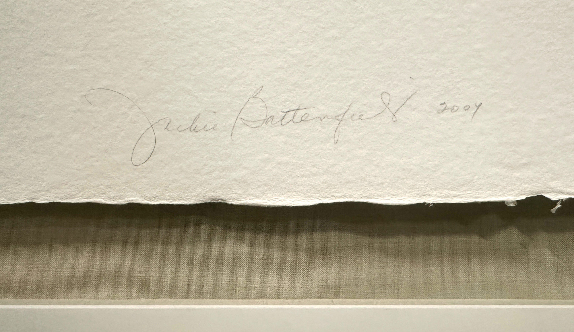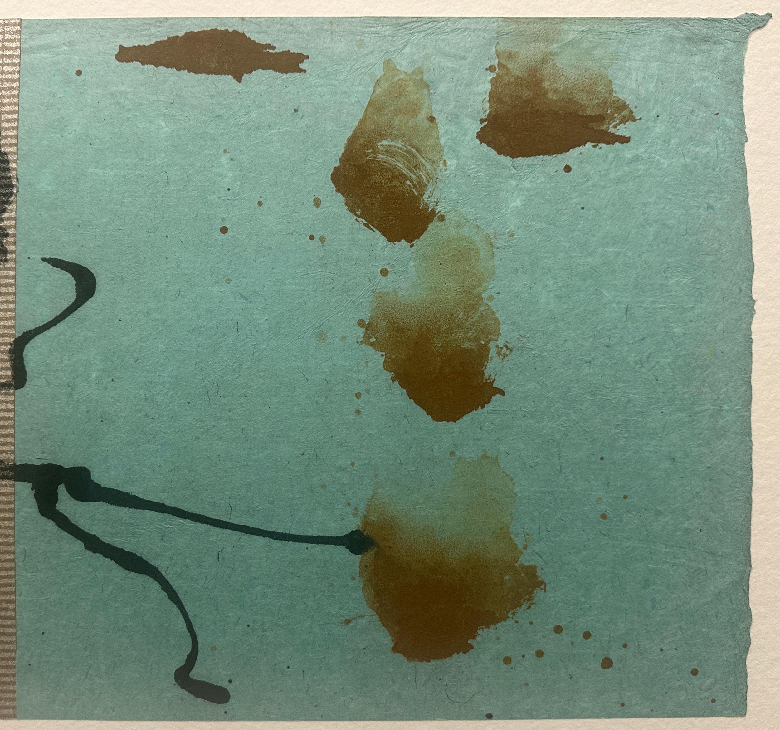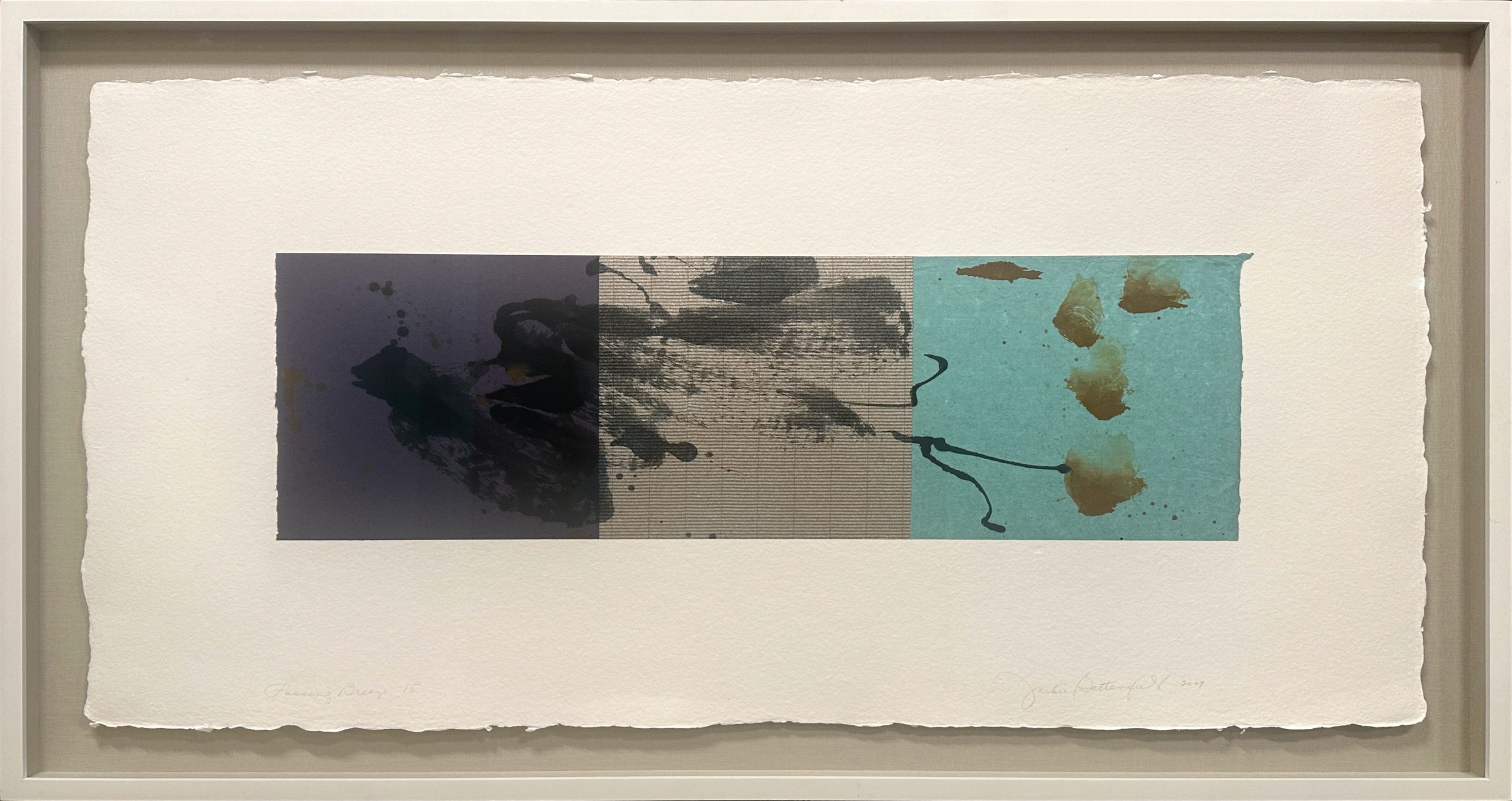 This work is part of Battenfield’s Passing Breeze series in which she aimed to capture an arrested moment through the painterly tension which is created between the deep space of an intensely-colored field, the floating marks of expressive materials imbedded in the sheet (such as bamboo leaves, horsehair, and gold leaf slivers), and the hard edge of the cut paper. The three panels are 10 in. (h) x 31.5 in. (w). The three panels are mounted on a fine sheet of very heavy, textured paper, perhaps using a Chine-Collé technique, which is 25 in. (h) x 42 in. (w).