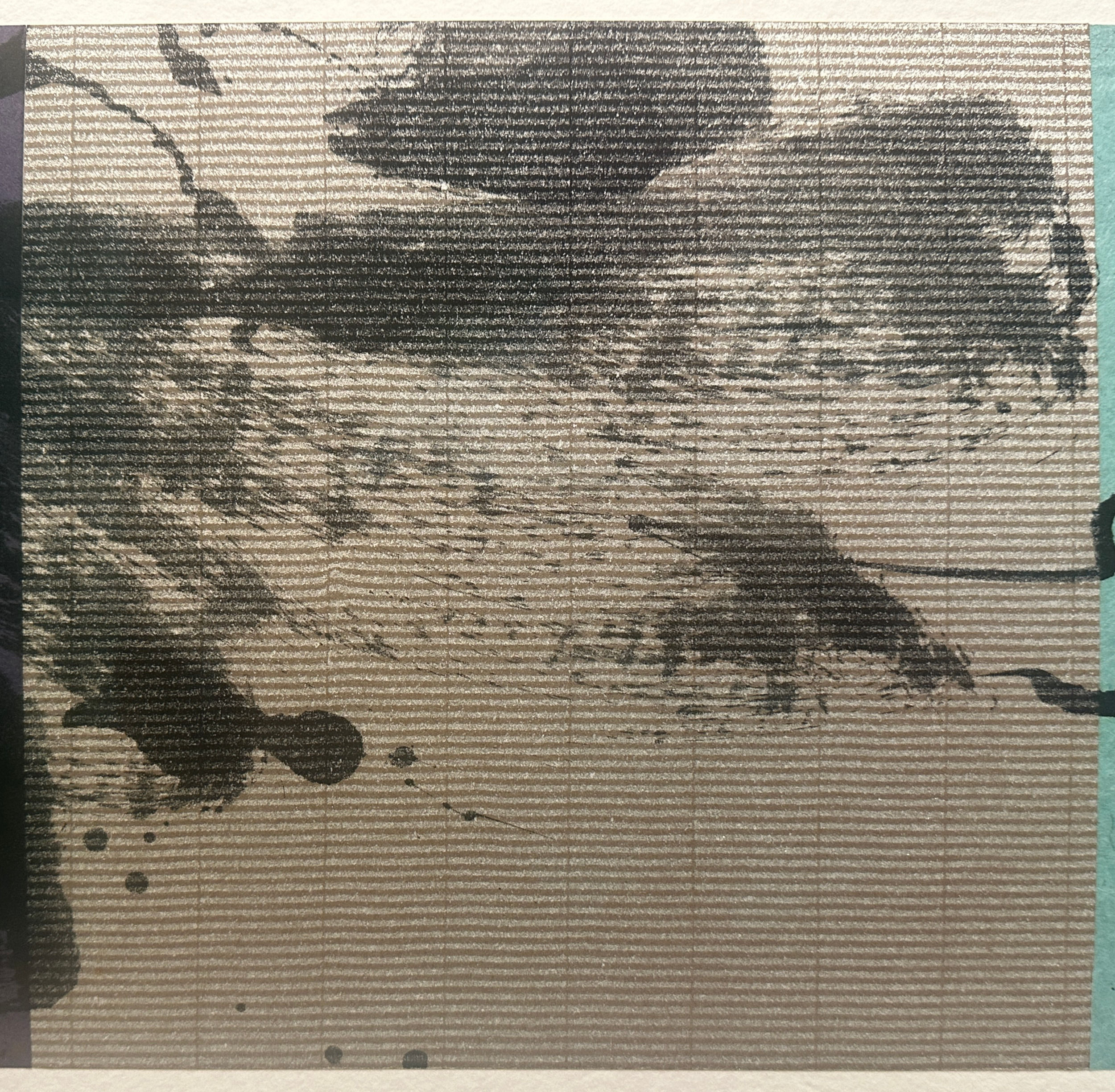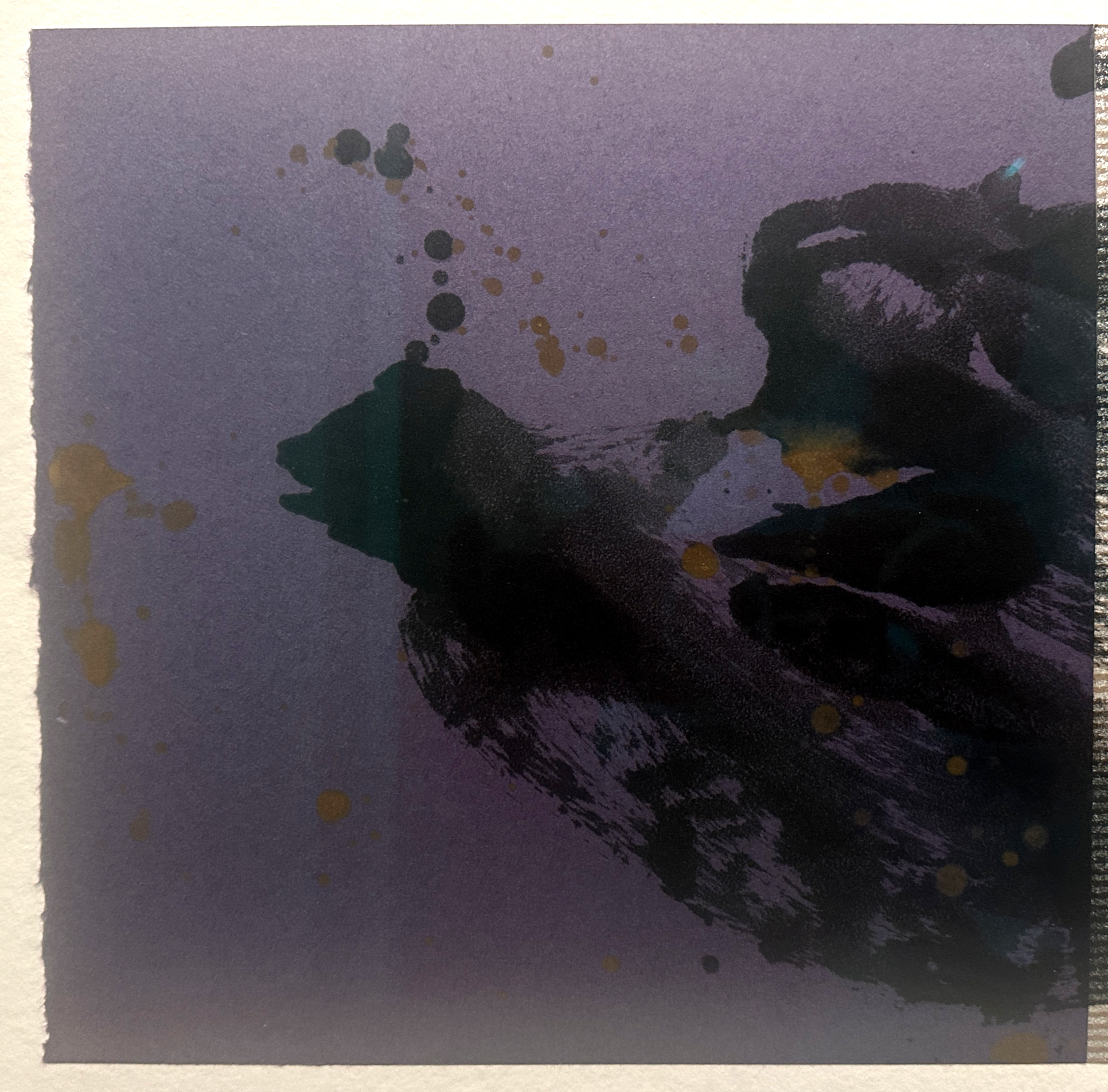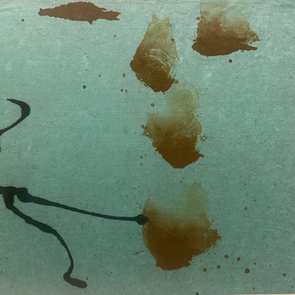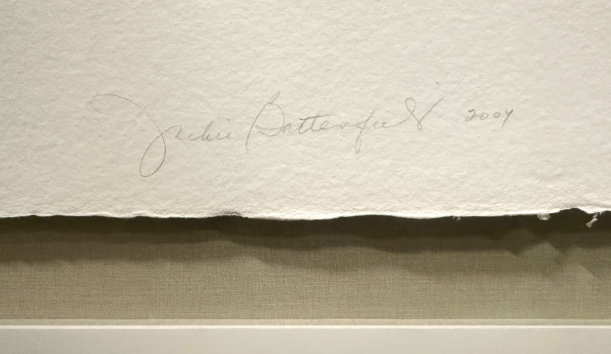 This work is part of Battenfield’s Passing Breeze series in which she aimed to capture an arrested moment through the painterly tension which is created between the deep space of an intensely-colored field, the floating marks of expressive materials imbedded in the sheet (such as bamboo leaves, horsehair, and gold leaf slivers), and the hard edge of the cut paper. The three panels are 10 in. (h) x 31.5 in. (w). The three panels are mounted on a fine sheet of very heavy, textured paper, perhaps using a Chine-Collé technique, which is 25 in. (h) x 42 in. (w).