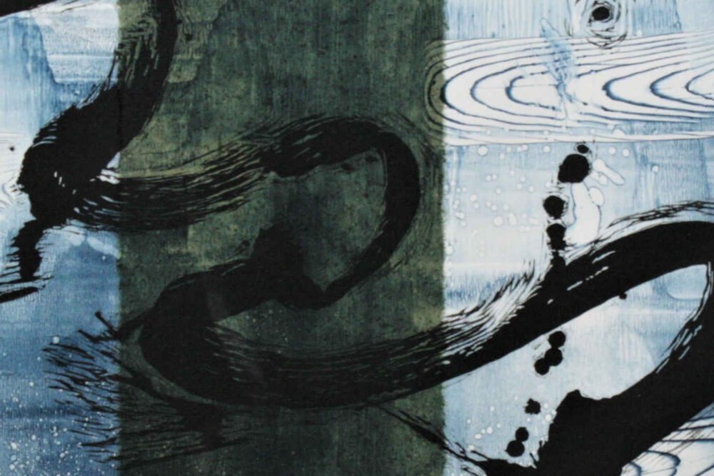 Battenfield told me that this work was the first woodcut print she made in her water series. The black image is cut out of a special Japanese woodblock, removing all the “white” area and leaving a relief that is inked in black. Her aim was to have the black gesture float down through the “layers” of water. The water was done as a monoprint, so the blue background in every one of Battenfield’s water series is unique. A green Japanese chiri paper is collaged into the middle doing a little push/pull with the underlying blue. Battenfield carved the woodcut for this print in Williamsburg, Virginia.