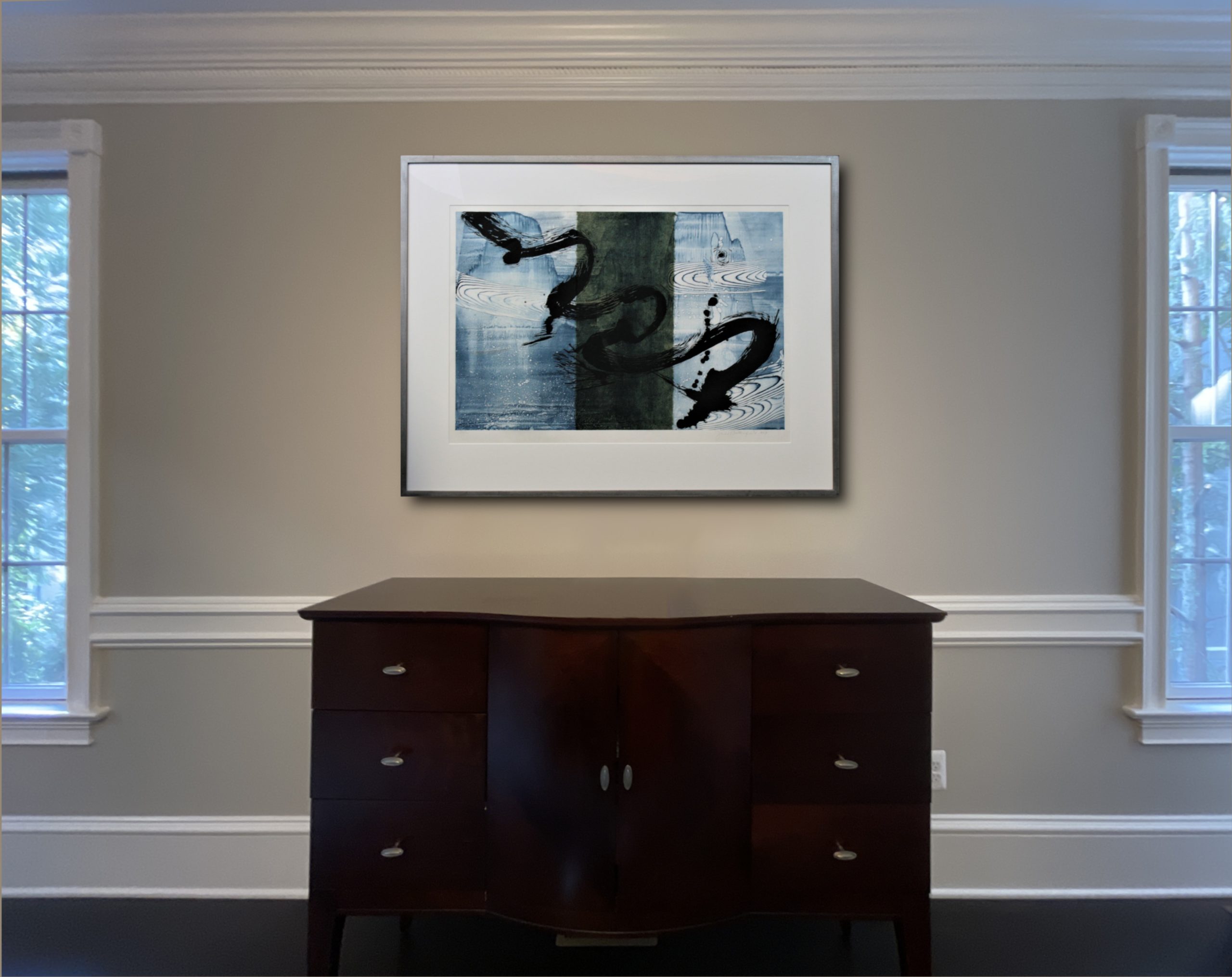 Battenfield told me that this work was the first woodcut print she made in her water series. The black image is cut out of a special Japanese woodblock, removing all the “white” area and leaving a relief that is inked in black. Her aim was to have the black gesture float down through the “layers” of water. The water was done as a monoprint, so the blue background in every one of Battenfield’s water series is unique. A green Japanese chiri paper is collaged into the middle doing a little push/pull with the underlying blue. Battenfield carved the woodcut for this print in Williamsburg, Virginia.
