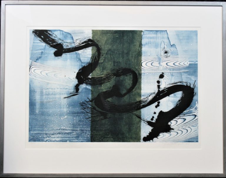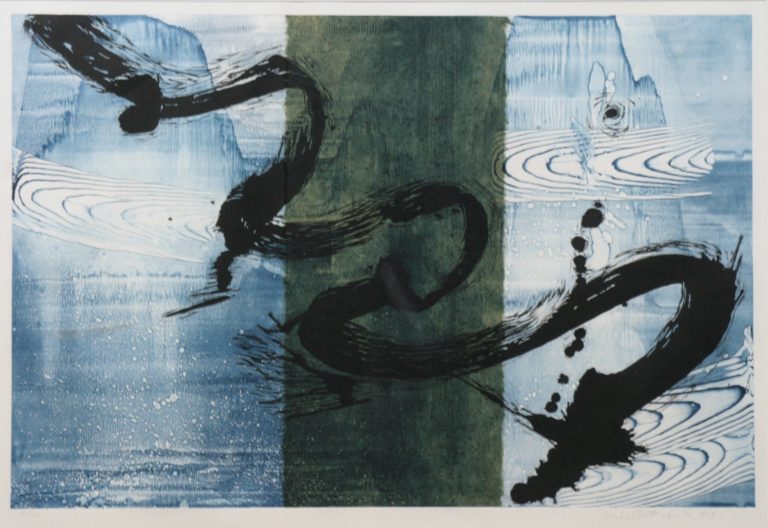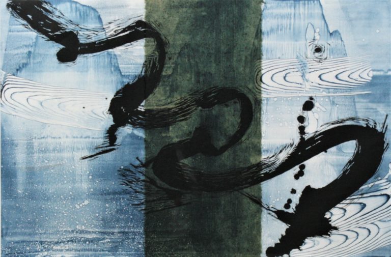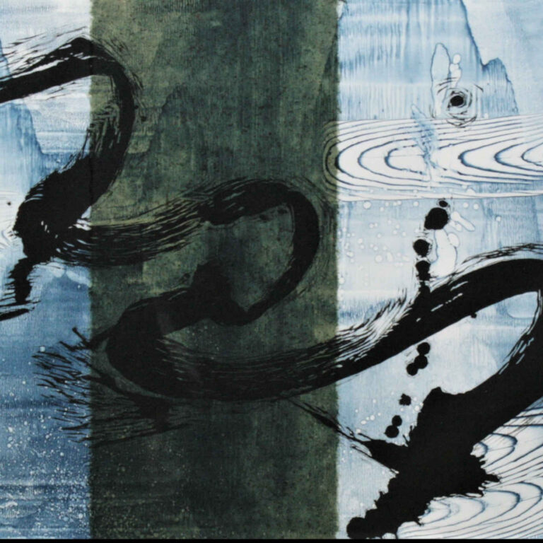 Battenfield told me that this work was the first woodcut print she made in her water series. The black image is cut out of a special Japanese woodblock, removing all the “white” area and leaving a relief that is inked in black. Her aim was to have the black gesture float down through the “layers” of water. The water was done as a monoprint, so the blue background in every one of Battenfield’s water series is unique. A green Japanese chiri paper is collaged into the middle doing a little push/pull with the underlying blue. Battenfield carved the woodcut for this print in Williamsburg, Virginia.