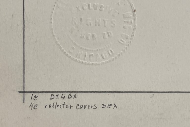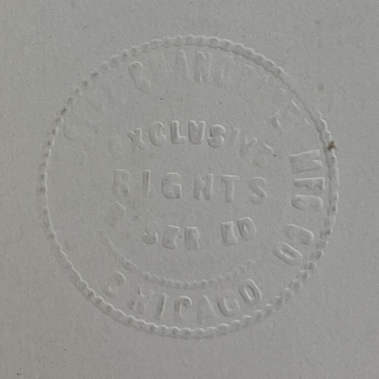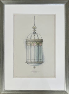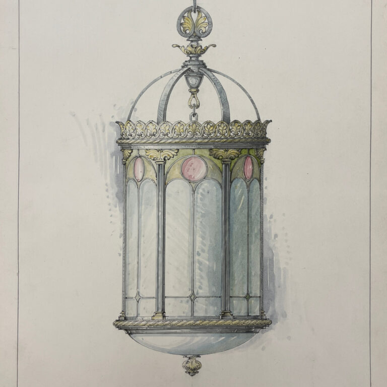 The Beardslee Chandelier Manufacturing Company of Chicago, founded by Frank S. Beardslee in 1901, was a major innovator in lighting and became one of the largest fabricators in the city. Selling only to the trade, they published lavish, large catalogues every year (plus smaller specialty catalogues, like “fast-ship” products) which are of enormous interest today among collectors. This illustration, though, is not a tattered catalogue. Done in pen & ink with watercolors, it is a drawing of a chandelier intended for the choir room, part of a collection of drawings completed to supply all of the lighting fixtures for an unknown client. Bearing the raised seal of the company (“Exclusive Rights Reserved”) and details regarding size, placement, and glass. This is a beautiful and unique work of art and would be at home in a residence, an office, an architectural firm, a design firm, and more.