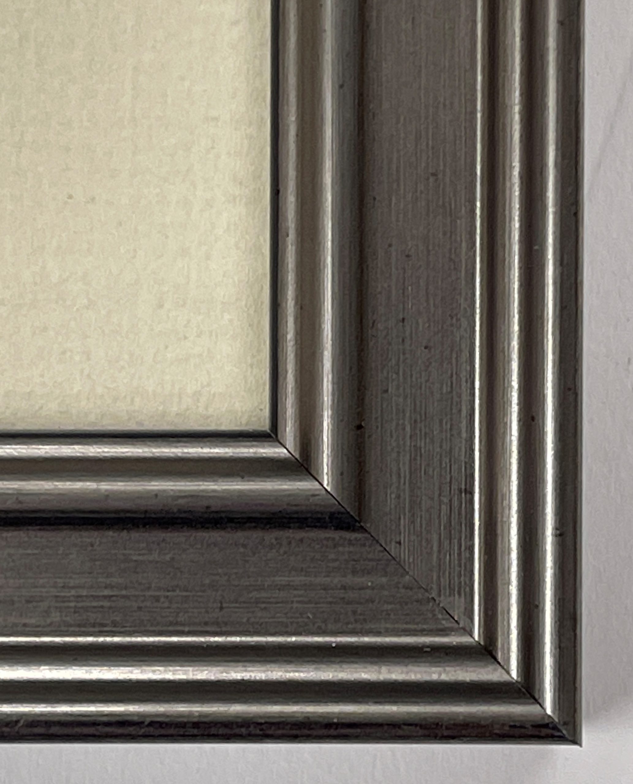 Custom matted and framed in a pewter painted wood frame behind 99% UV-filtering art glass using strictly conservation-grade materials