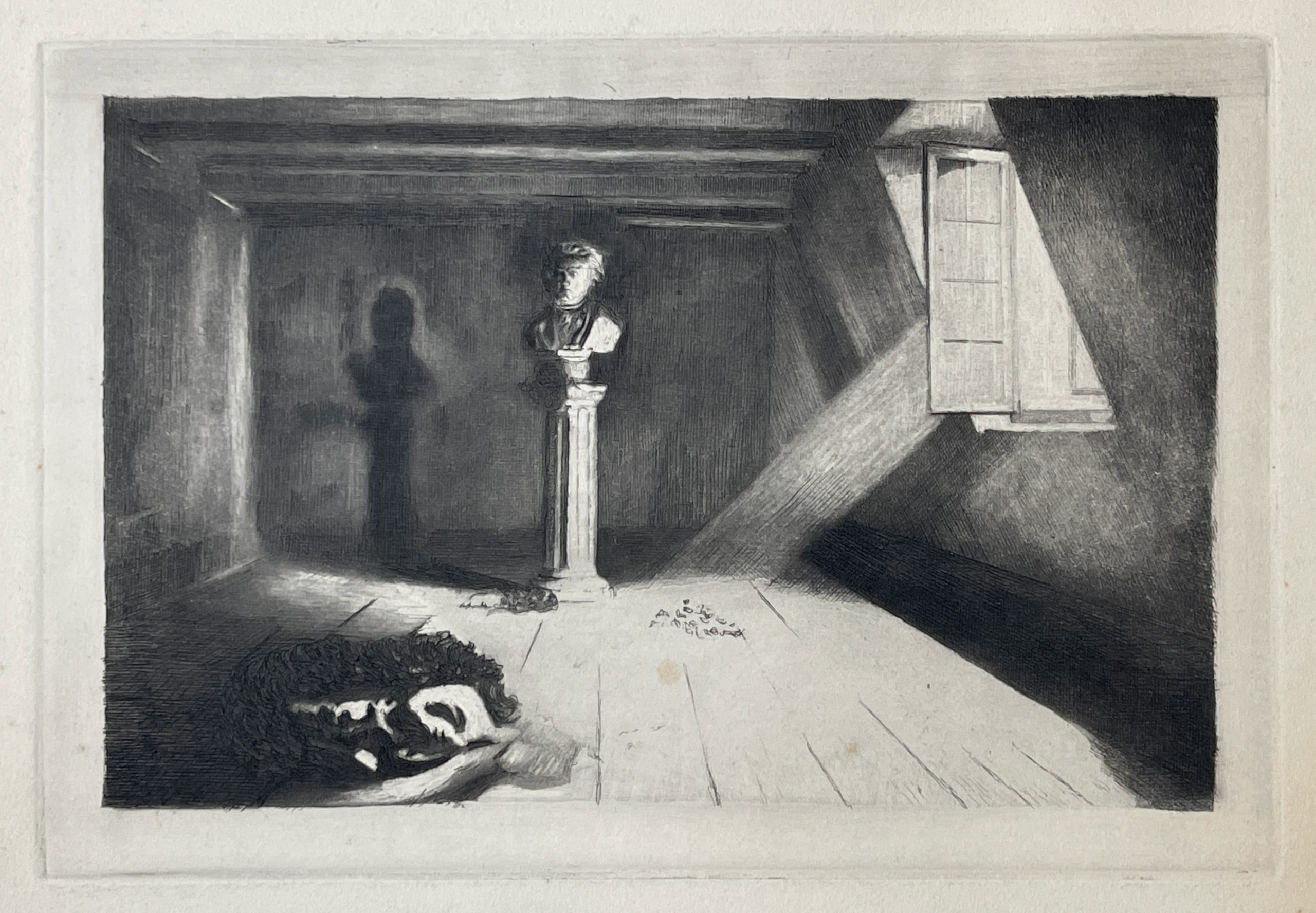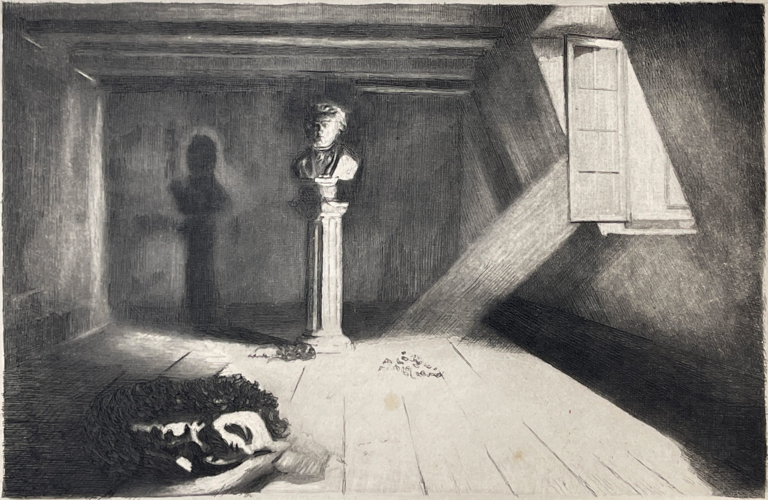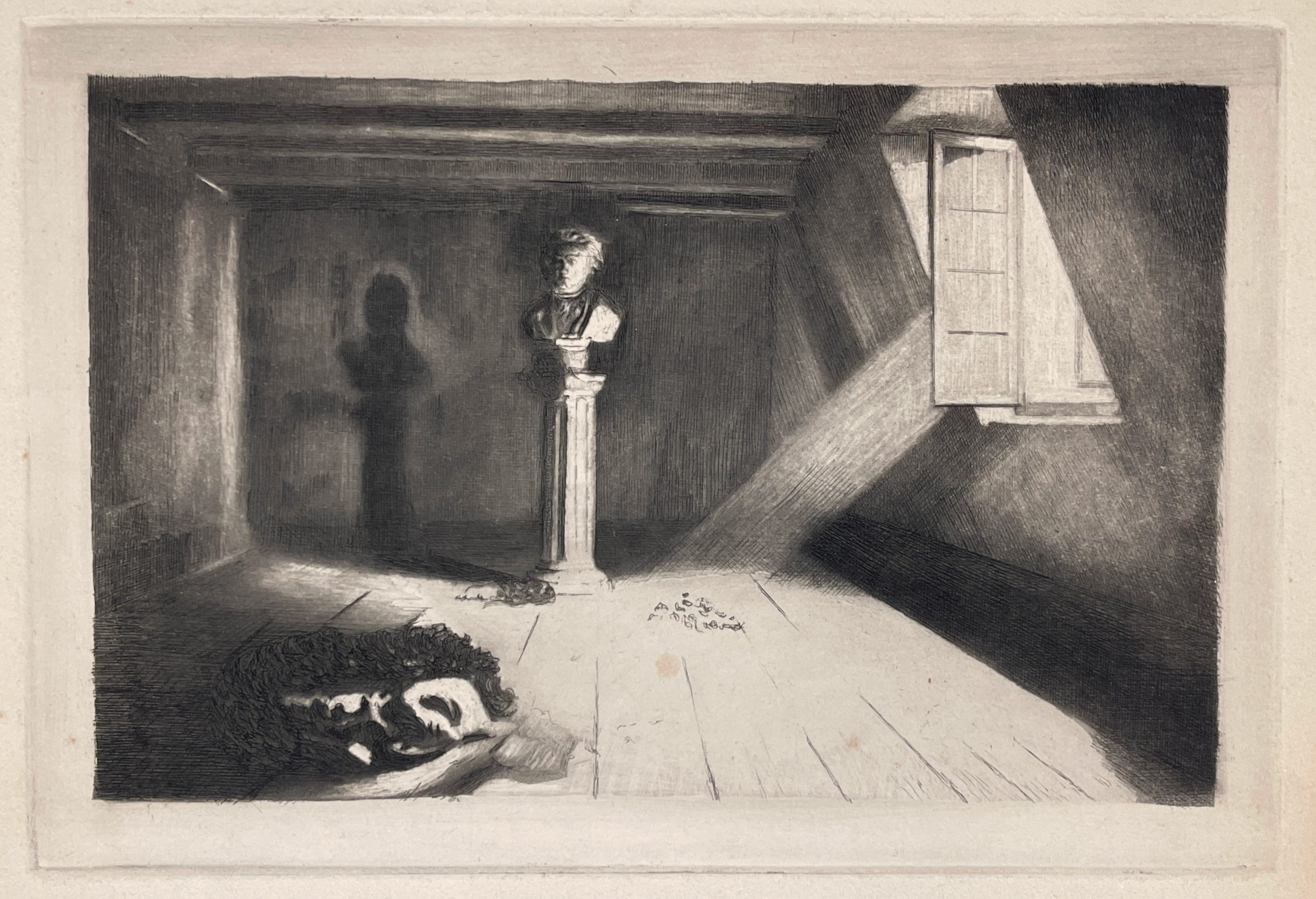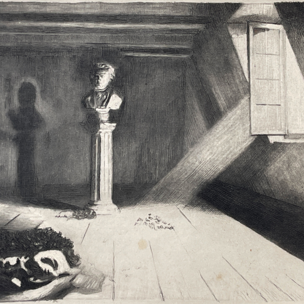 Light shining into an abandoned room, empty but for a bust of Beethoven on a pillar. Published by the musician, artist, and publisher Franz Hanfstaengl.