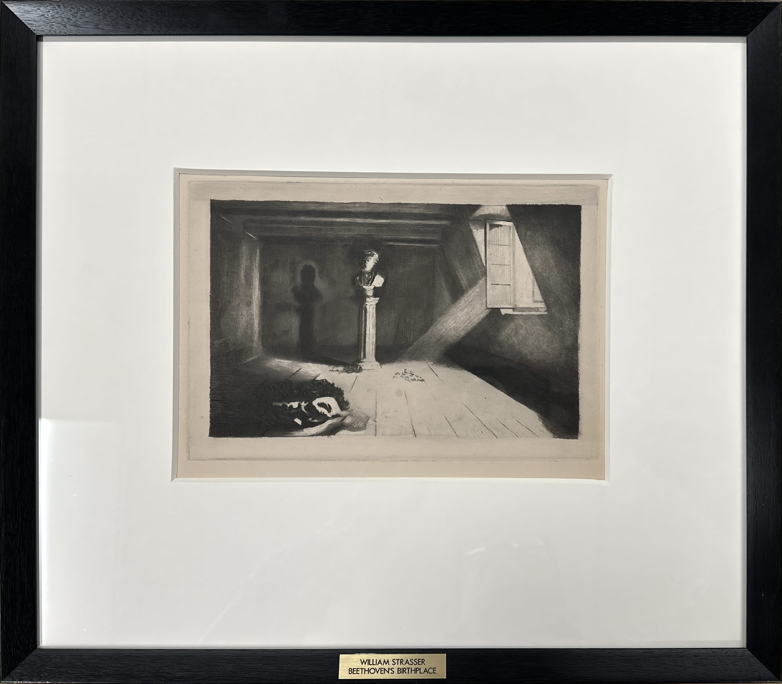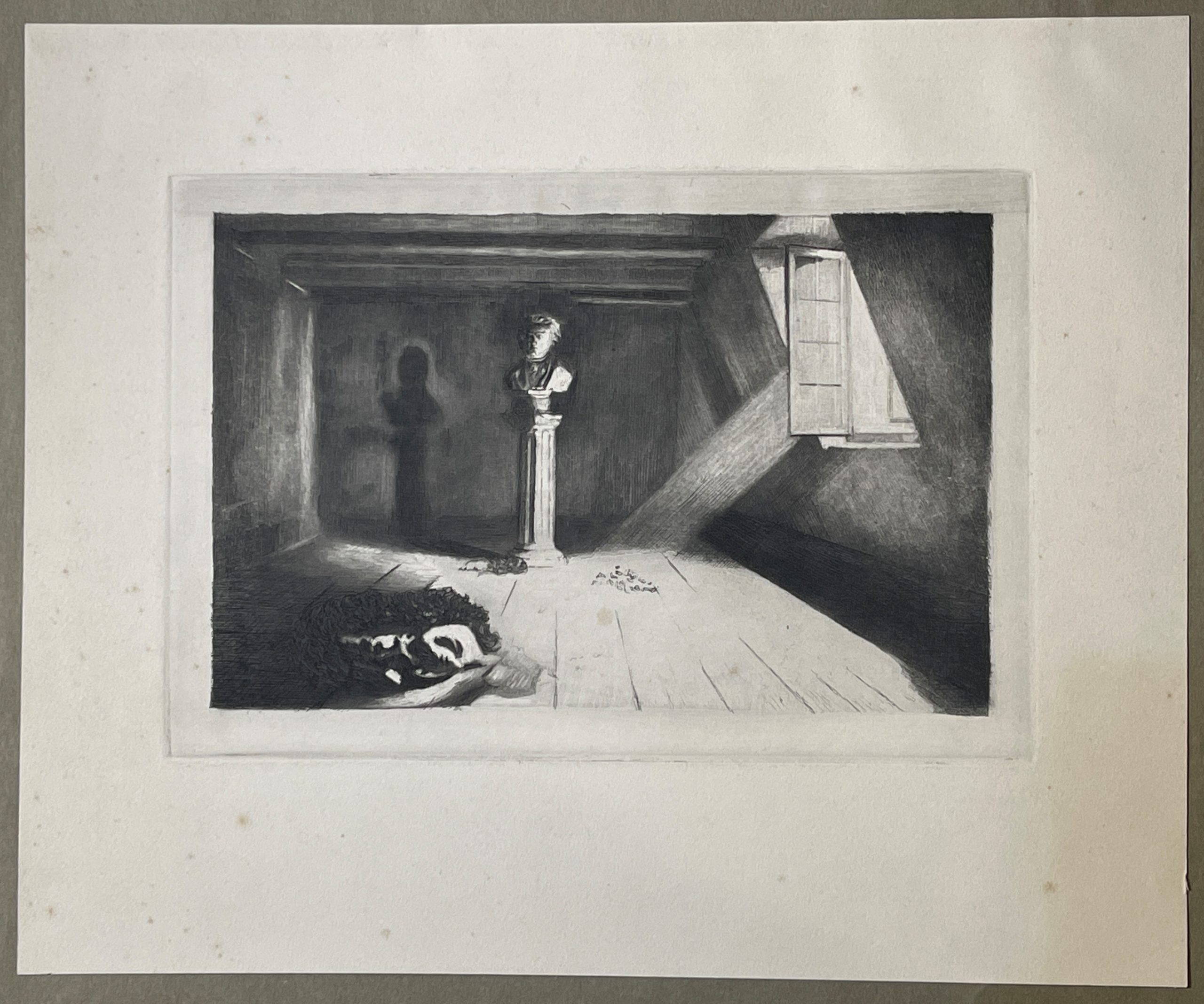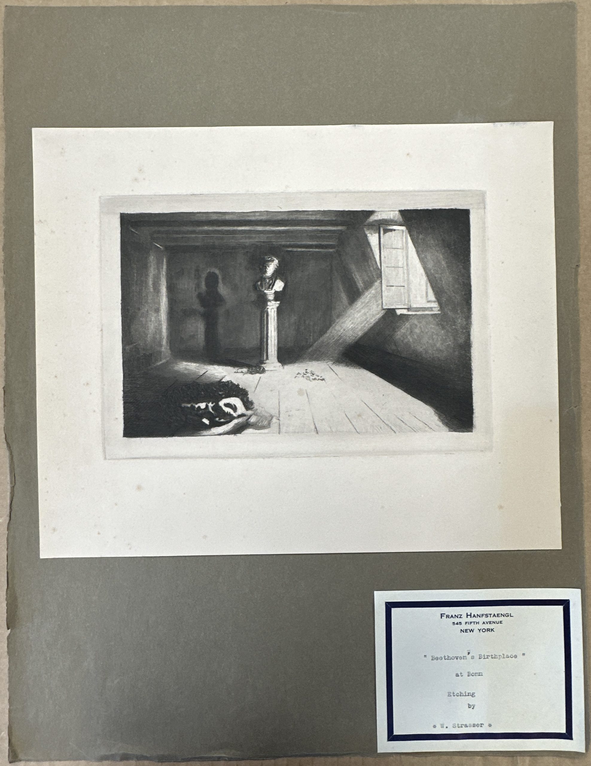 Light shining into an abandoned room, empty but for a bust of Beethoven on a pillar. Published by the musician, artist, and publisher Franz Hanfstaengl.