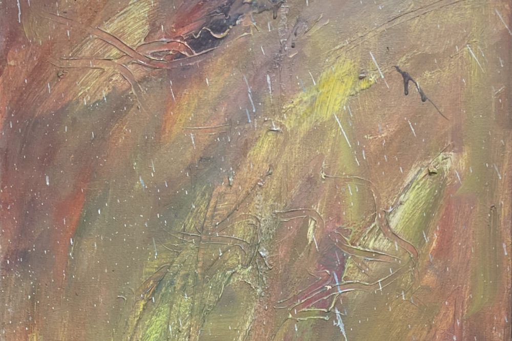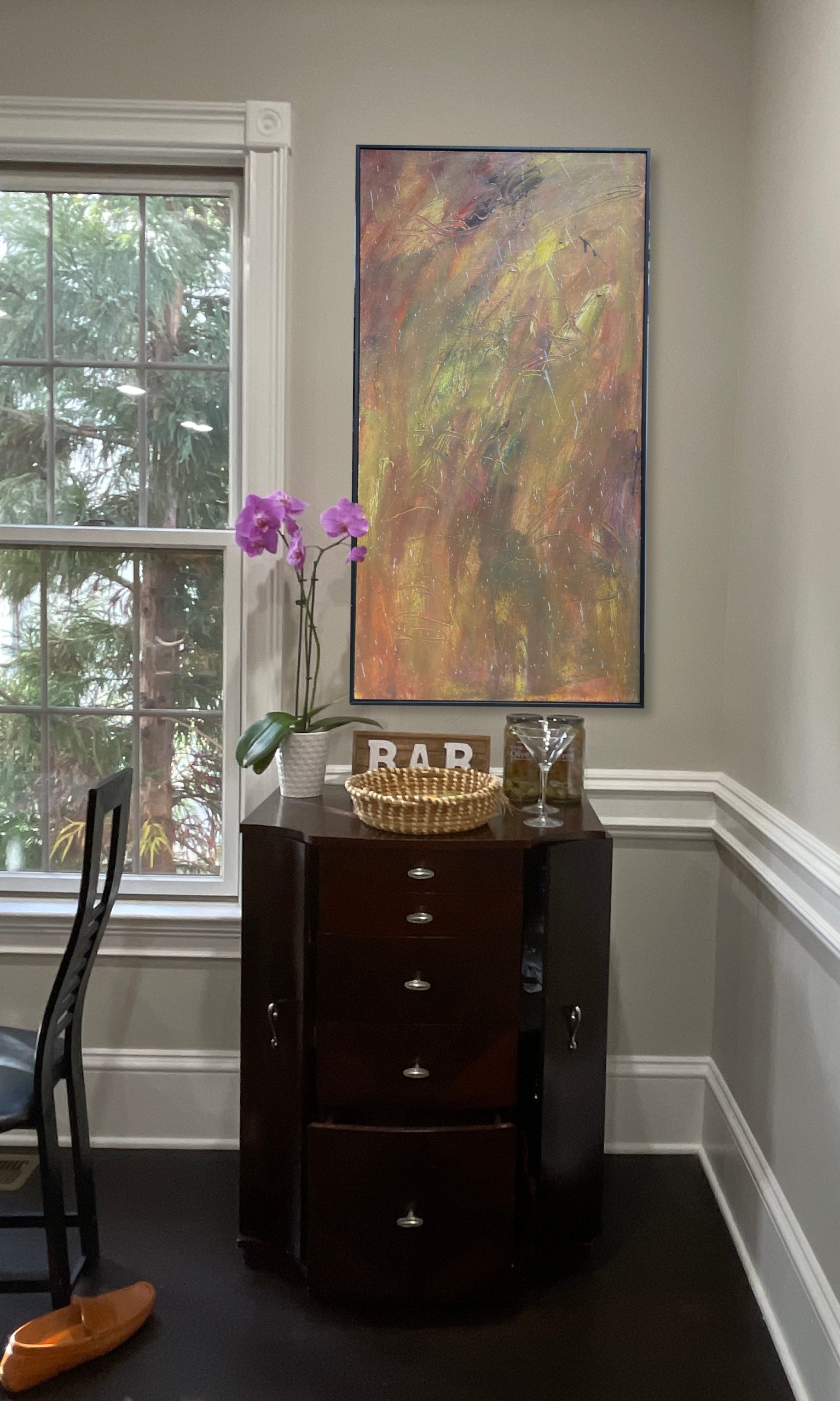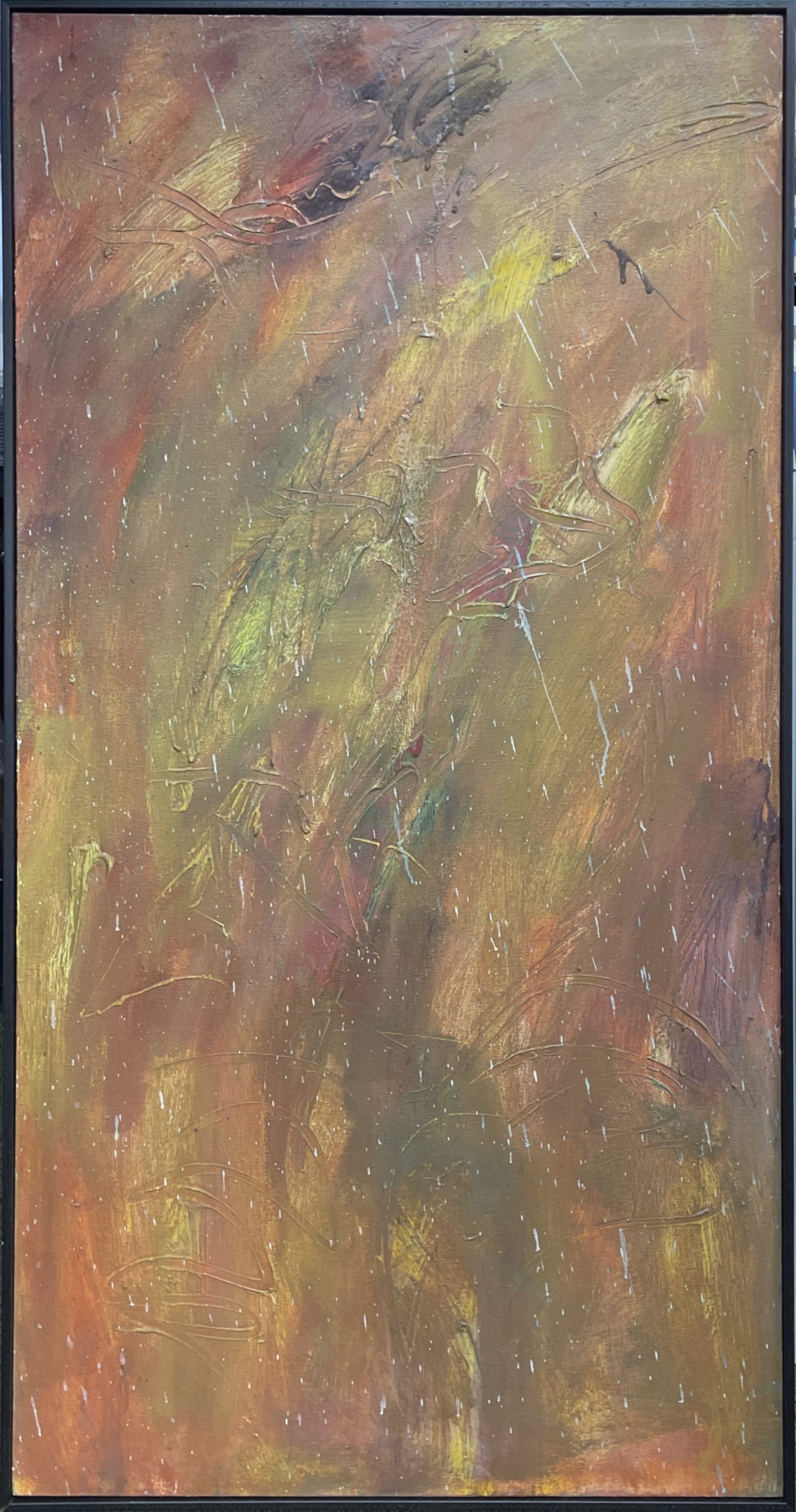 A fascinating painting in which Rita Beler straddles the space between abstract expressionism, action painting, and color field. The canvas has energy moving in multiple dimensions—the paint at a top-right to bottom-left pull, finger swirls disorganized and non-directional, and spattered white paint flickering from top-left to bottom-right.