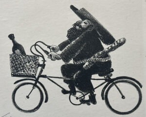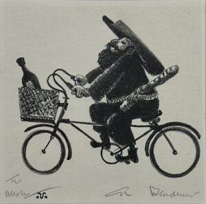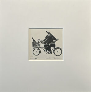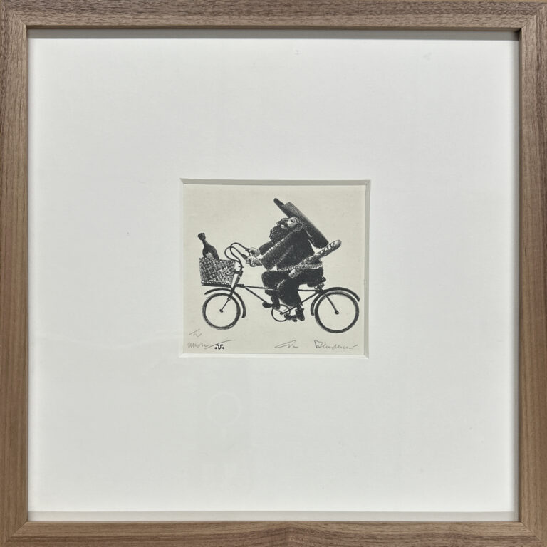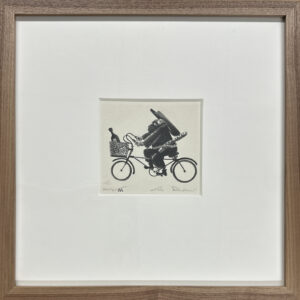 Whimsy on two wheels. Custom framed in a solid walnut frame using strictly conservation-grade materials behind 99% UV-blocking glass.