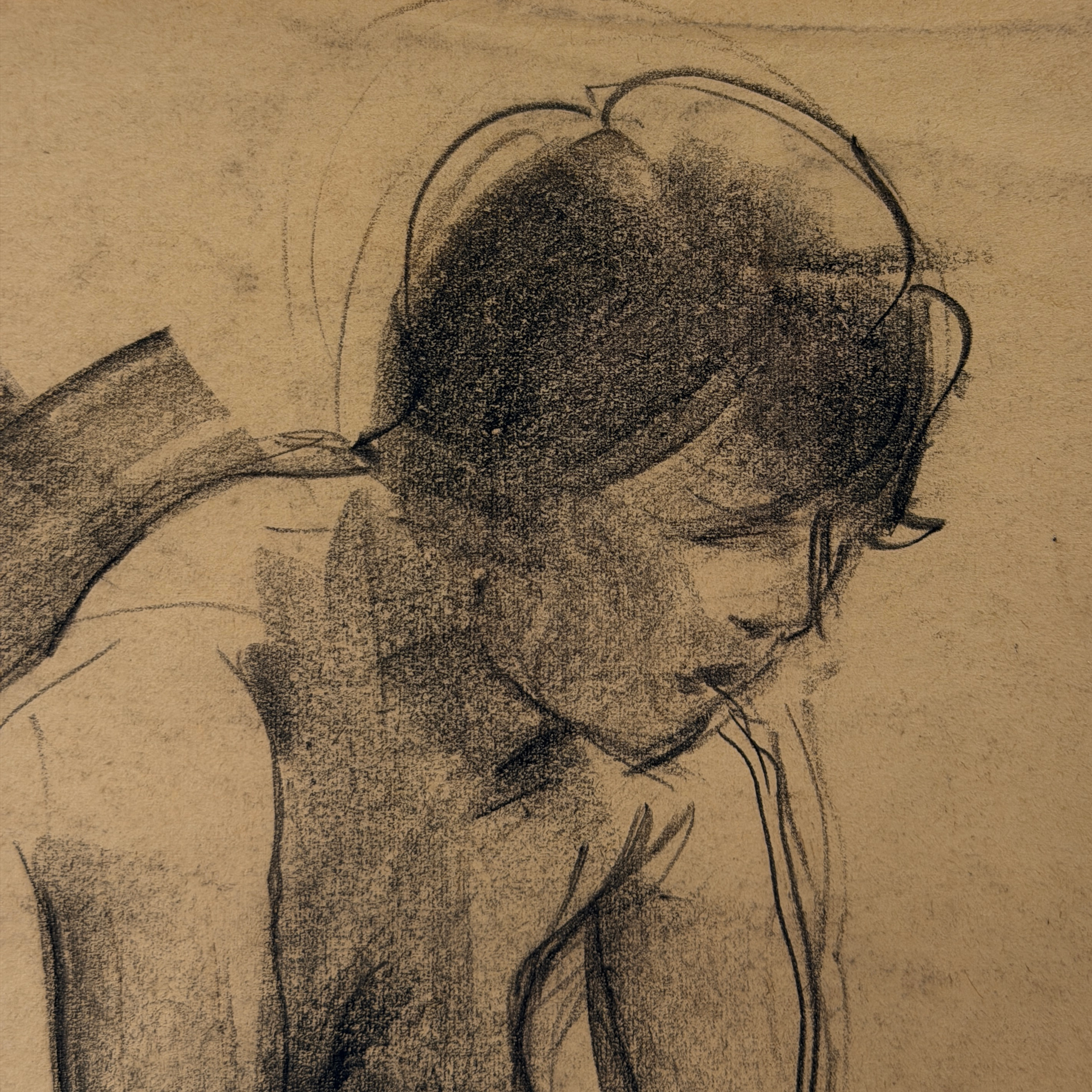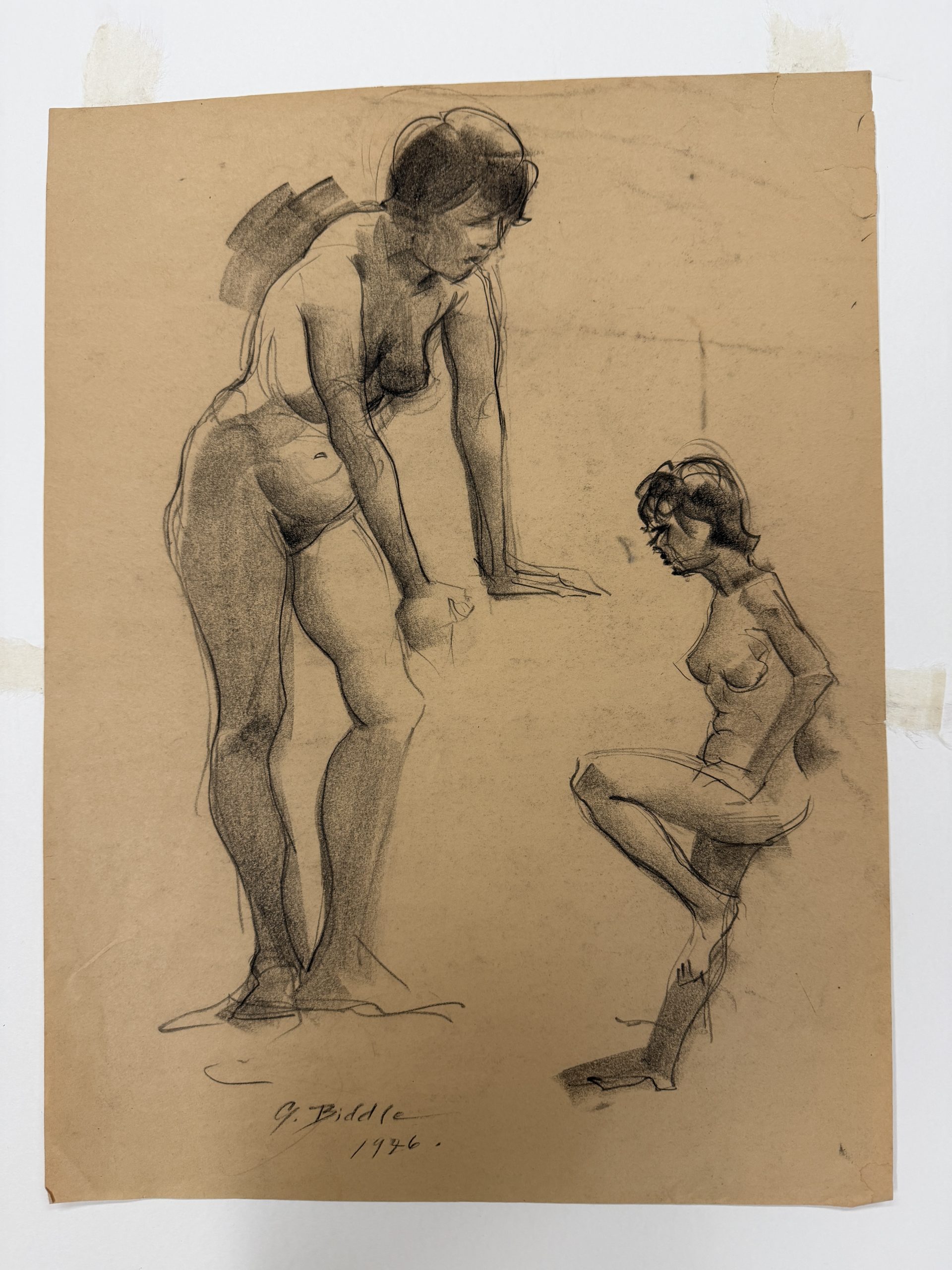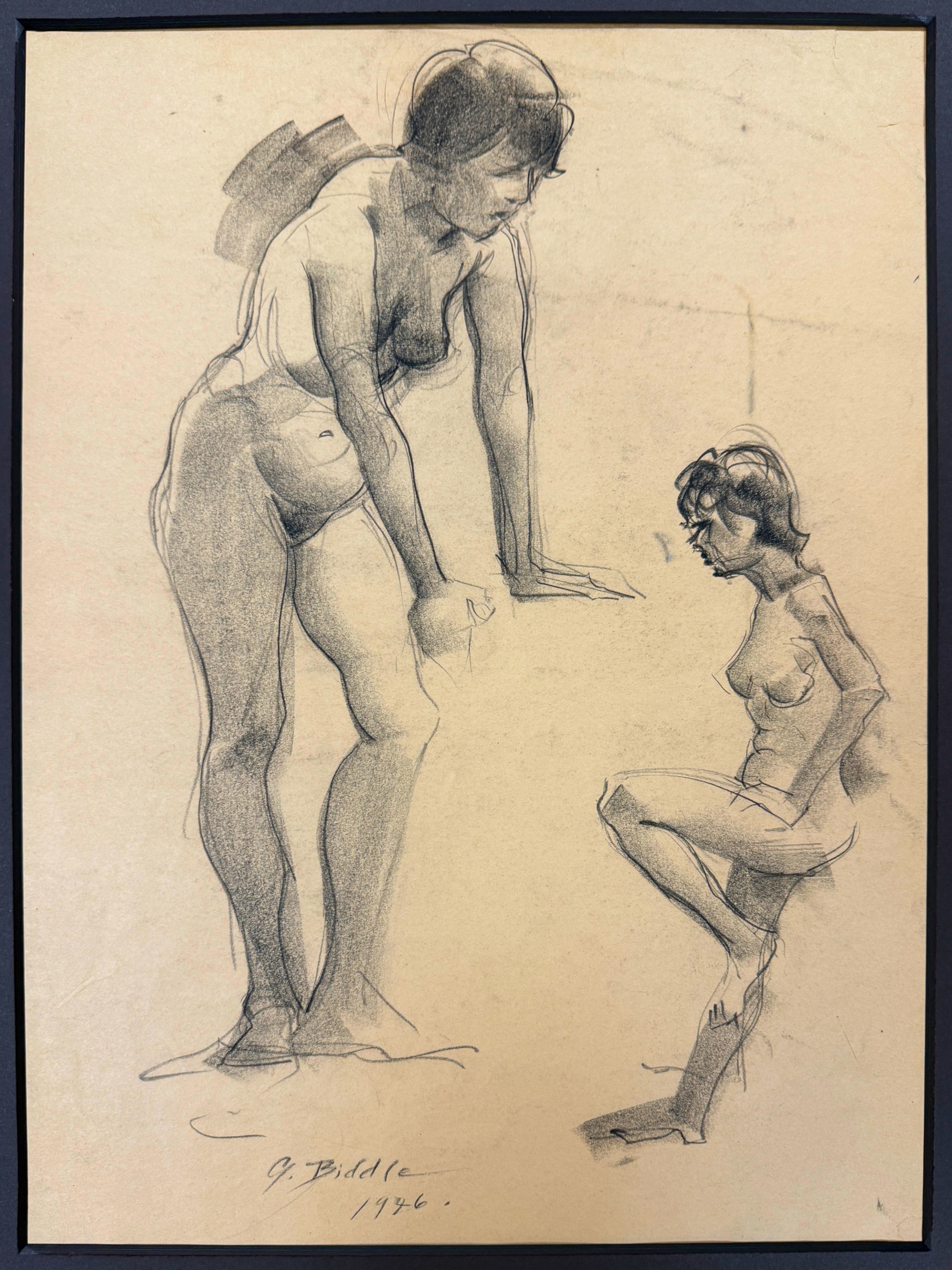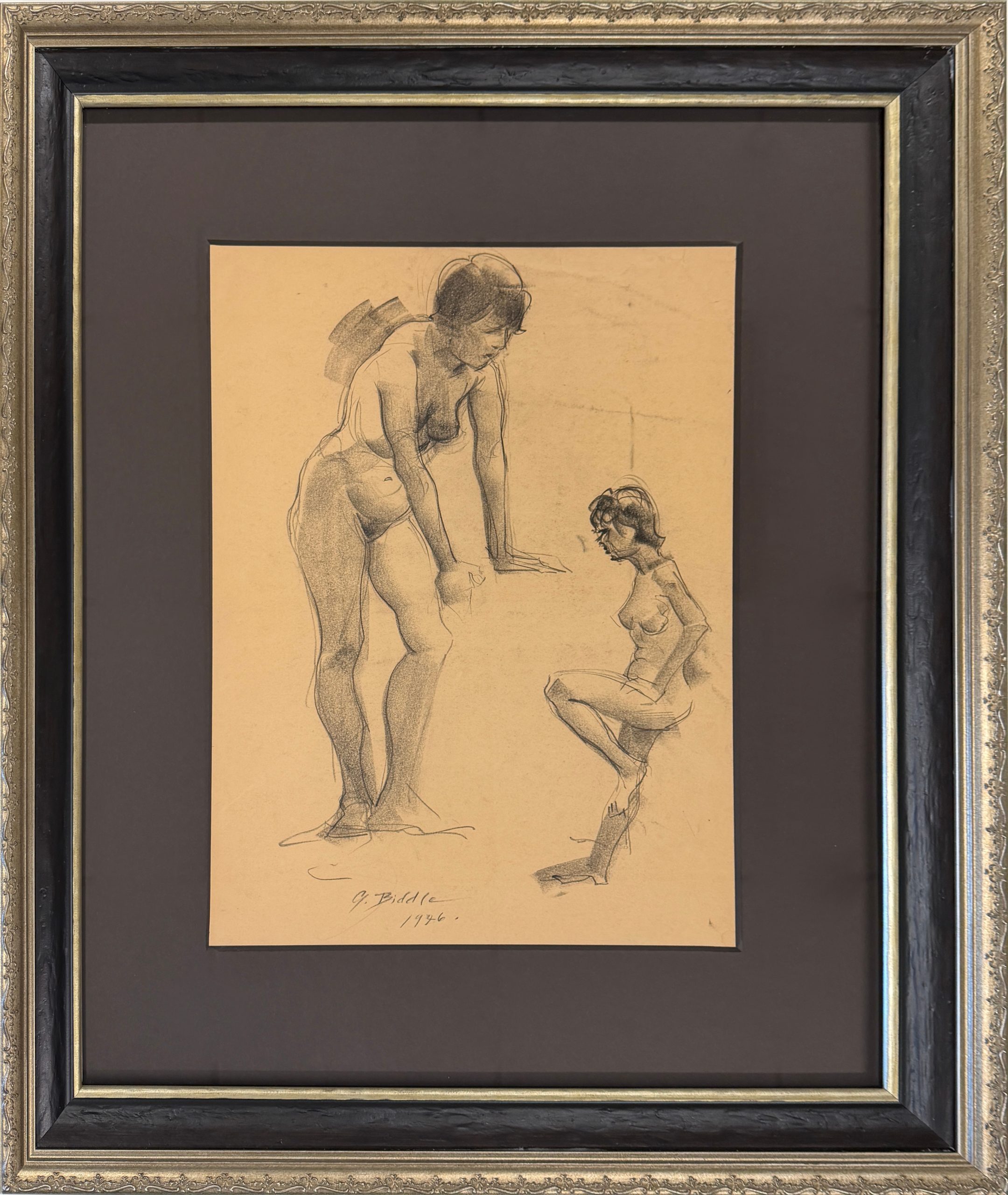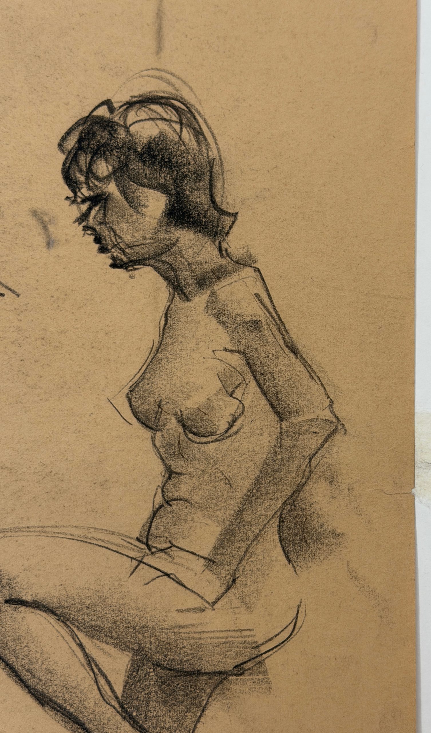 An academic drawing of a female nude, appearing twice on the sheet, executed in charcoal on brown paper. The work is a superb demonstration not only of Sterne’s extraordinary facility and skill but also of the academic’s approach to drawing—and a beautiful picture beyond all that.