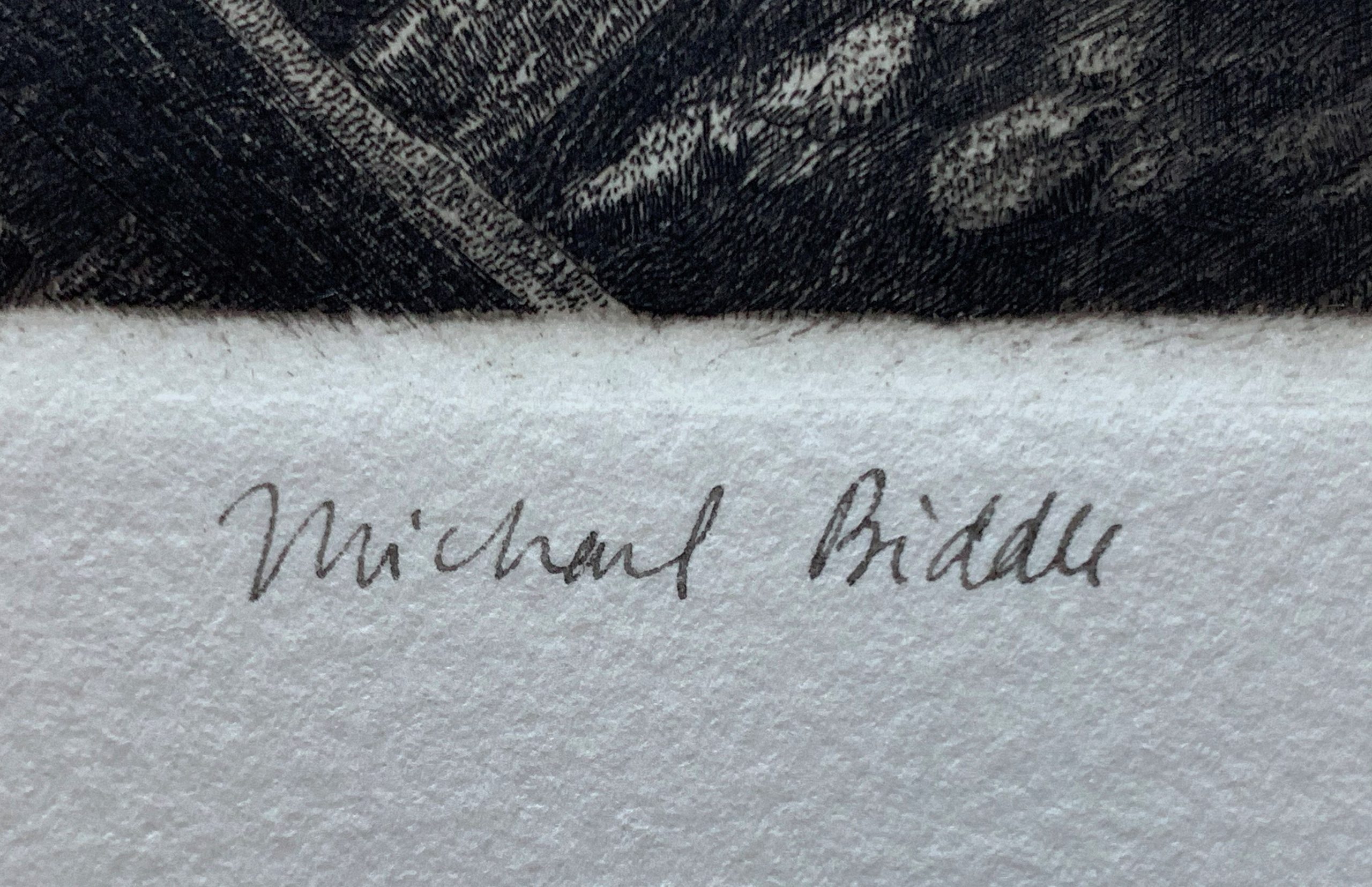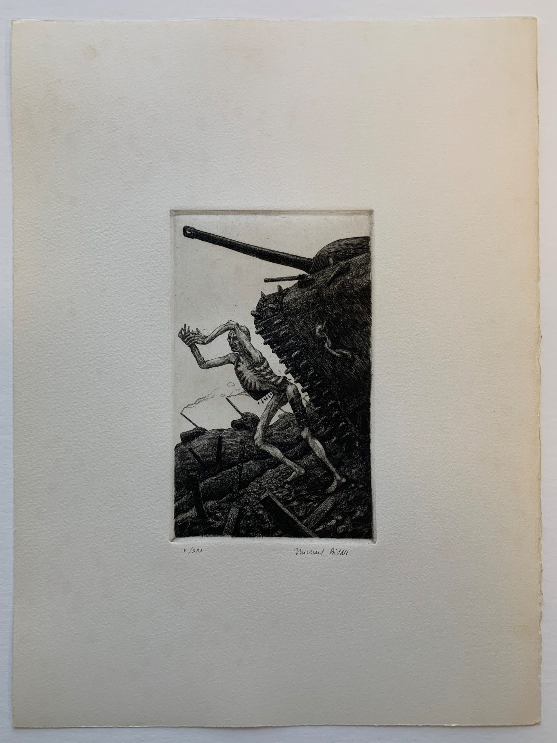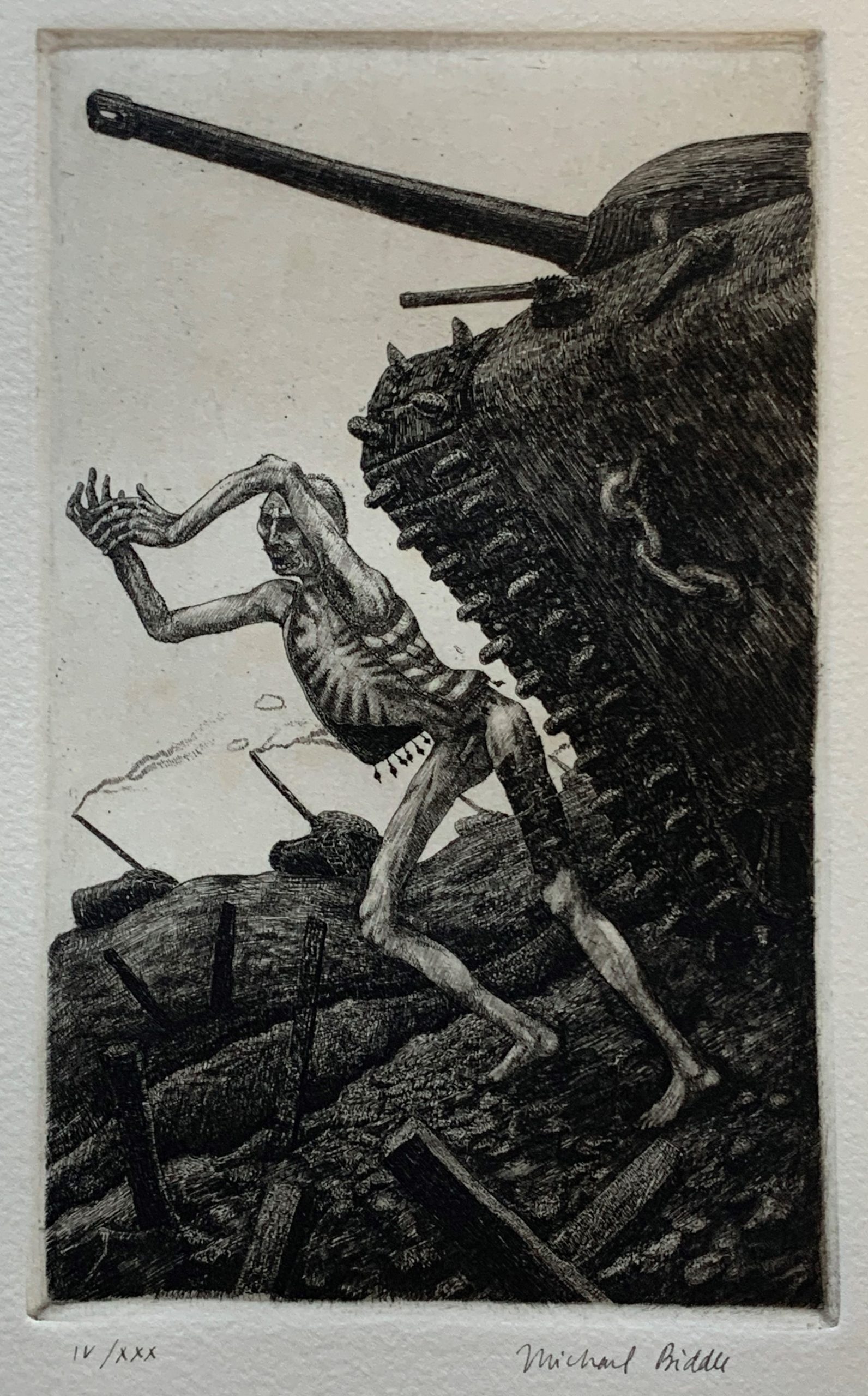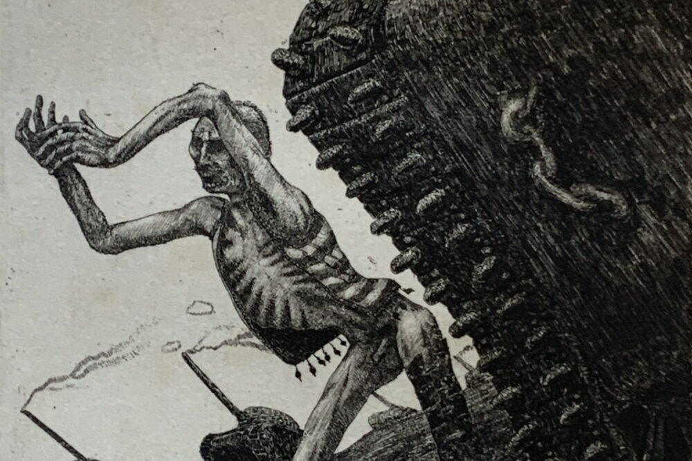 Biddle’s work has often been compared to that of Hieronymus Bosch, the late-Fifteenth Century artist who used fantastic illustrations of religious concepts and narratives to describe his vision of humanity’s desires and deepest fears. In the Victims Portfolio, Biddle portrays humanity’s deepest failures. This etching is a breathtaking depiction of suffering and agony.