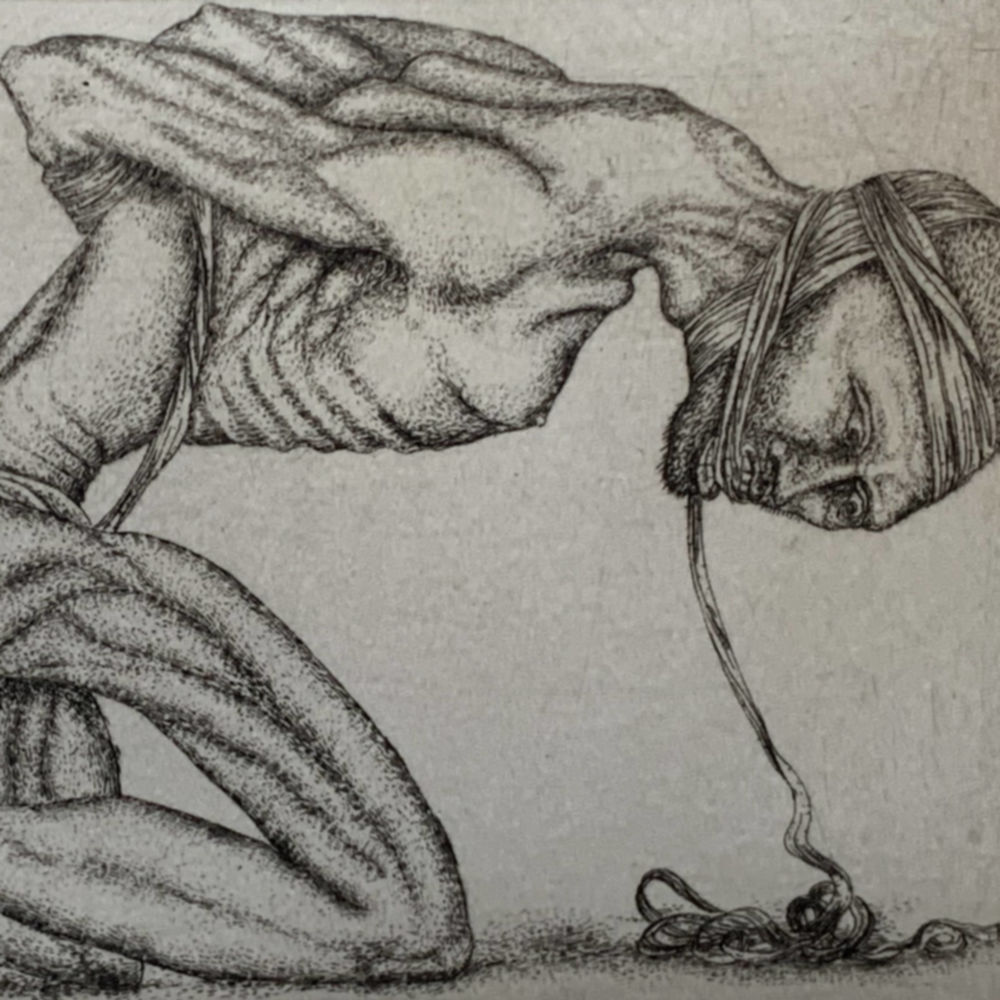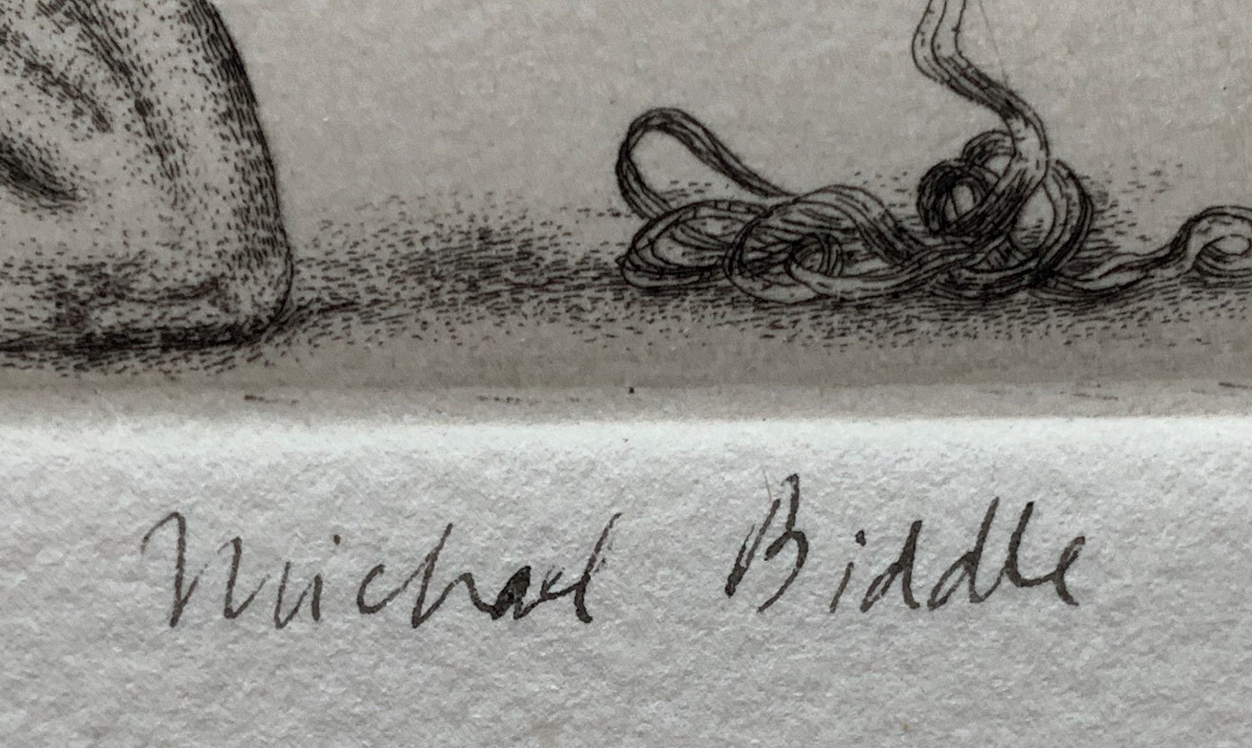 Biddle’s work has often been compared to that of Hieronymus Bosch, the late-Fifteenth Century artist who used fantastic illustrations of religious concepts and narratives to describe his vision of humanity’s desires and deepest fears. In the Victims Portfolio, Biddle portrays humanity’s deepest failures. This etching is a breathtaking depiction of suffering and agony.
