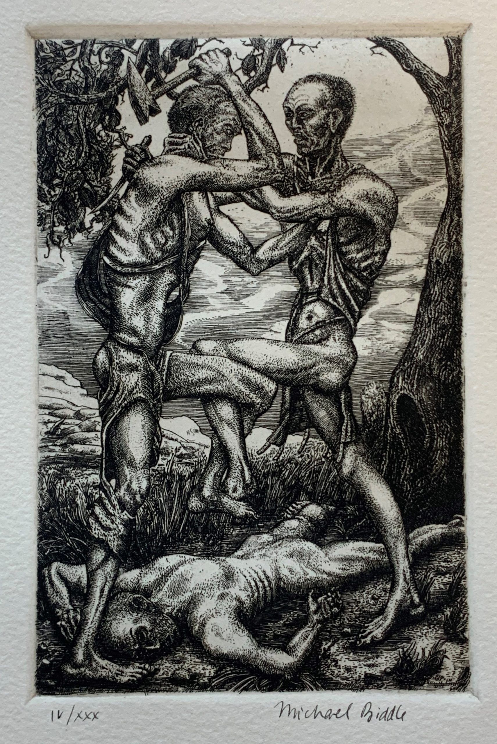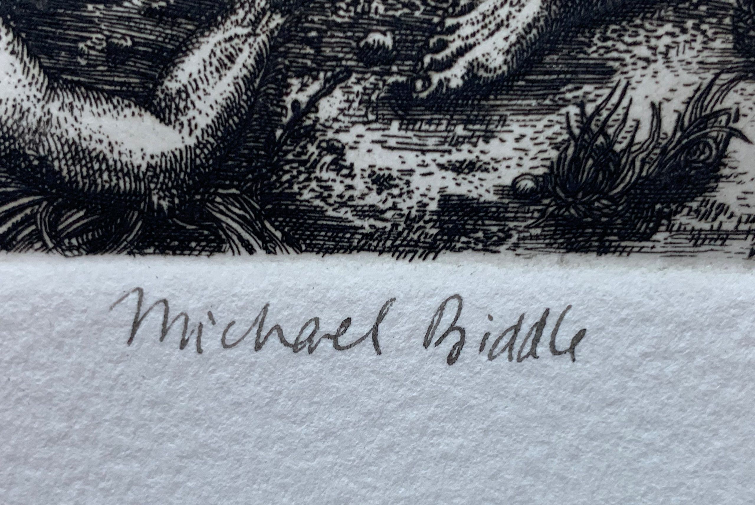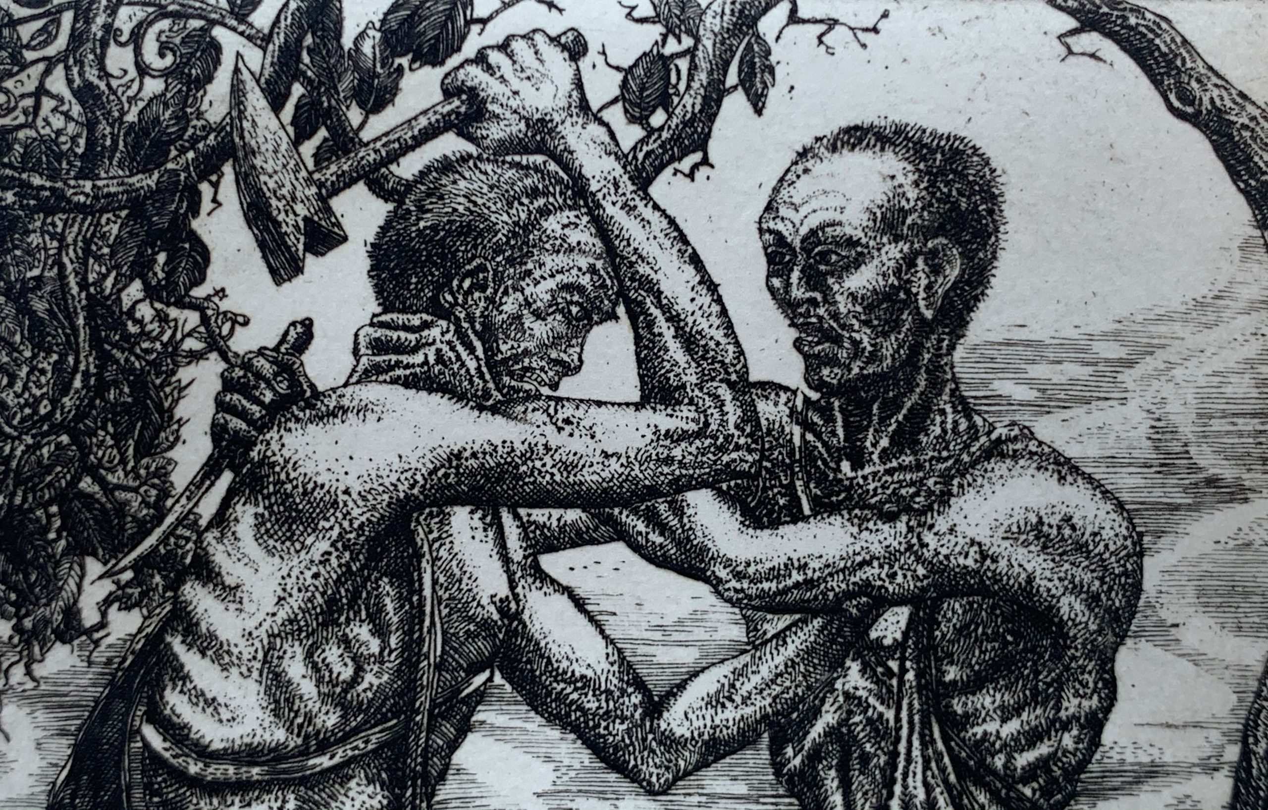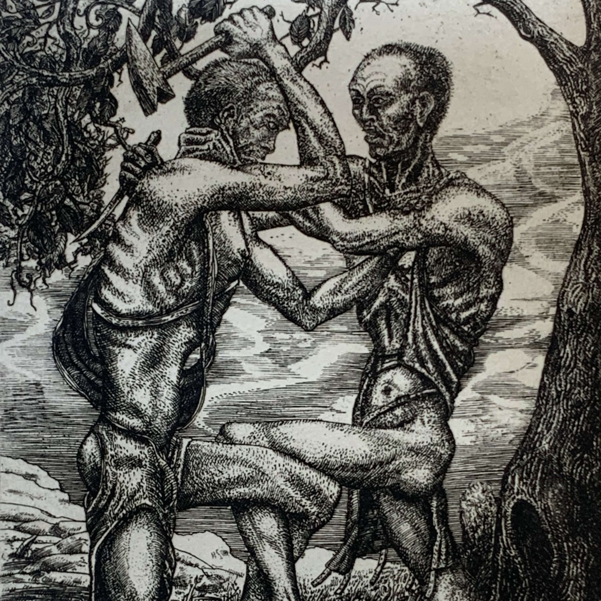 Biddle’s work has often been compared to that of Hieronymus Bosch, the late-Fifteenth Century artist who used fantastic illustrations of religious concepts and narratives to describe his vision of humanity’s desires and deepest fears. In the Victims Portfolio, Biddle portrays humanity’s deepest failures. This etching is a breathtaking depiction of suffering and agony.