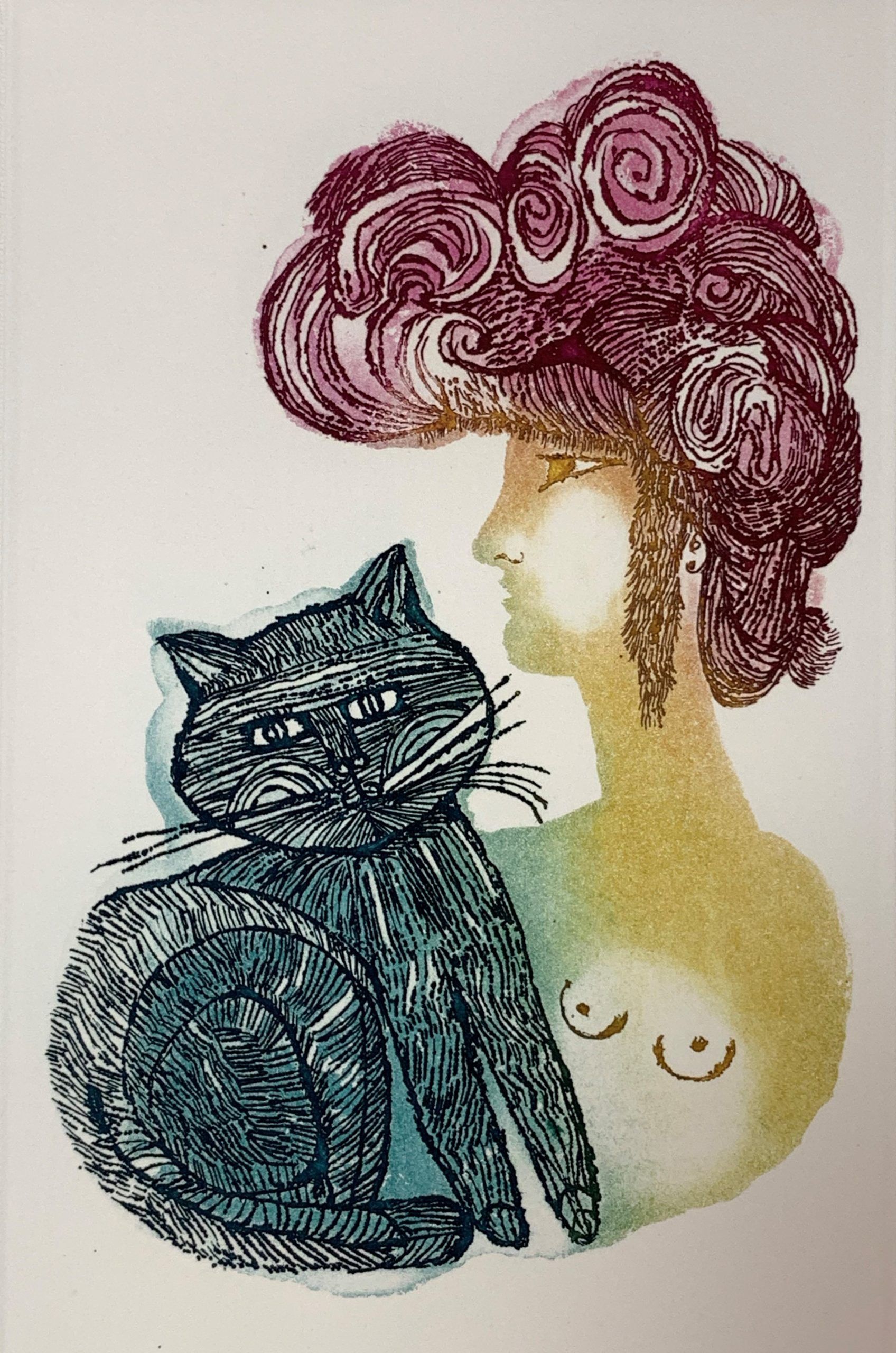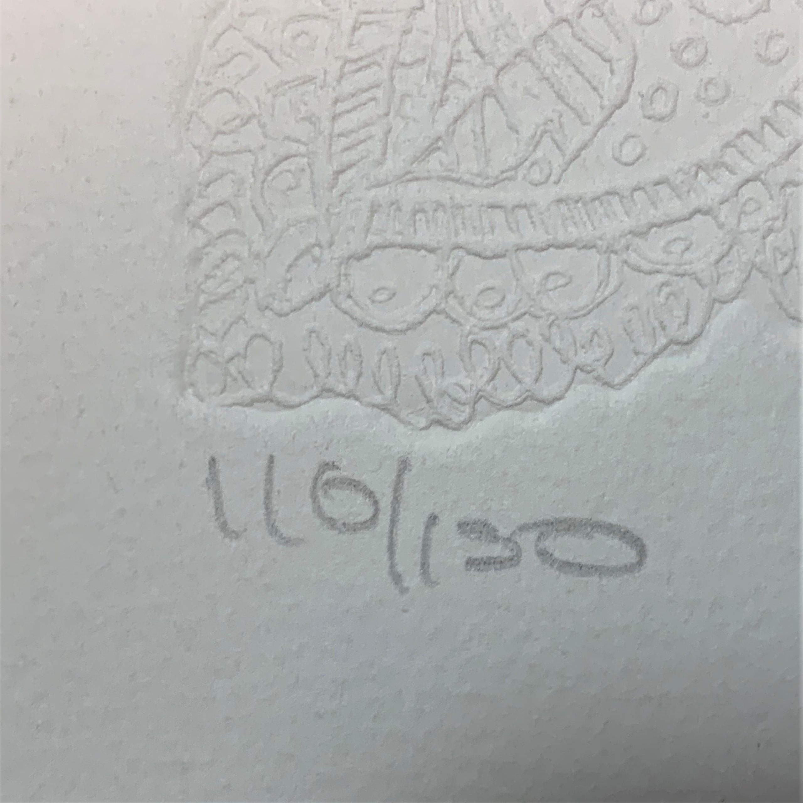 Etching in colors from copper plates printed on Vélin d’Arches, with a beautiful blind-embossed lace border.