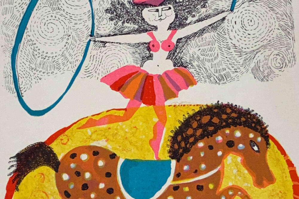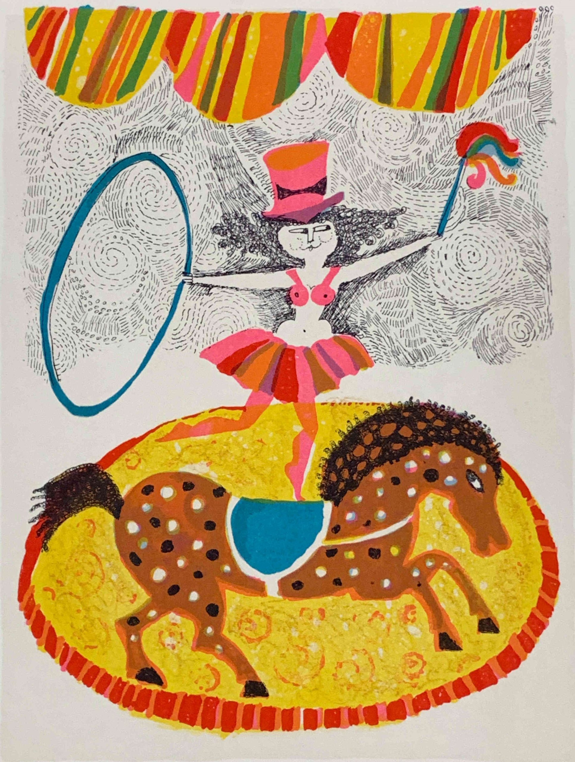Balancing on her toe on the saddle of her horse, the acrobat waves a hoop as the horse circles the ring.
