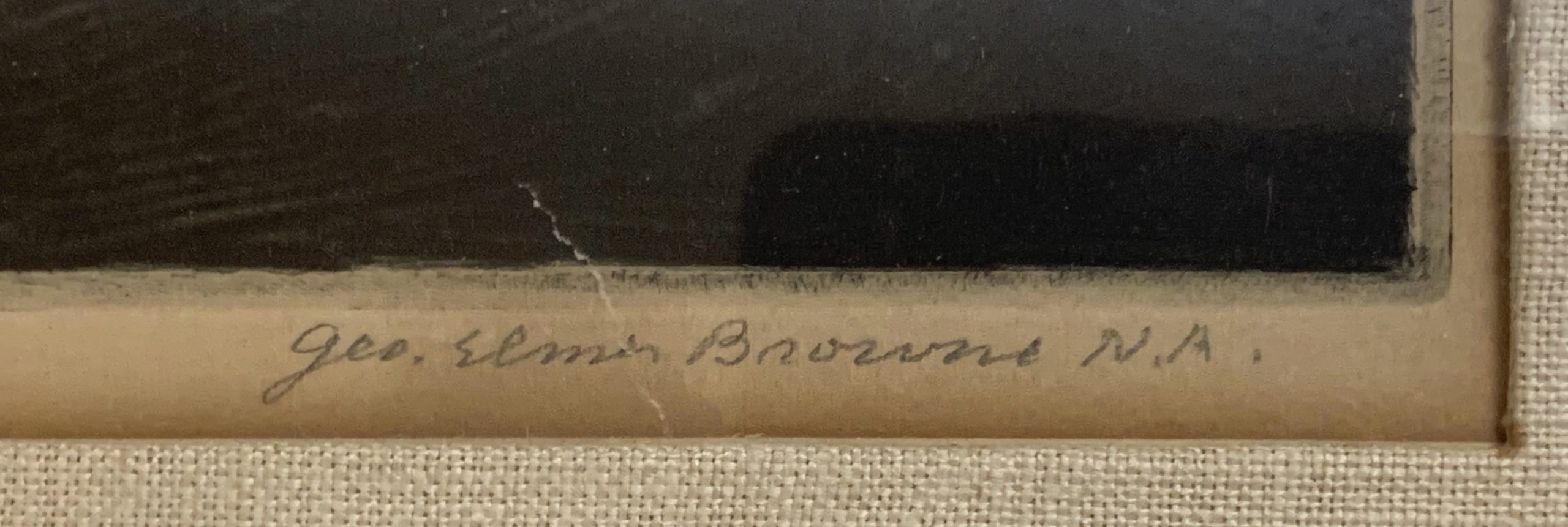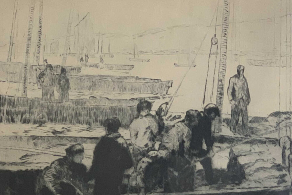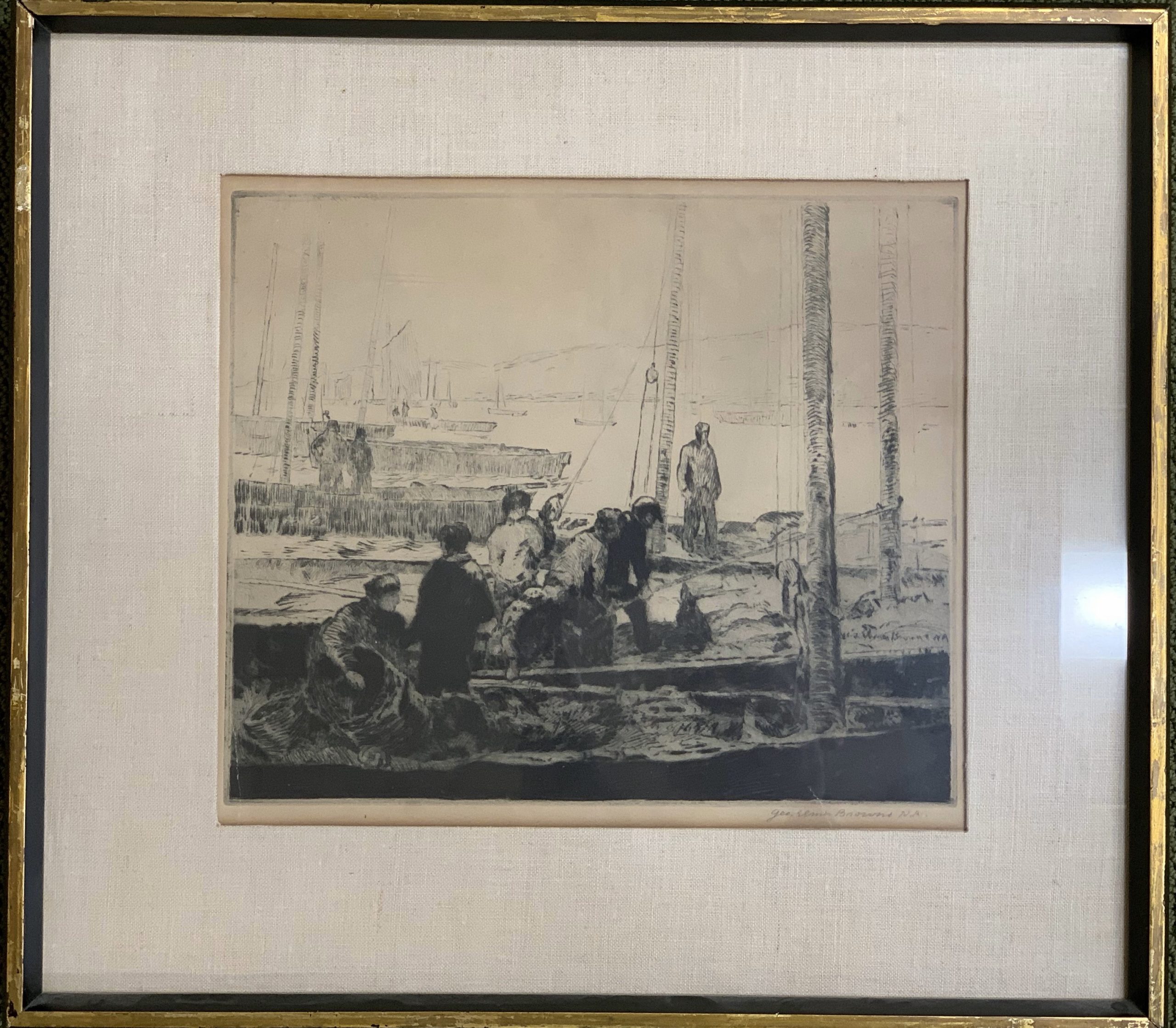 This work by the Massachusetts artist George Elmer Browne is a particularly fine example of drypoint etching. The shadowy images of men working and boats in the bay set the mood.