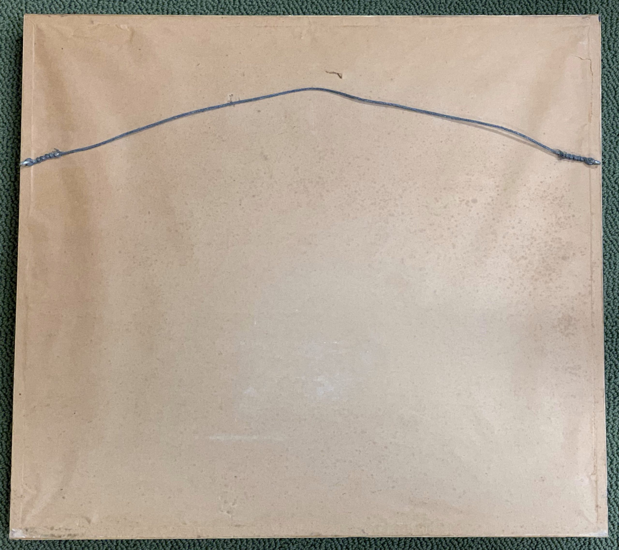 Framed in a fine heavy black frame with gilt-painted front edge and behind a fabric-wrapped mat. The frame shows its age but remains well-suited to the work.