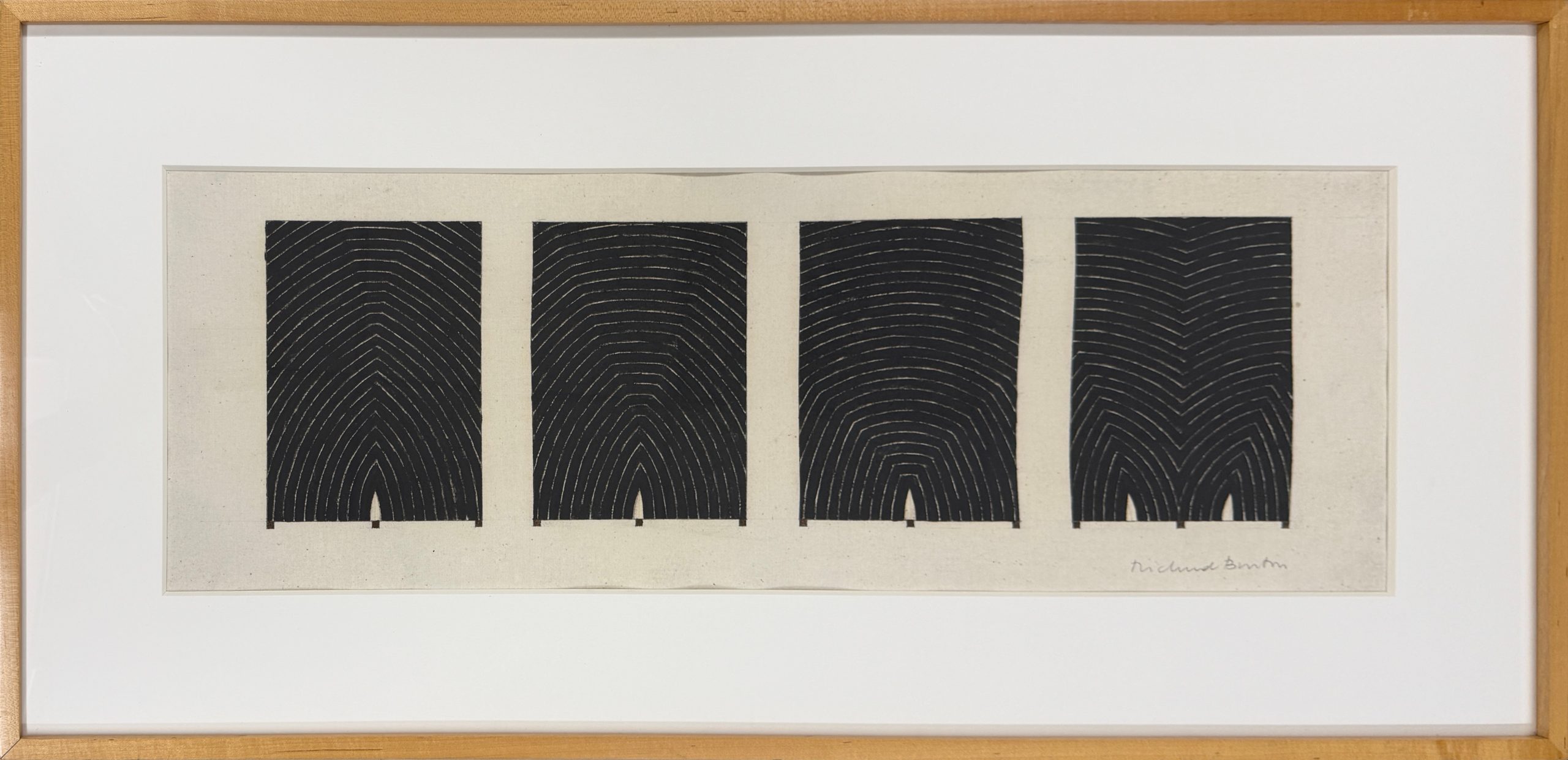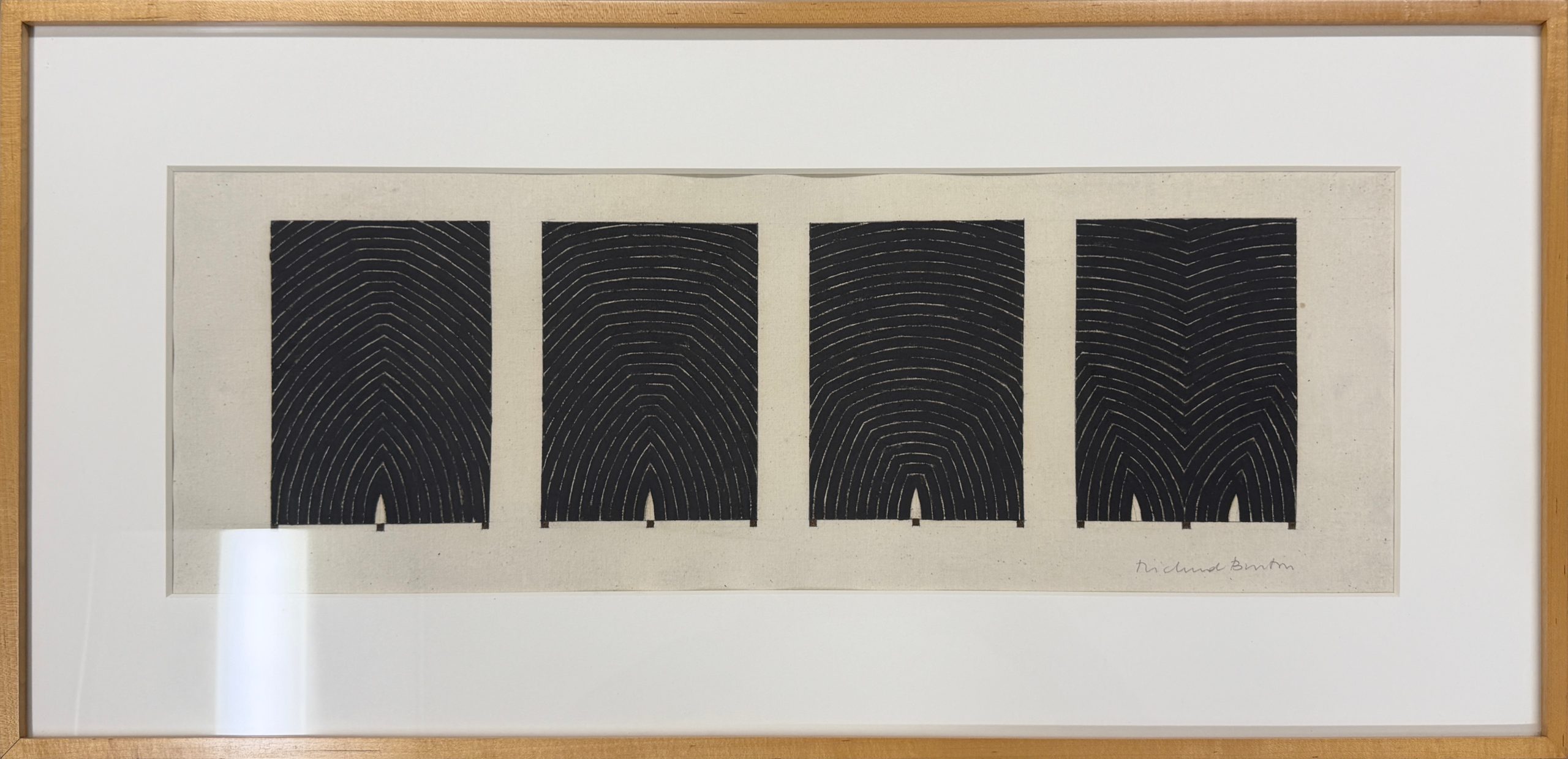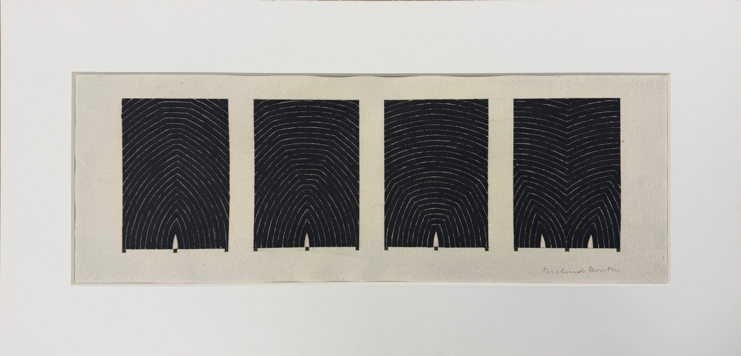 Richmond Burton spent years developing his Thought Plane series, in which he used black stripes to explore space, shape, and energy. The Thought Plane paintings were an homage to Frank Stella’s early canvases. They are structured, rhythmic, entrancing; small changes in arc and shape give the entire work energy and motion.