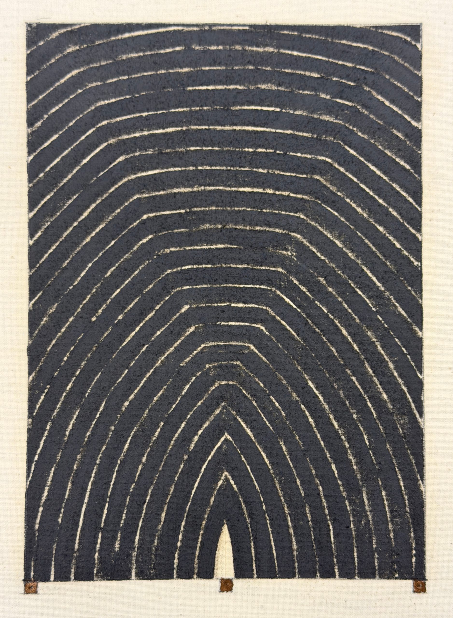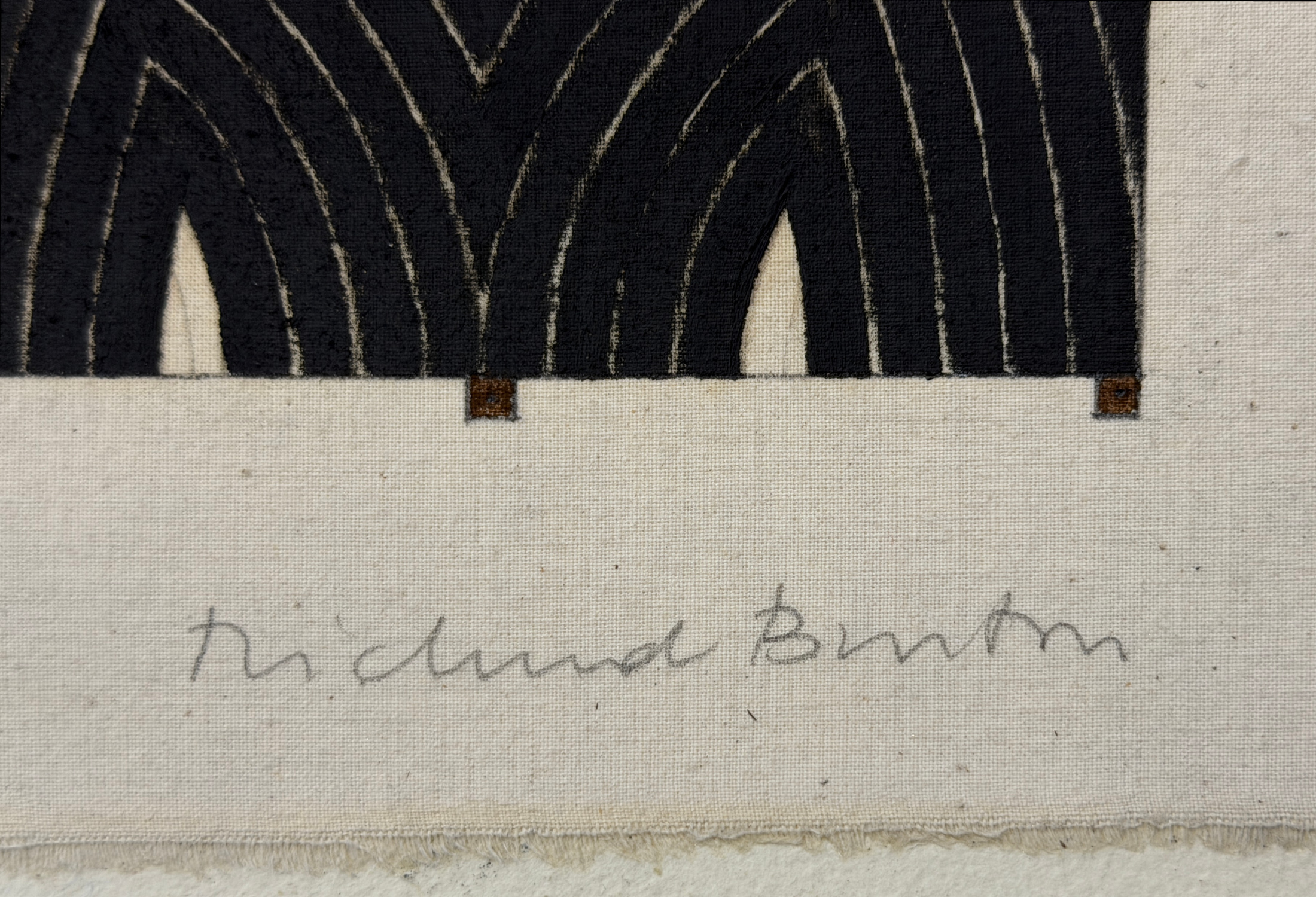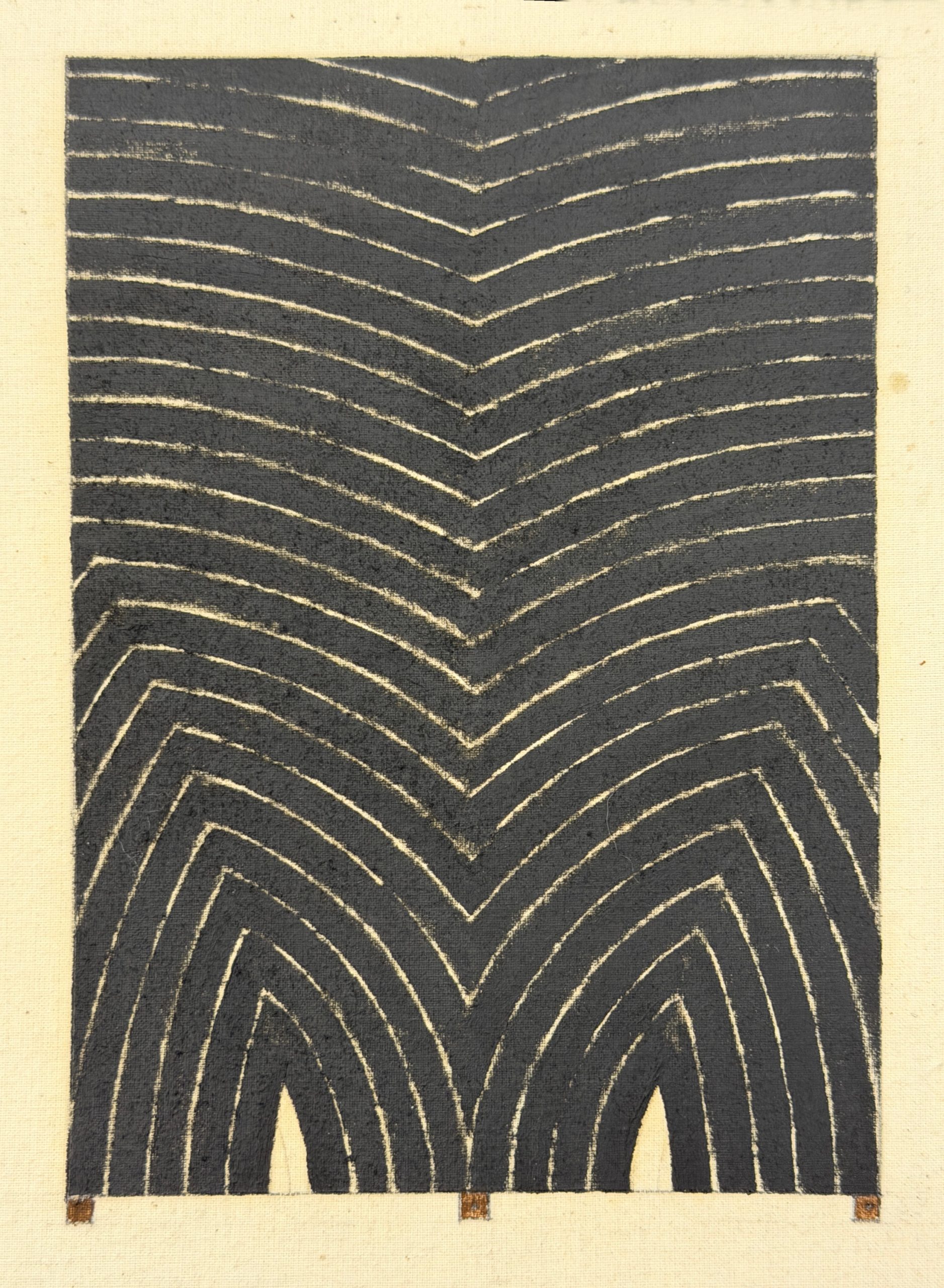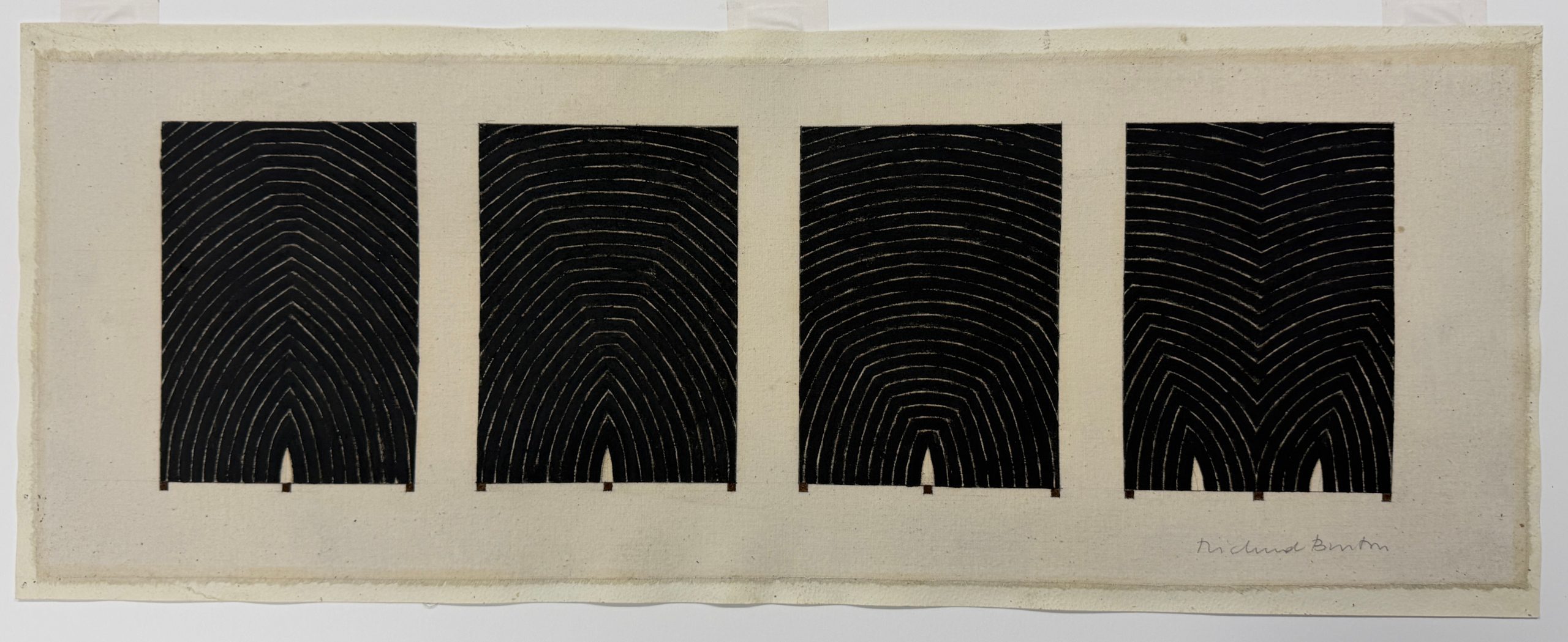 Richmond Burton spent years developing his Thought Plane series, in which he used black stripes to explore space, shape, and energy. The Thought Plane paintings were an homage to Frank Stella’s early canvases. They are structured, rhythmic, entrancing; small changes in arc and shape give the entire work energy and motion.