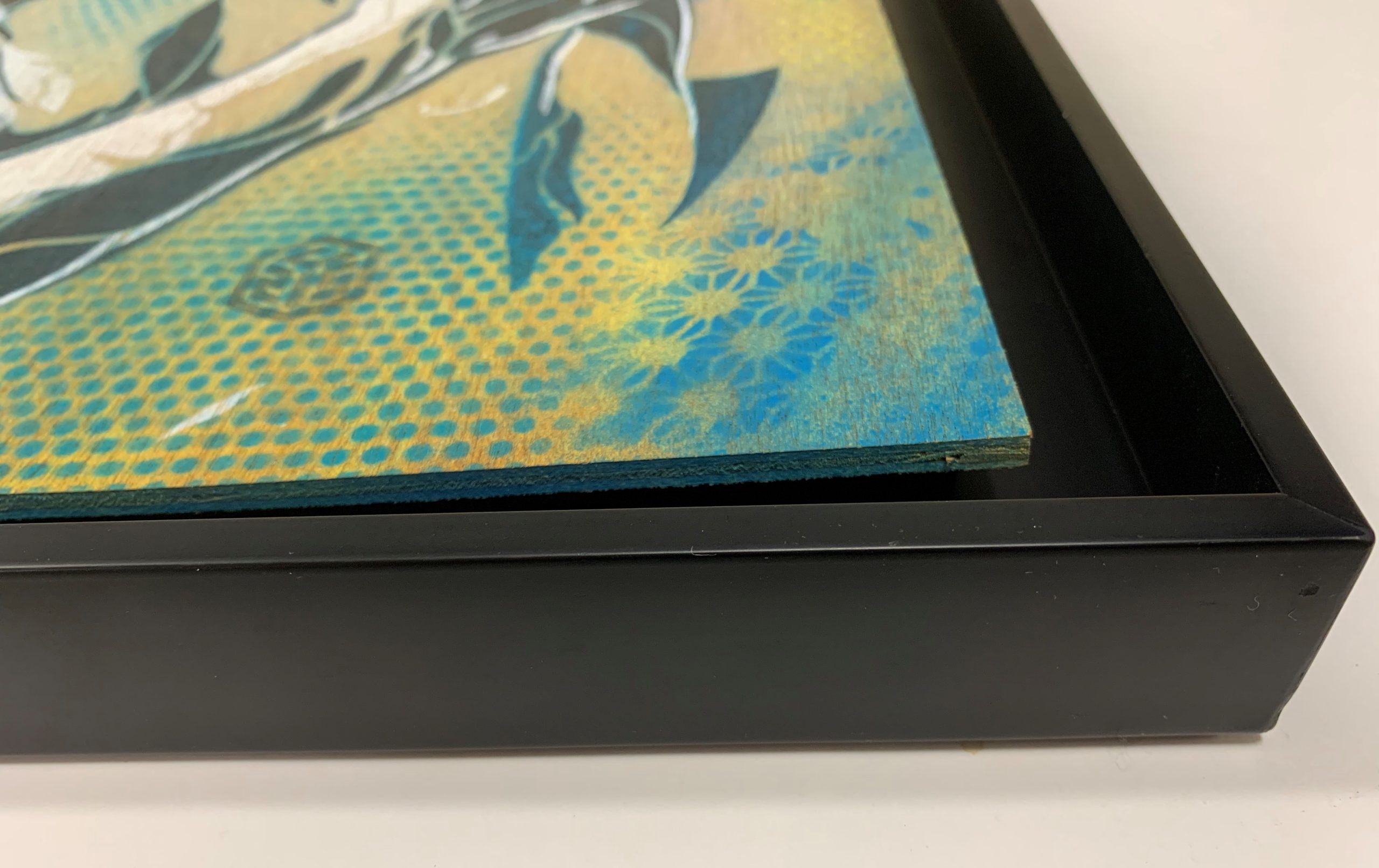 Float framed in a black-painted wood frame.