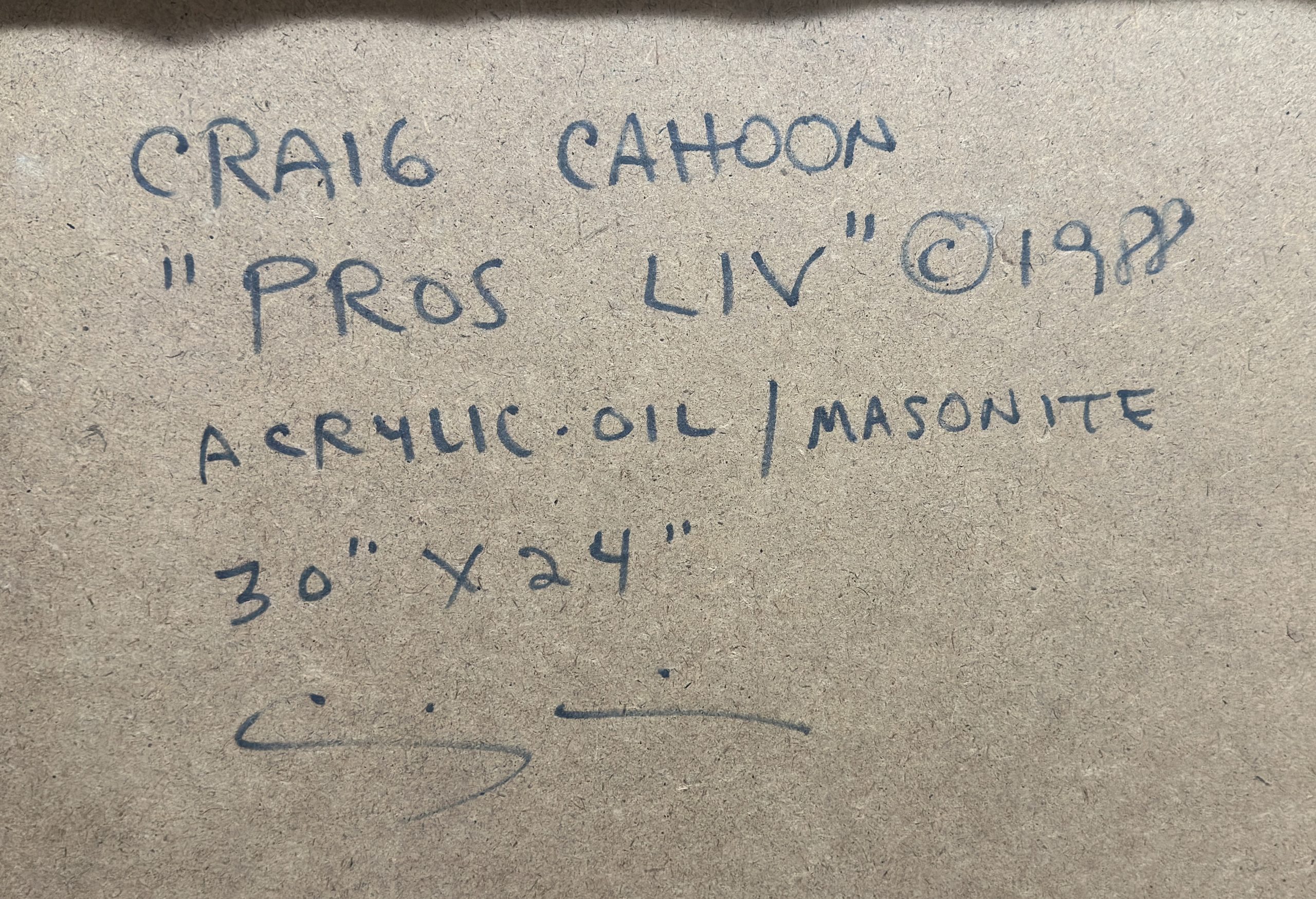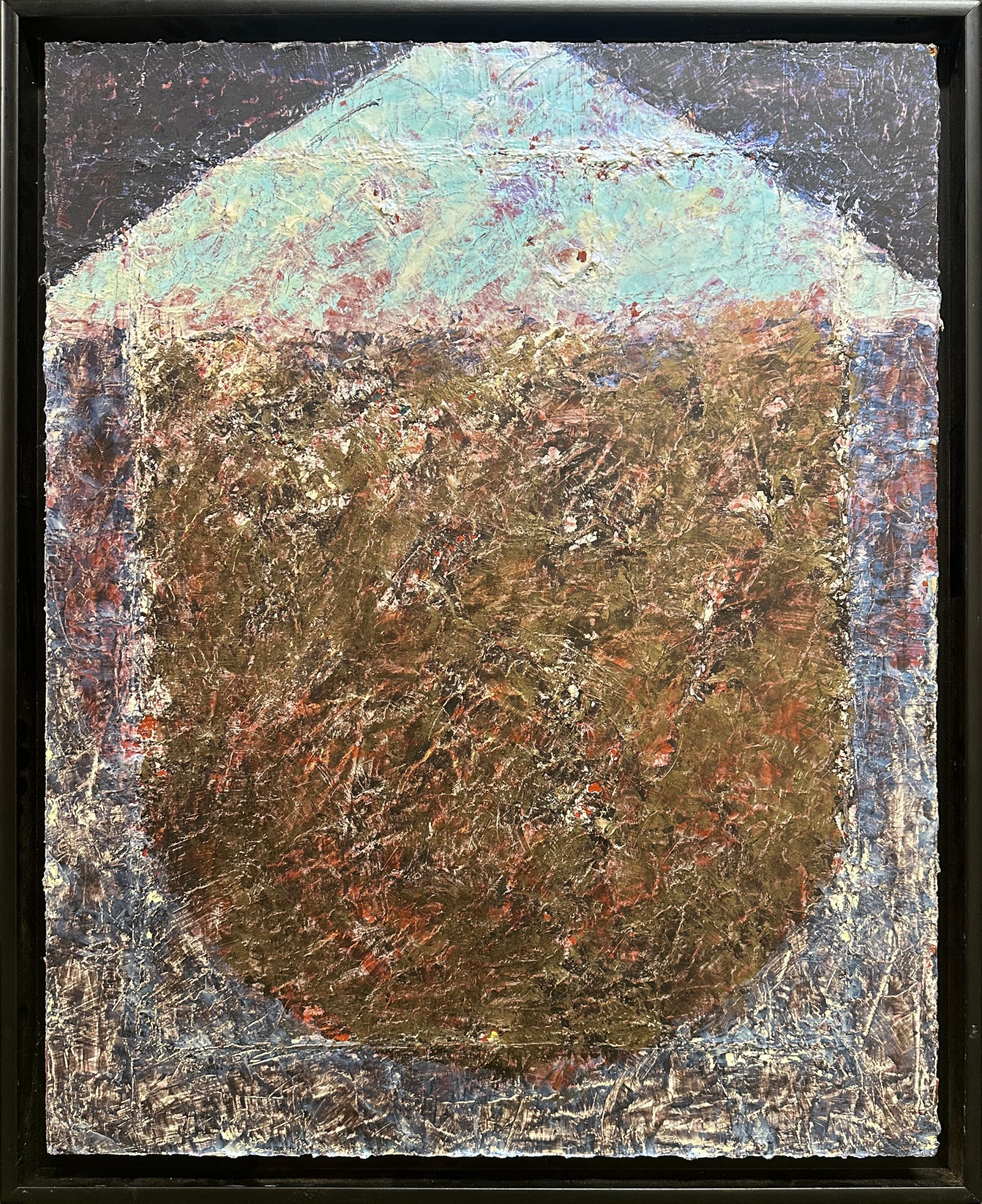 Craig Cahoon is an experimental painter whose work has always reflected an examination of the effect of light on texture and surface. His intellectual focus is on the universality and timelessness of humans’ search for meaning amid the uncertainty of constant change, so he aims to convey the tension of being in a liminal space–that edge between the known and unknown. This is clear in his works where you see a different set of colors and textures from one angle than you do from another (an effect he has amplified in his current work, in which he uses “interference paint,” consisting of paints that incorporate titanium-coated mica flakes). This work—like much of his body of work—has a clearly-perceptible three-dimensionality—which, unfortunately, just does not come clear in photographs. This work remains in its original frame.