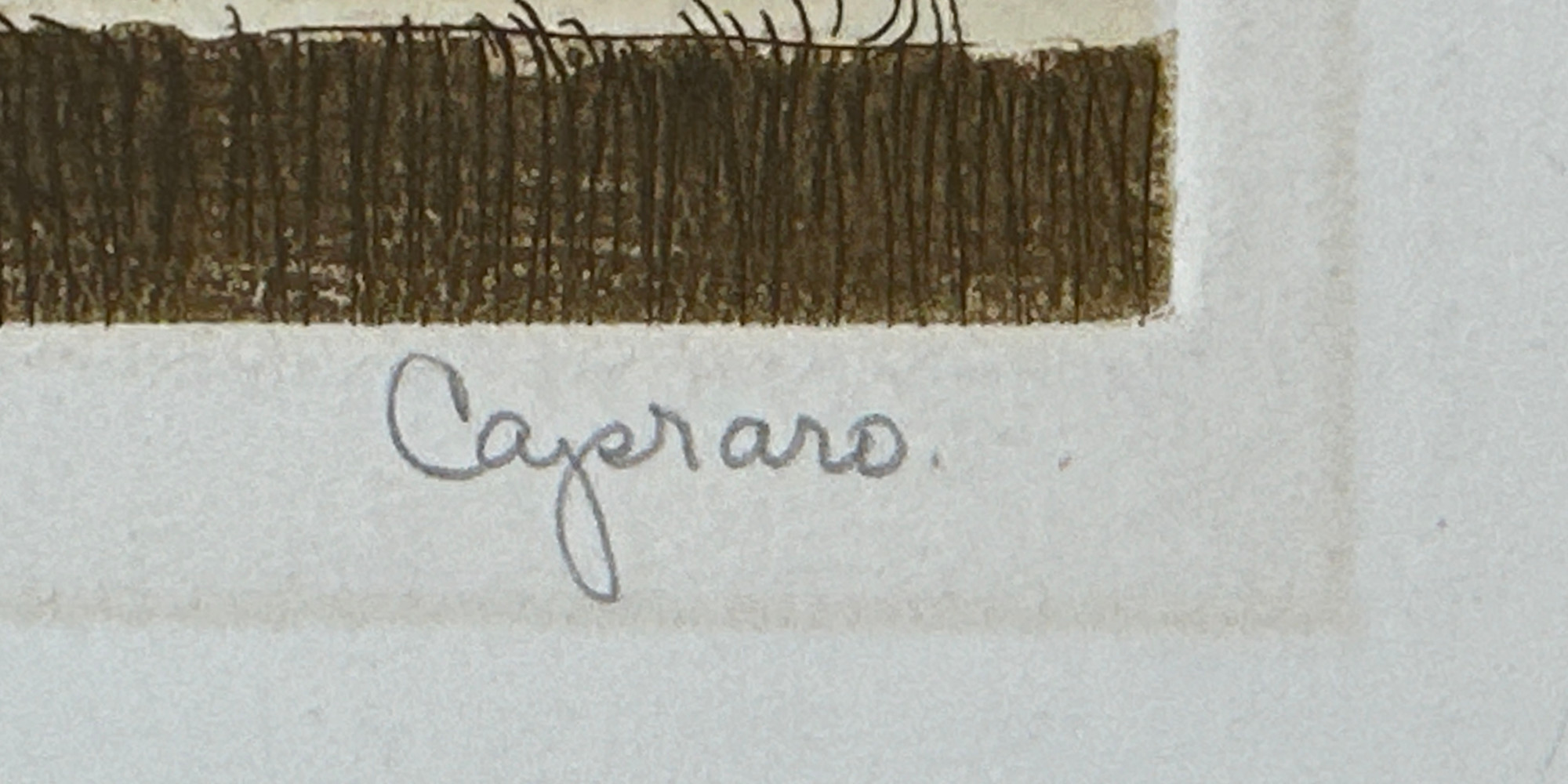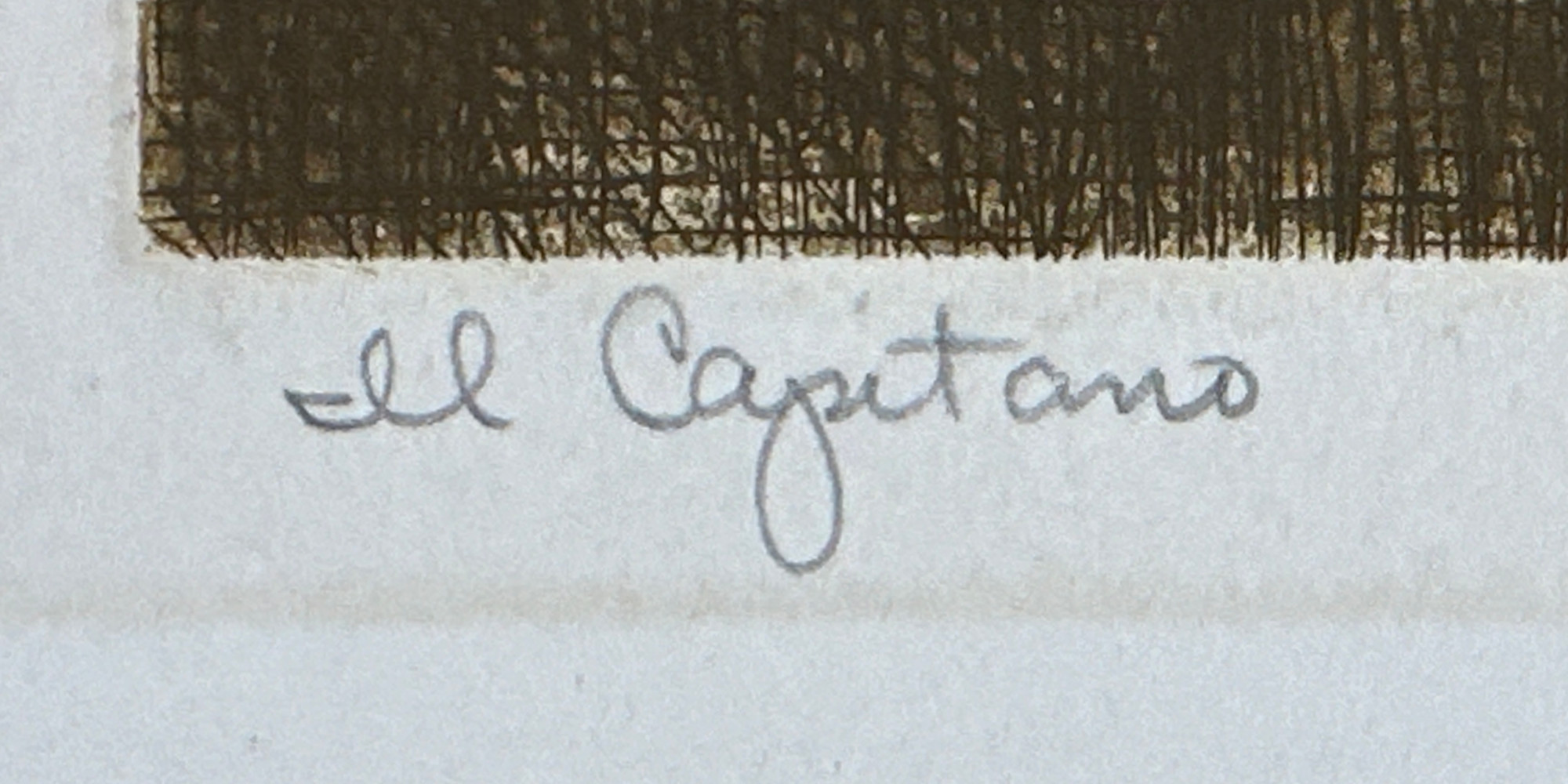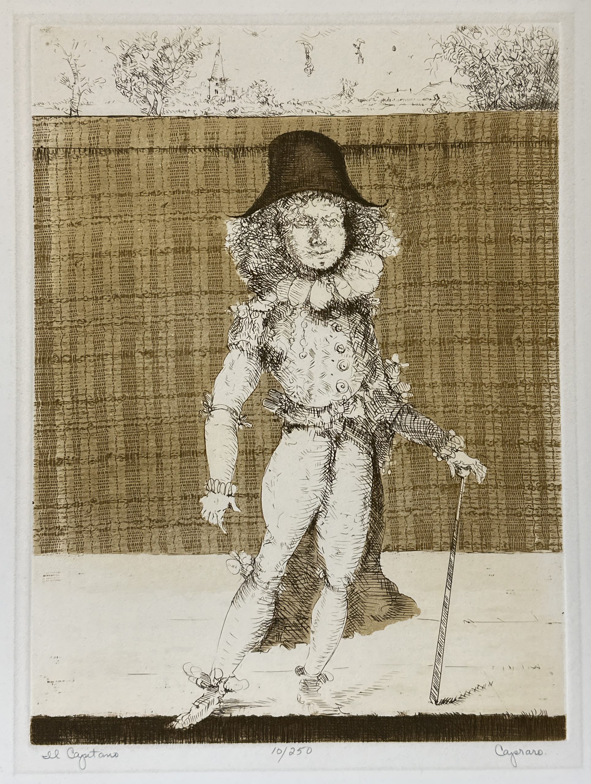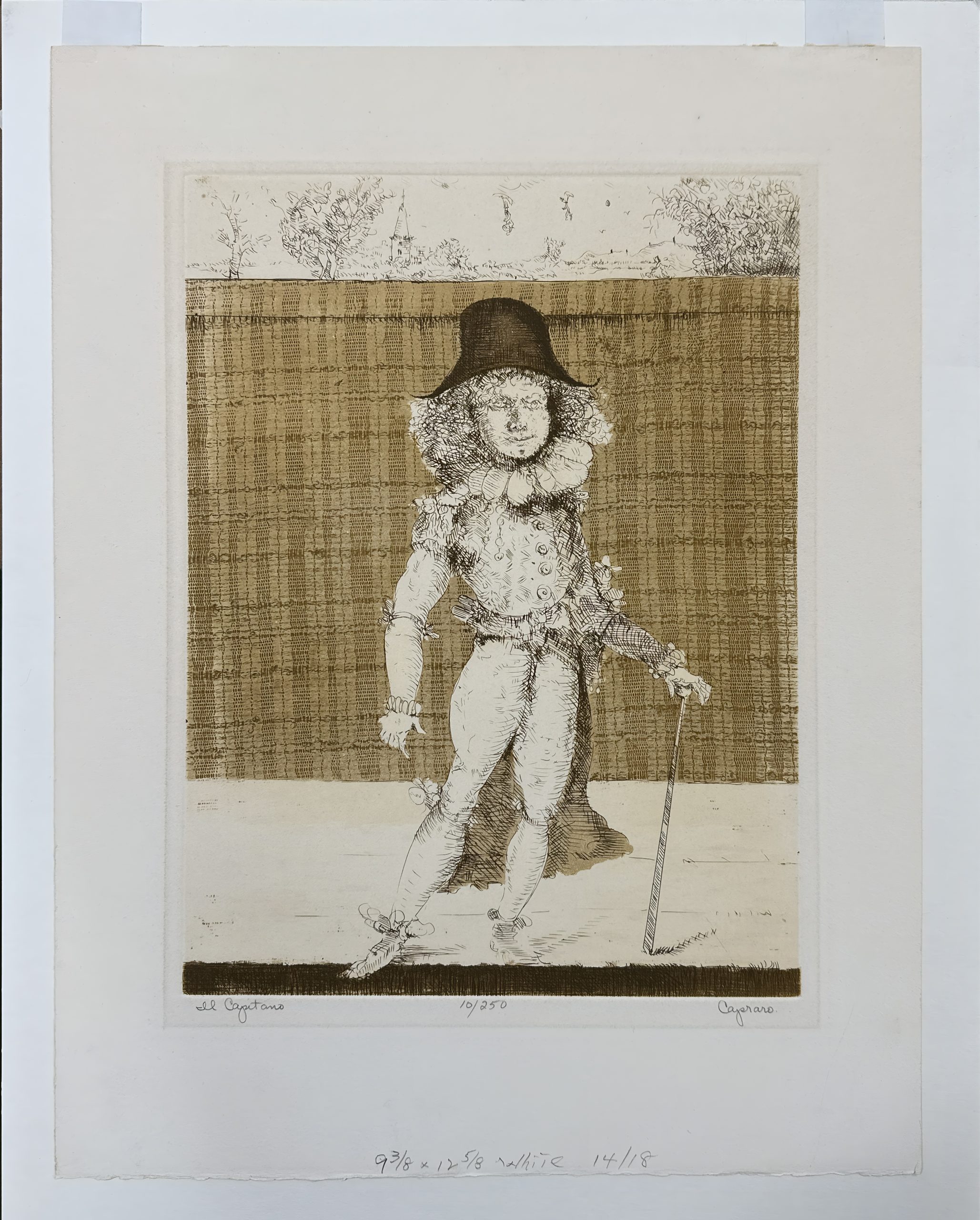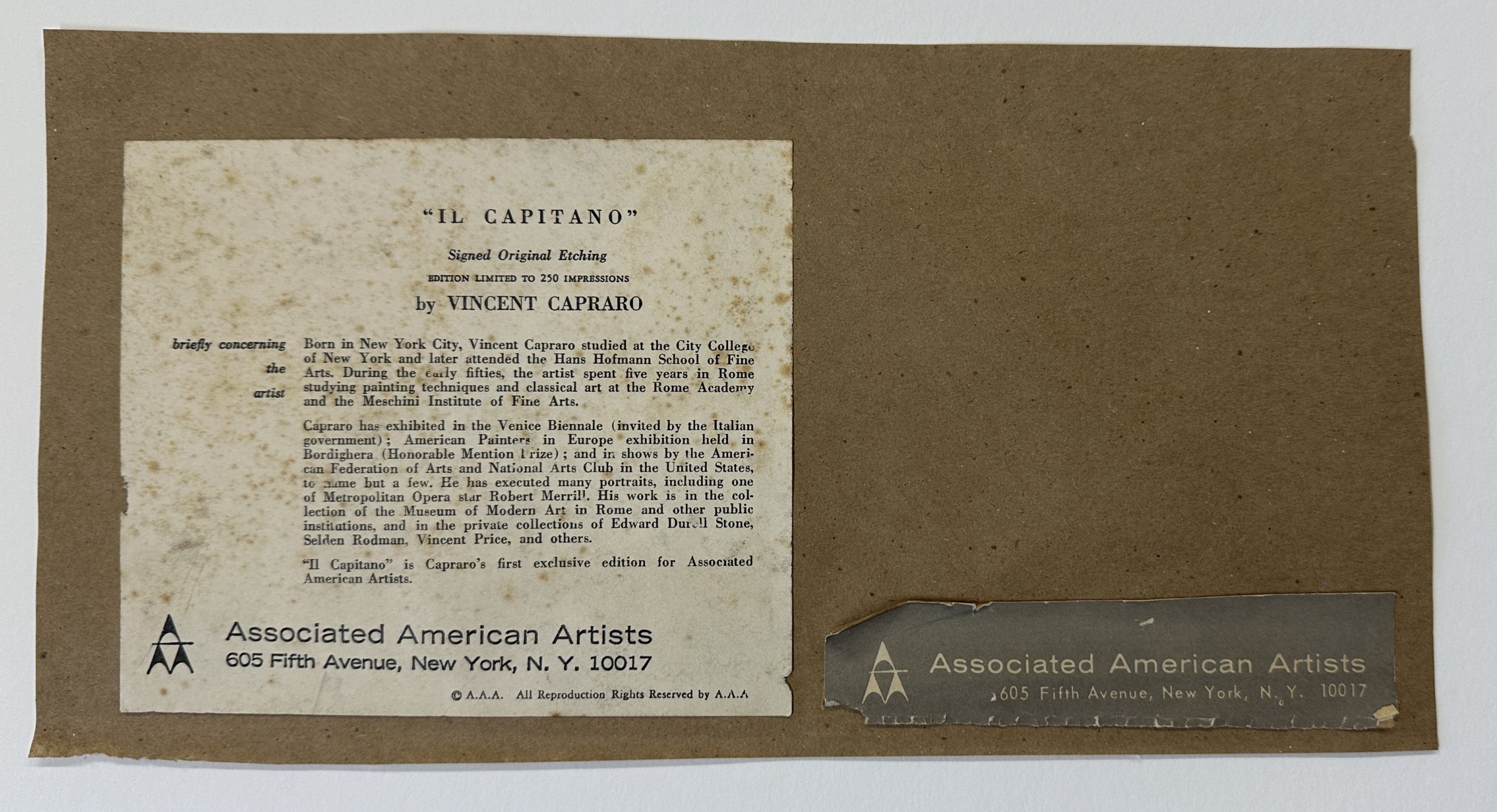 Vincent Capraro’s Il Capitano was from his suite of six color etchings called Commedia dell’arte. It was first published in 1968 pursuant to an agreement between Capraro and Associated American Artists to publish Commedia dell’arte as a suite, but the suite was not published until the 1981 edition of 100 impressions sold by Emiliano Sorini, New York. This copy of Il Capitano is from the 1968 edition.