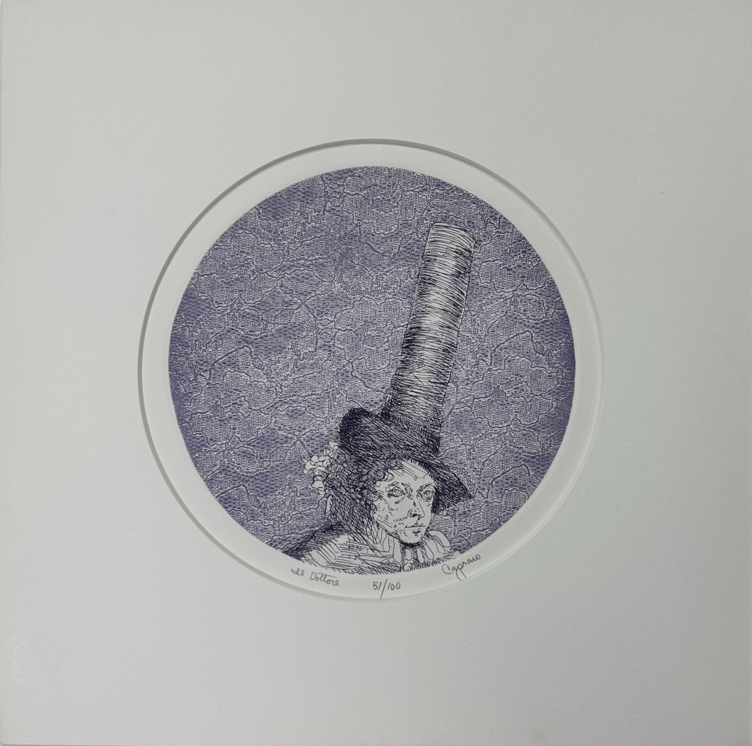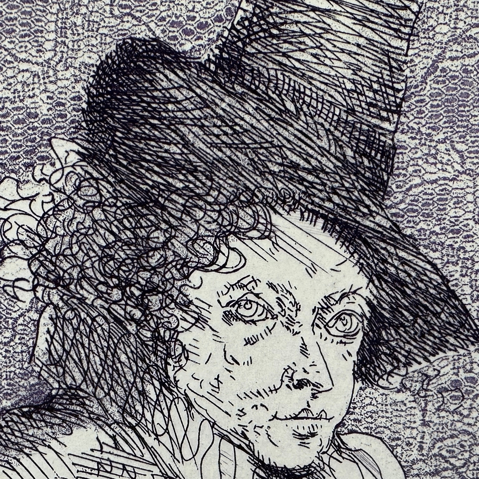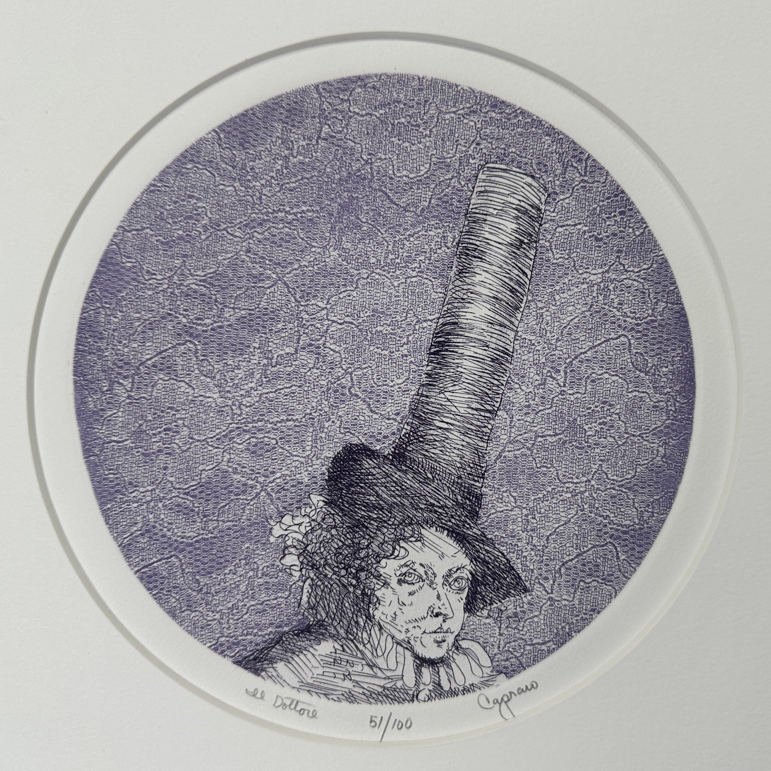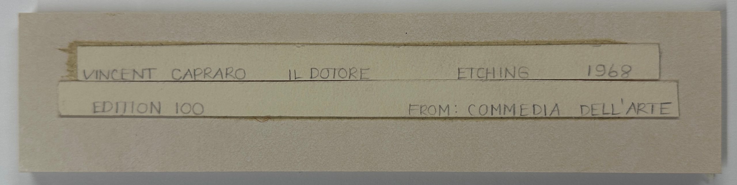 One of six vintage and matching pieces of color etchings from a portfolio for the Commedia Dell’Art.