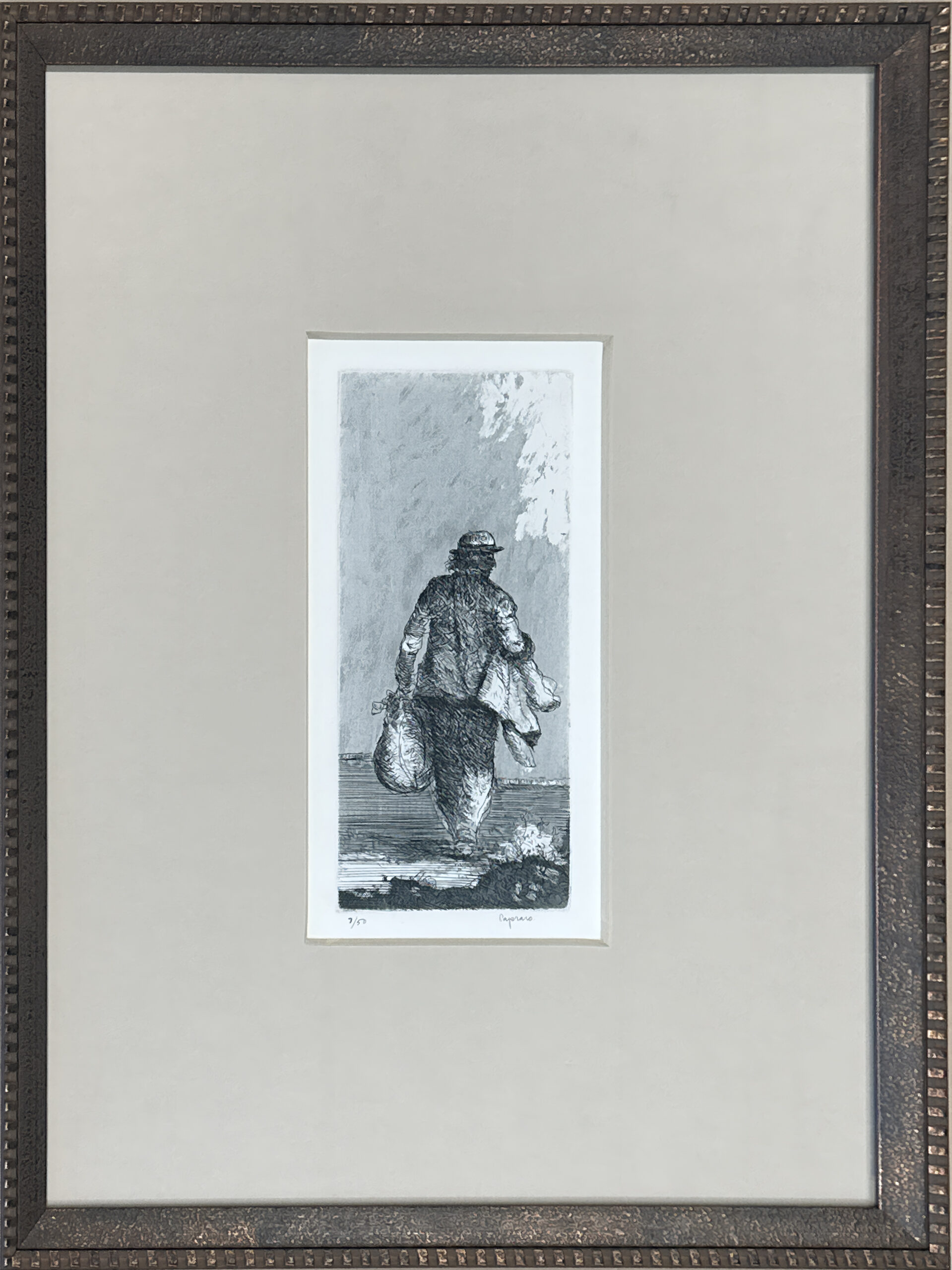 Custom framed using strictly conservation-grade materials in a wood frame with an eight-ply mat behind 99% UV-blocking art glass.