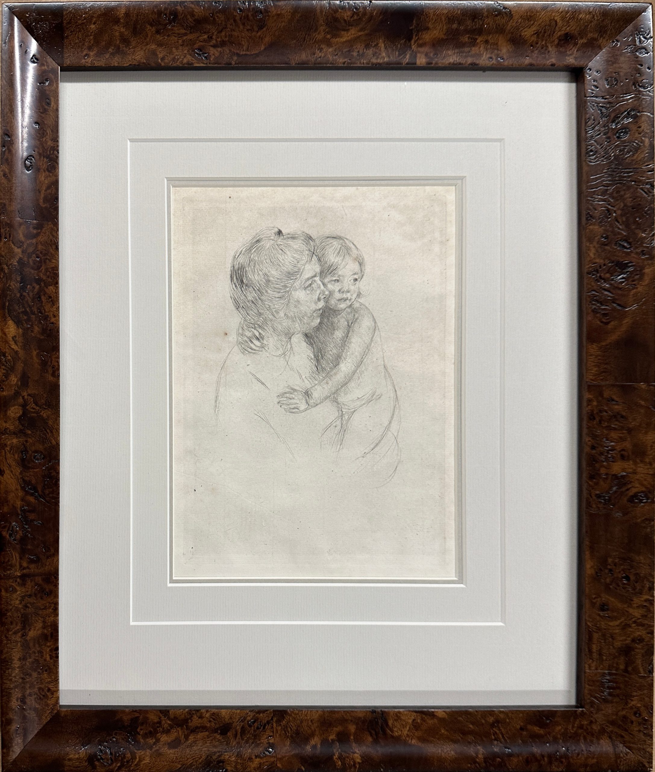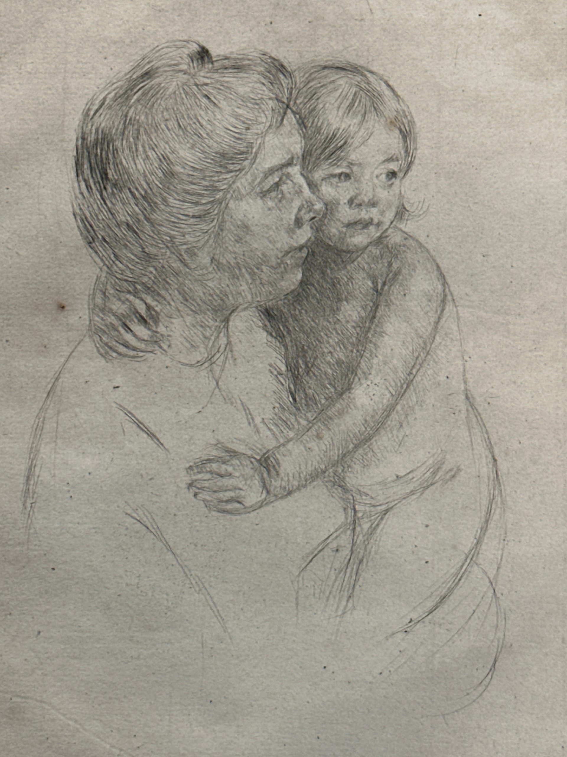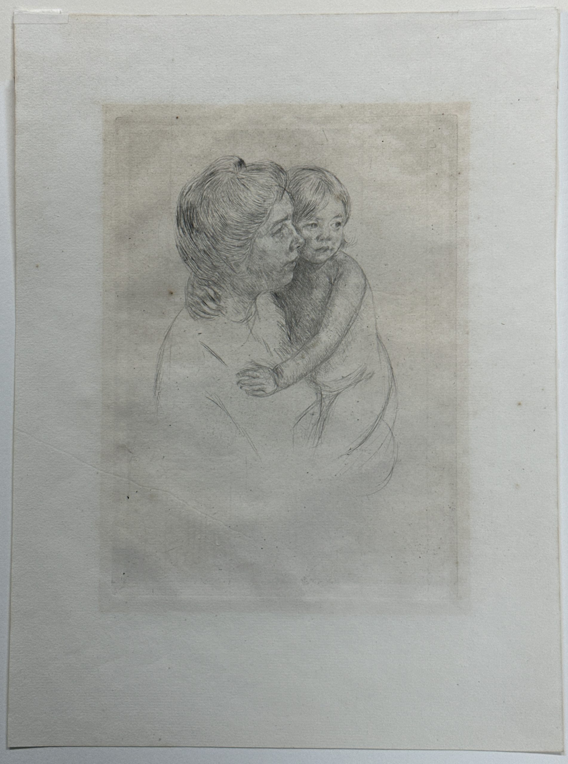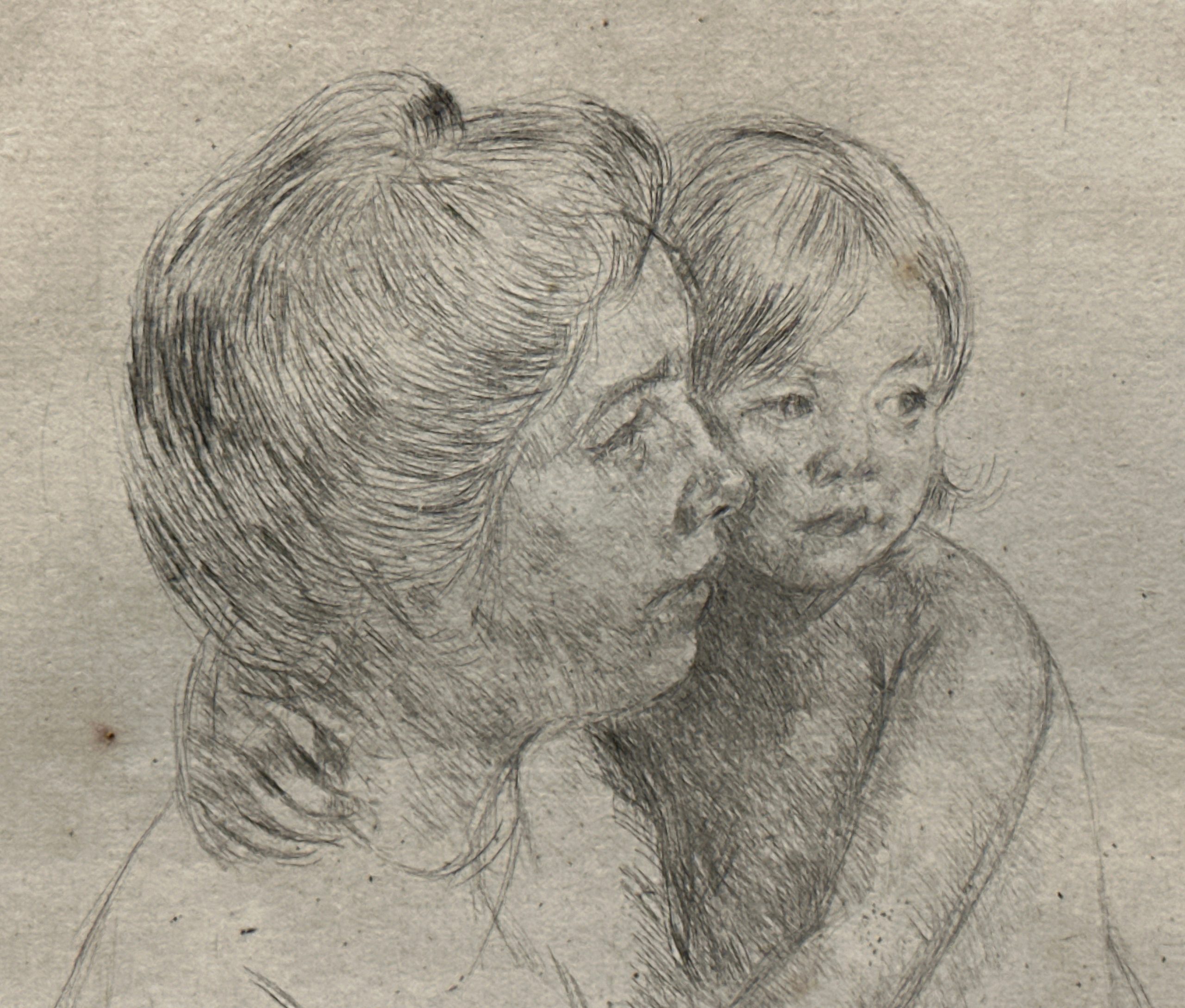 As a printmaker, Cassatt often used drypoint for linear images. She found this technique to encourage the visual minimalism that she admired in Japanese woodblock prints. Throughout her career, the artist focused on compositions centered on women and children, here portraying a model that also appears in a painting in “Denise at Her Dressing Table”, made around the same date as the print.