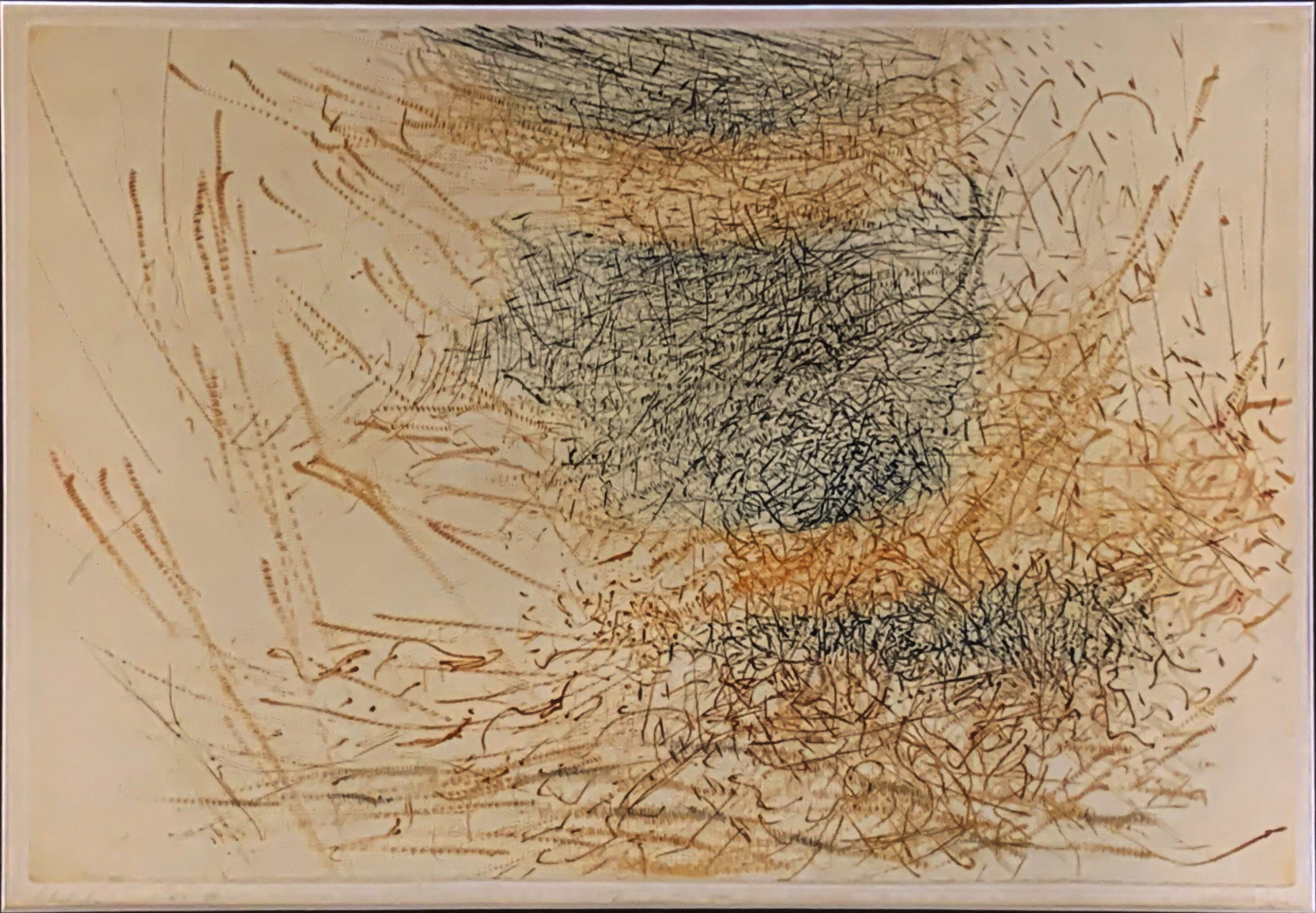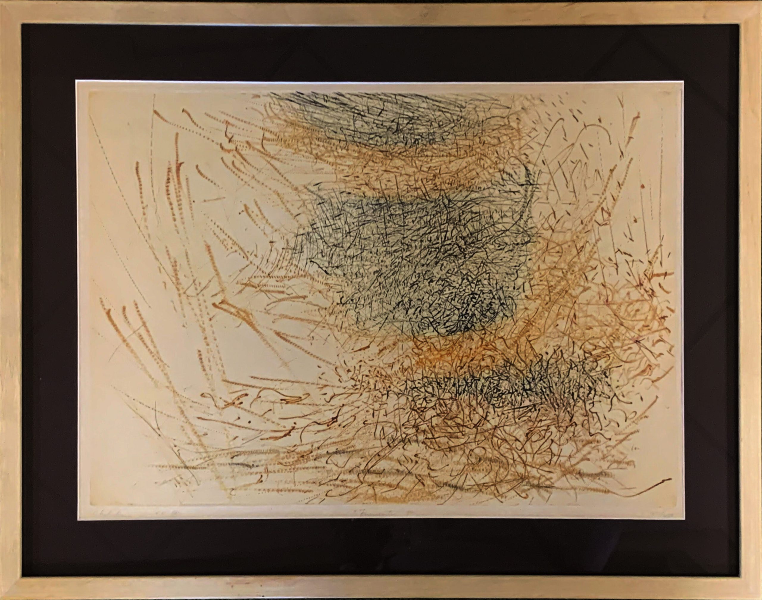 Frumenti is one of the very first prints that Bernard Childs made. He had already made a name for himself as a painter when he went to Paris in about 1952. Late in 1954, Childs spent a month or more studying engraving at Stanley William Hayter’s Atelier 17. It was there that he made Frumenti. (Childs made 200 impressions of Frumenti, which was so exhausting that he vowed to never again make such a large edition!)