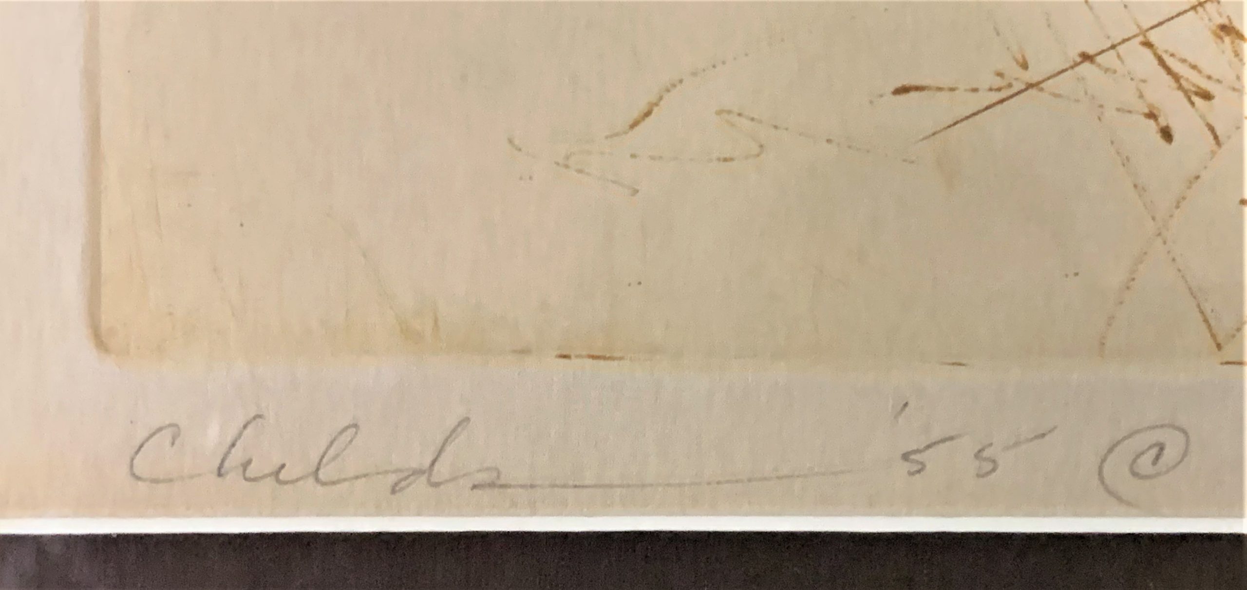Childs’ great contribution to print-making was his innovation of using power tools to engrave the plate. He referred to these prints as “power drypoints”. Though it proved to be a superb tool for Childs, Hayter was less enamored of it. He told Childs that he could not do that engraving at the atelier because it made too much noise. Years later, Judith Childs introduced herself to Hayter at the opening of a Hayter exhibition in New York. Hayter’s immediate response: “Uch! All that noise!”