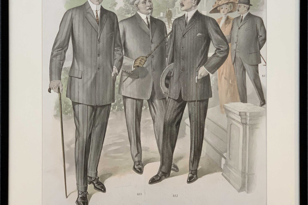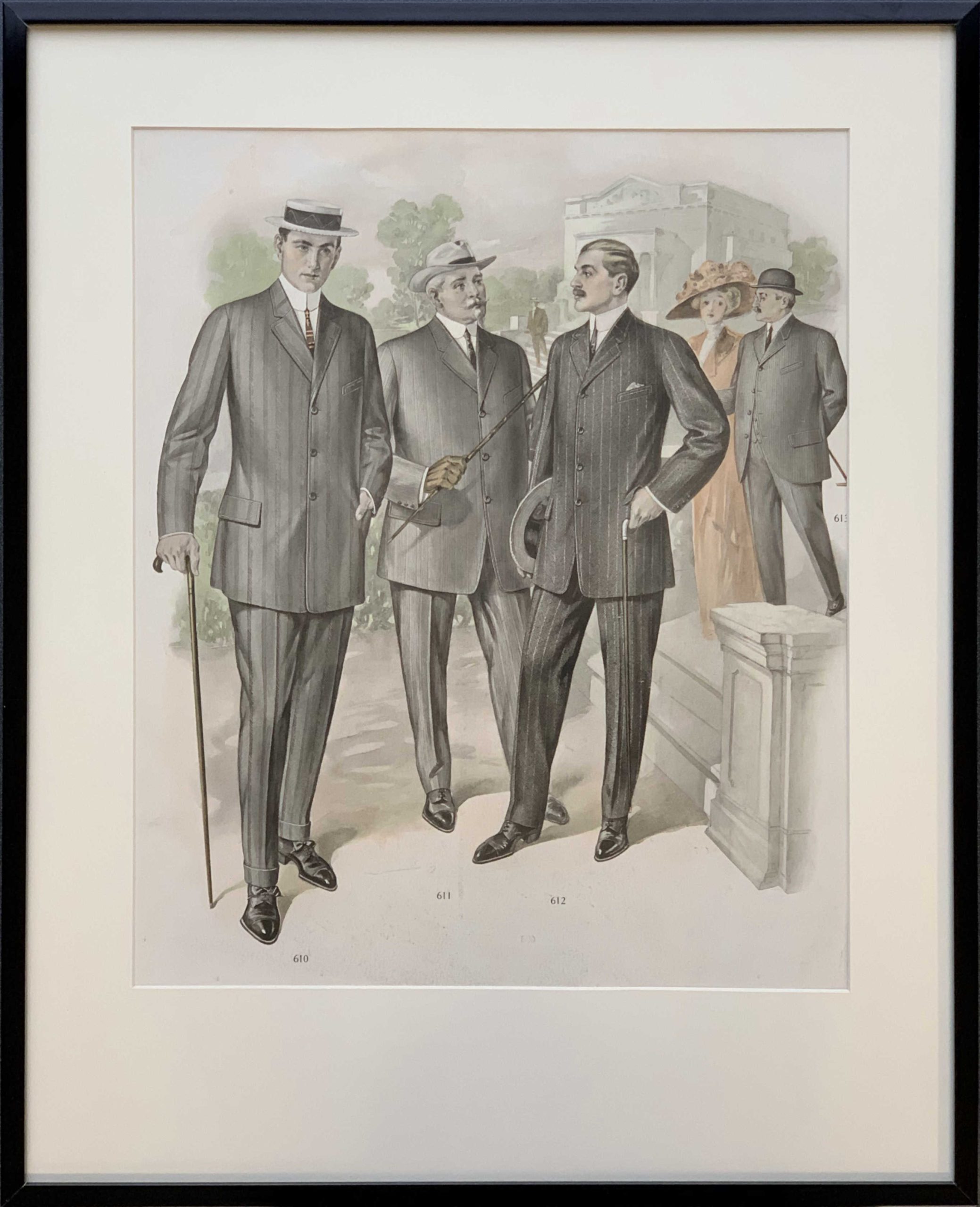 This fine lithograph was included in a beautifully-made portfolio published by the American Art Custom Tailors company. Showing fashions for men from the start of the Twentieth Century, the pictures are romantic depictions of another time. Looked at differently, the pictures have an element of camp. The men in this and the other pictures in the portfolio largely ignore the women in the background; they have eyes only for each other.